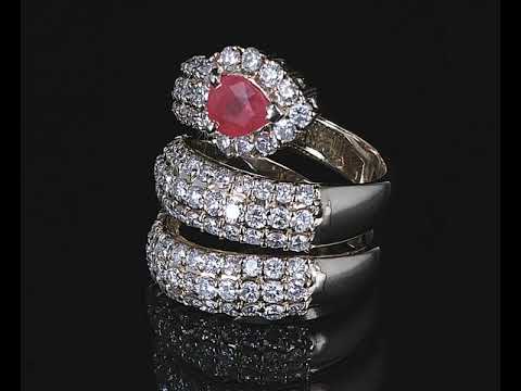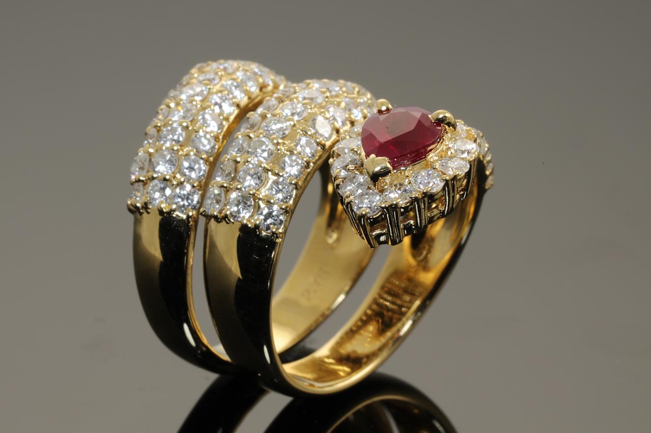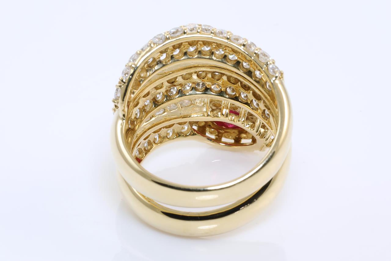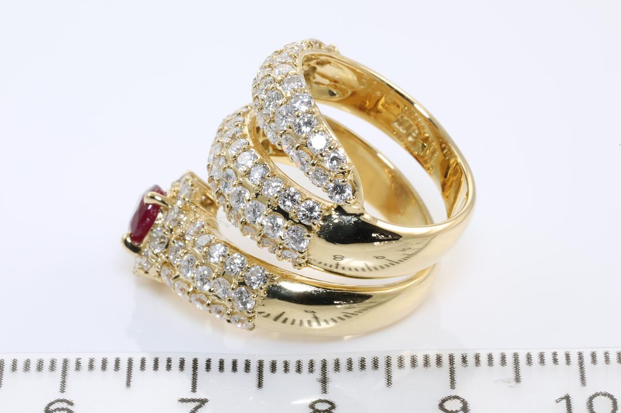 Ruby and Diamond ring with a pear shape Ruby of 1.06ct and Diamonds totalling 2.75cts (Estimated grading: H SI). 18ct yellow gold. Ring size K1/2 - ring resizing is not recommended. Weight: 12.6g. With certificate #414285. (Pre-owned)