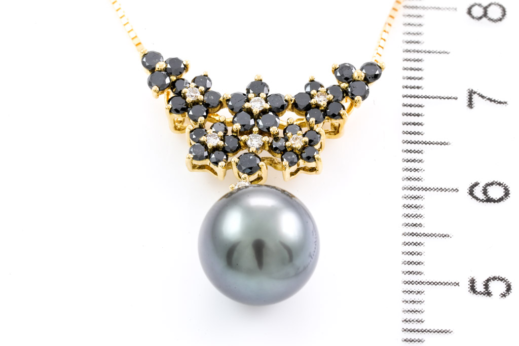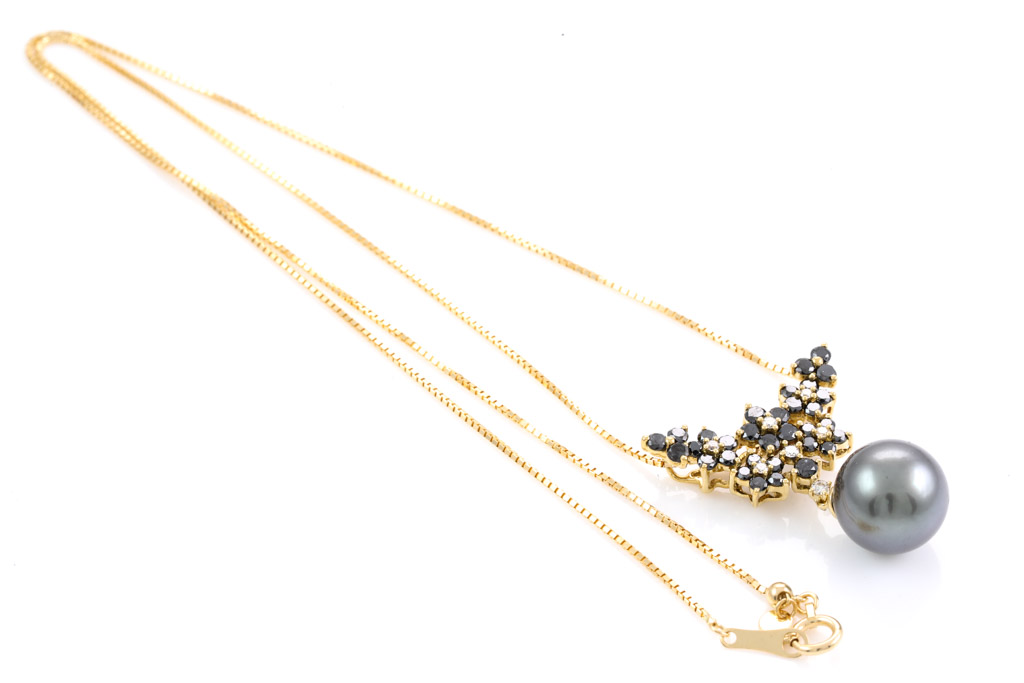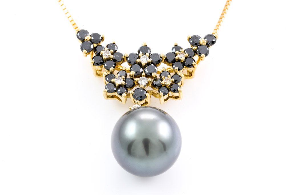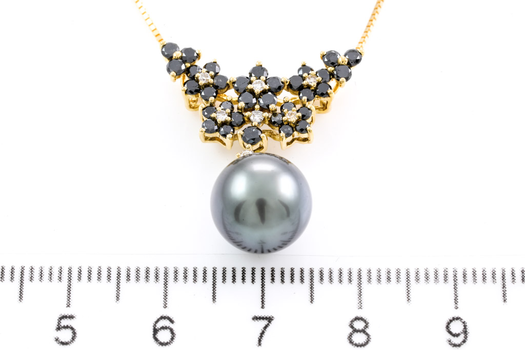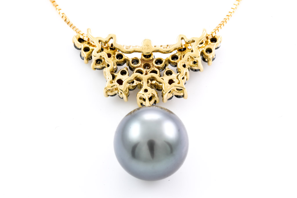 Pearl and Diamond pendant with Tahitian Pearl of 10.6mm and black & colourless Diamonds totalling 0.90cts (Estimated grading for colourless Diamond: I-L SI. Please note: black Diamonds may be treated). 18ct yellow gold with 44cm 18ct yellow gold adjustable chain. Weight: 5.8g. (Pre-owned)
