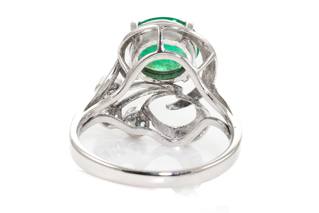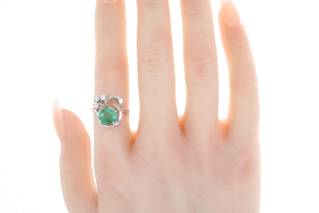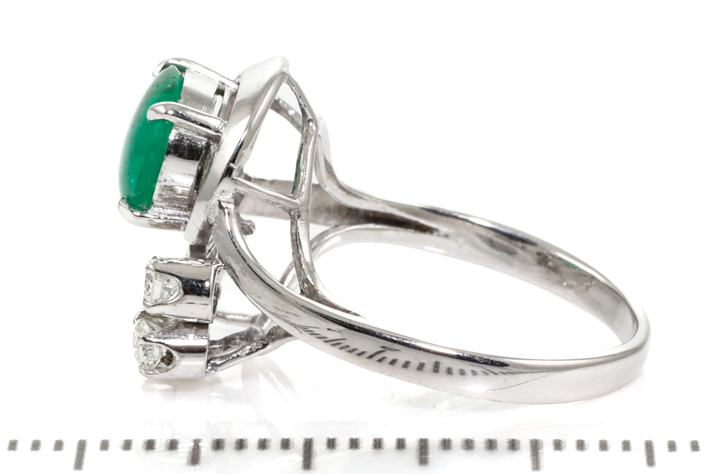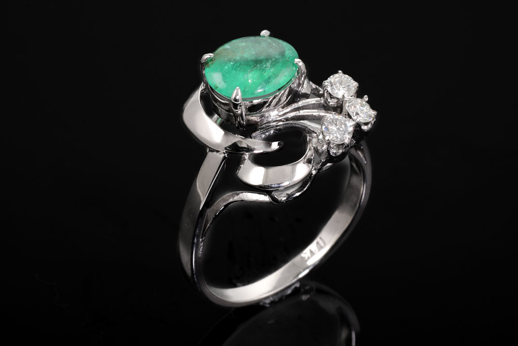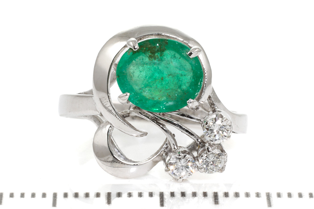 Emerald and Diamond ring with cabochon cut oval shape Emerald of approximate 1.07ct and round Diamond totalling approximate 0.19cts. 18ct white gold. Ring size K1/2. Weight: 3.4g. (Pre-owned)