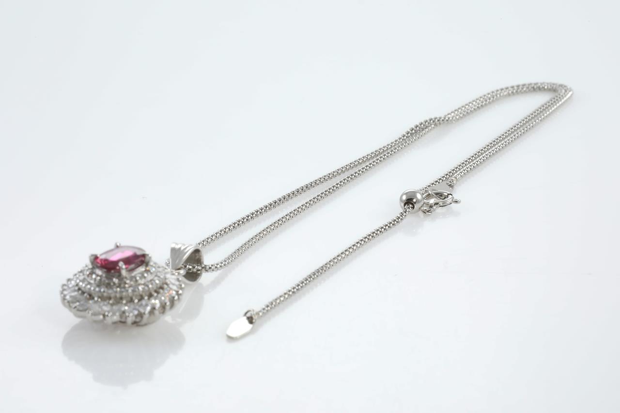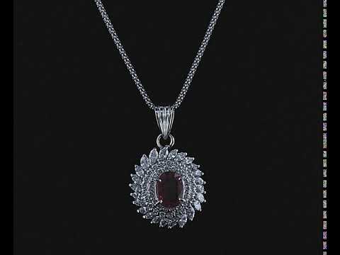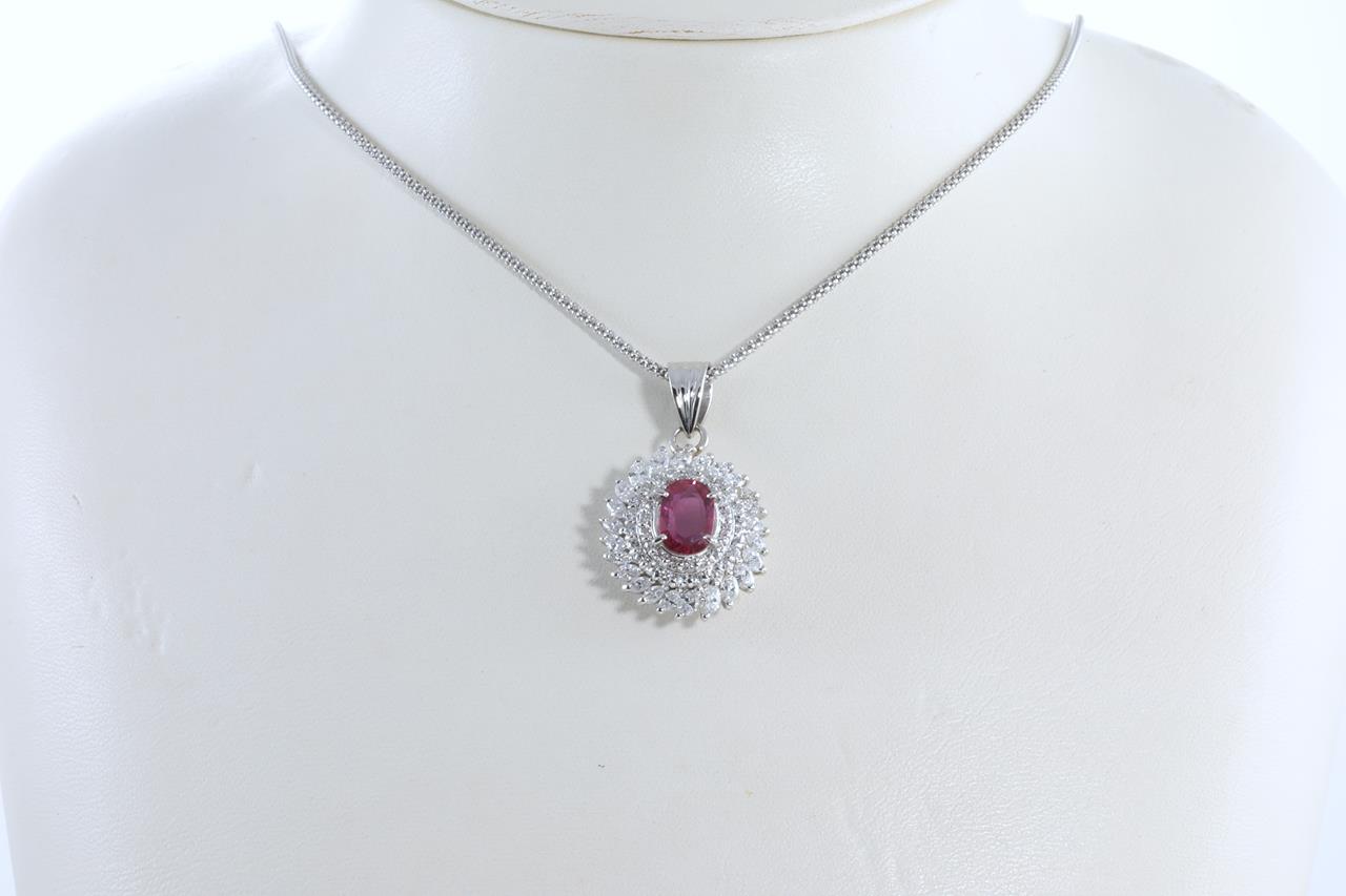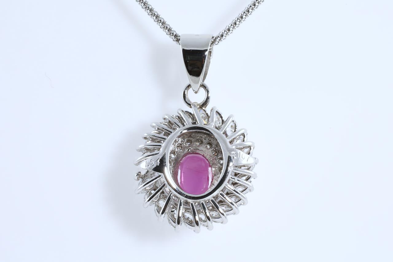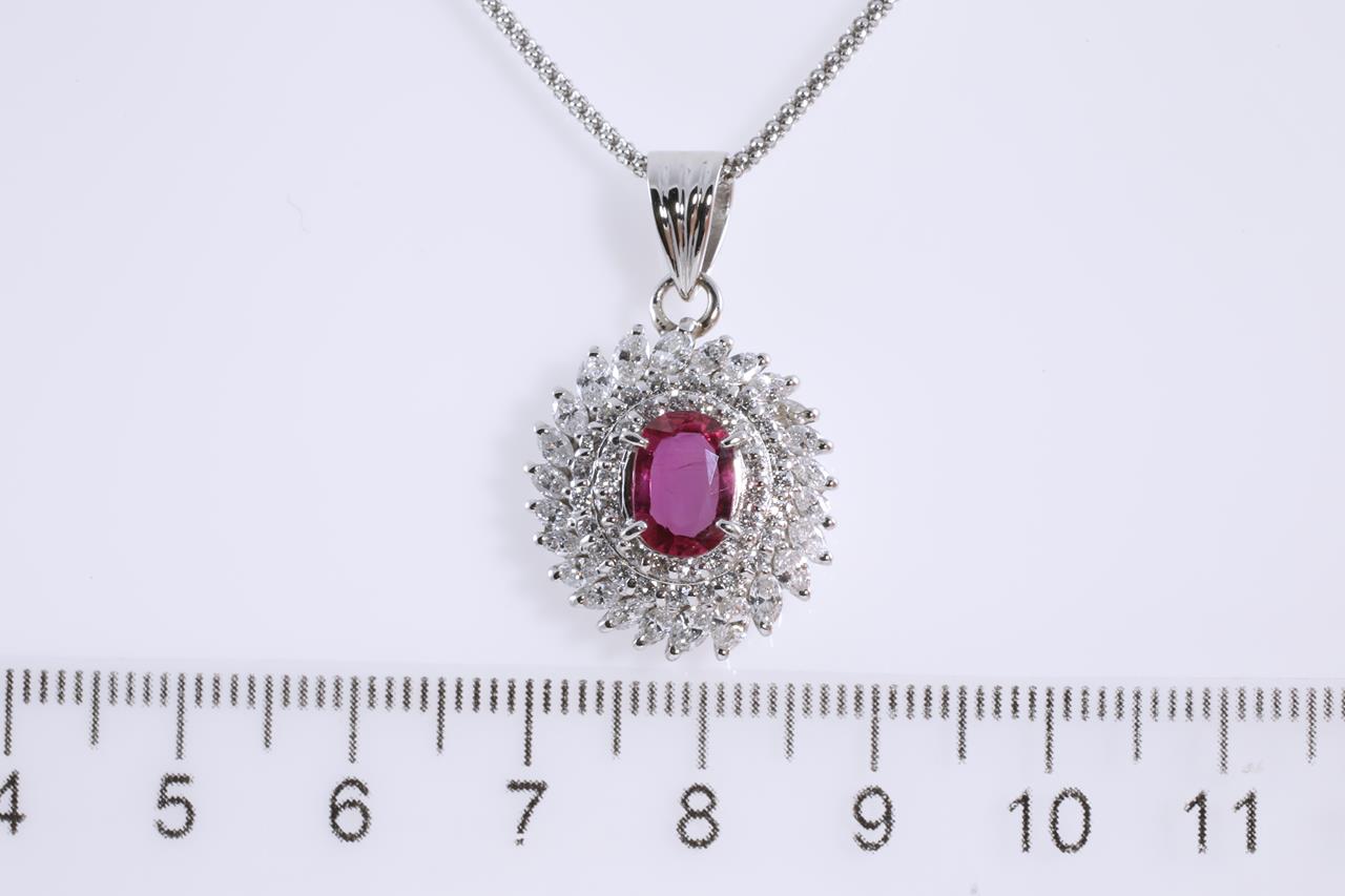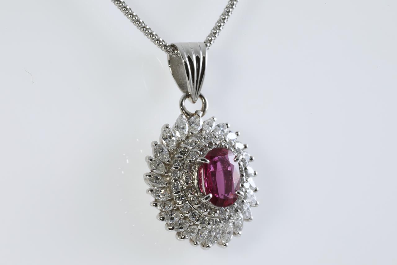 Ruby and Diamond pendant with oval Ruby of 1.07ct with Round and Marquise cut Diamonds totalling 1.64cts (Estimated grading: F-G VS-SI). Platinum with platinum 45cm adjustable chain. Weight:11.1g (Pre-owned)