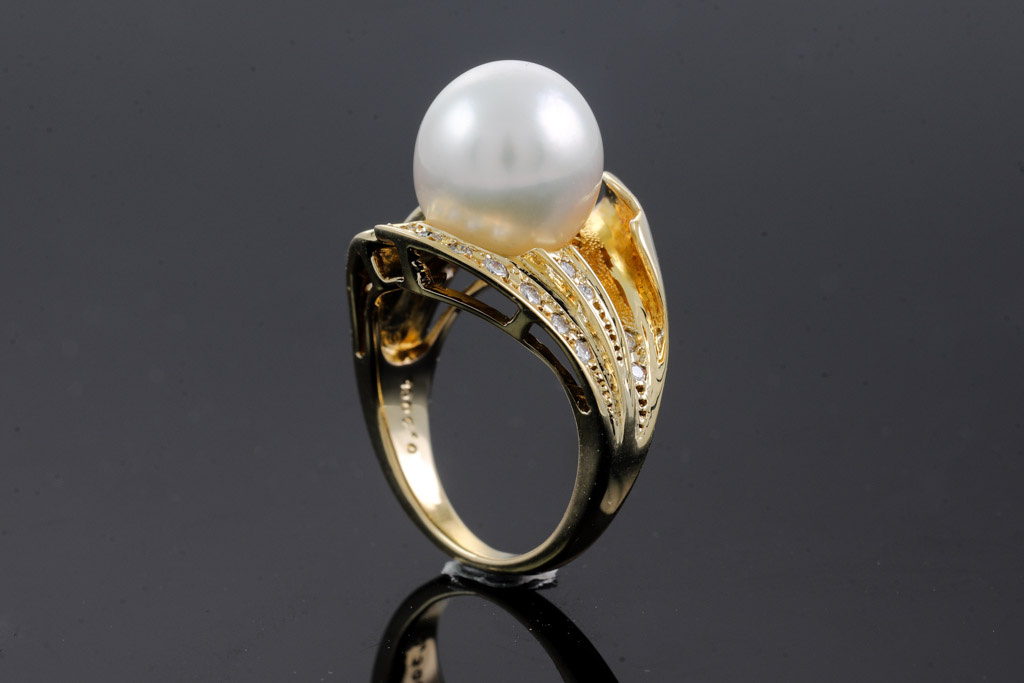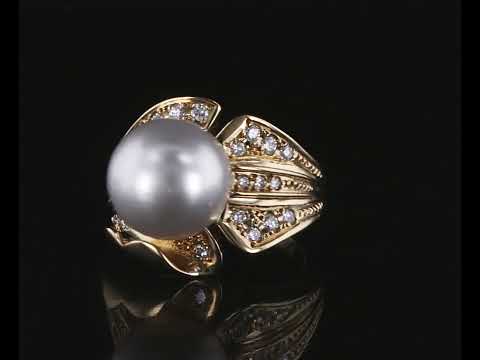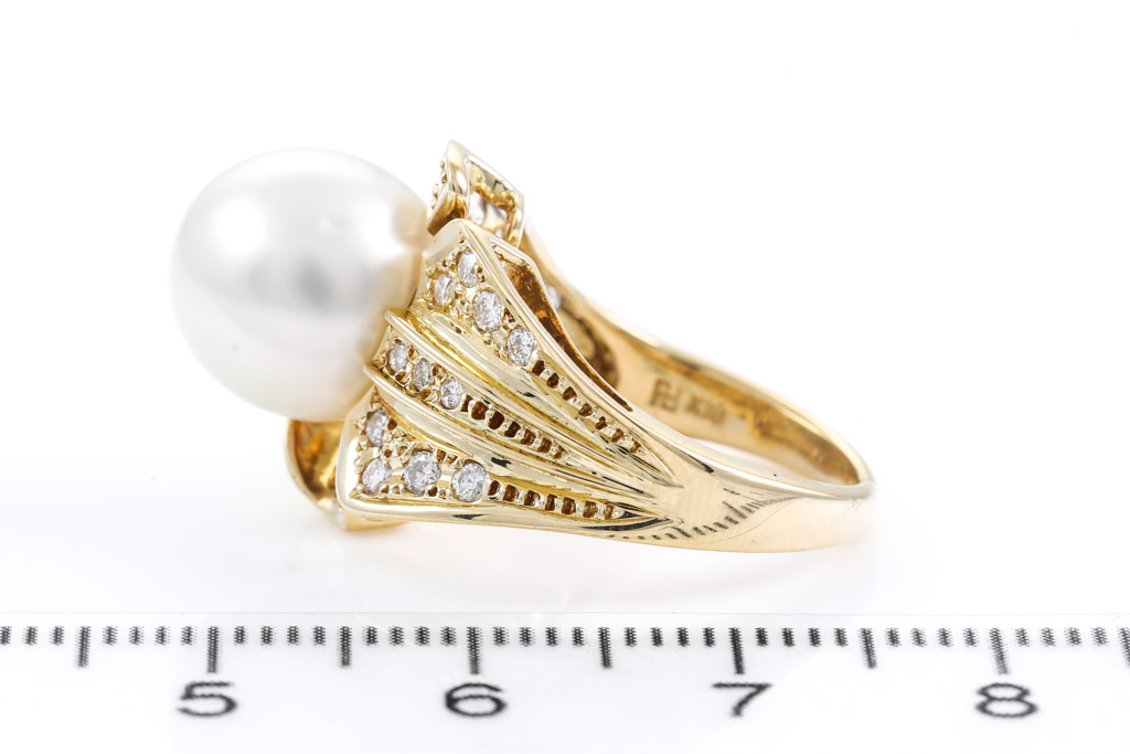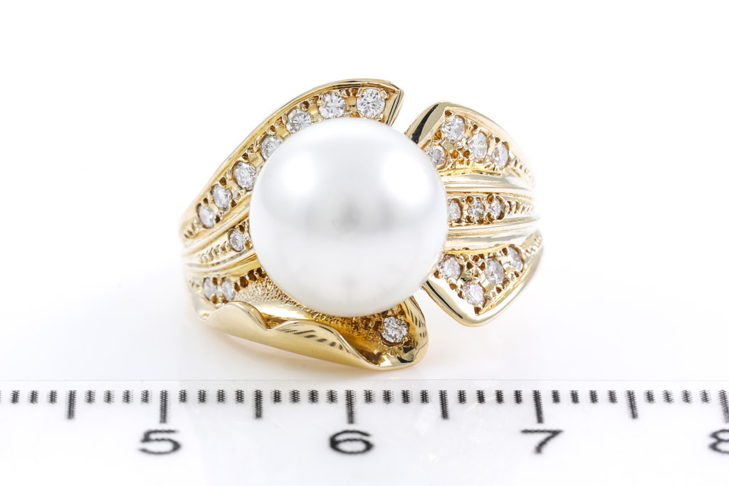 Pearl and Diamond ring with South Sea Pearl of 10.7mm and round Diamonds totalling 0.30cts (Estimated grading: H SI) 18ct yellow gold. Rings size J1/2. Weight: 9.3g. (Pre-owned)