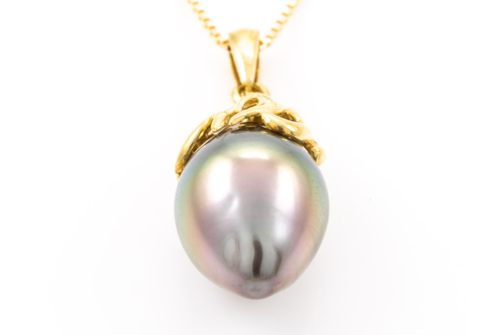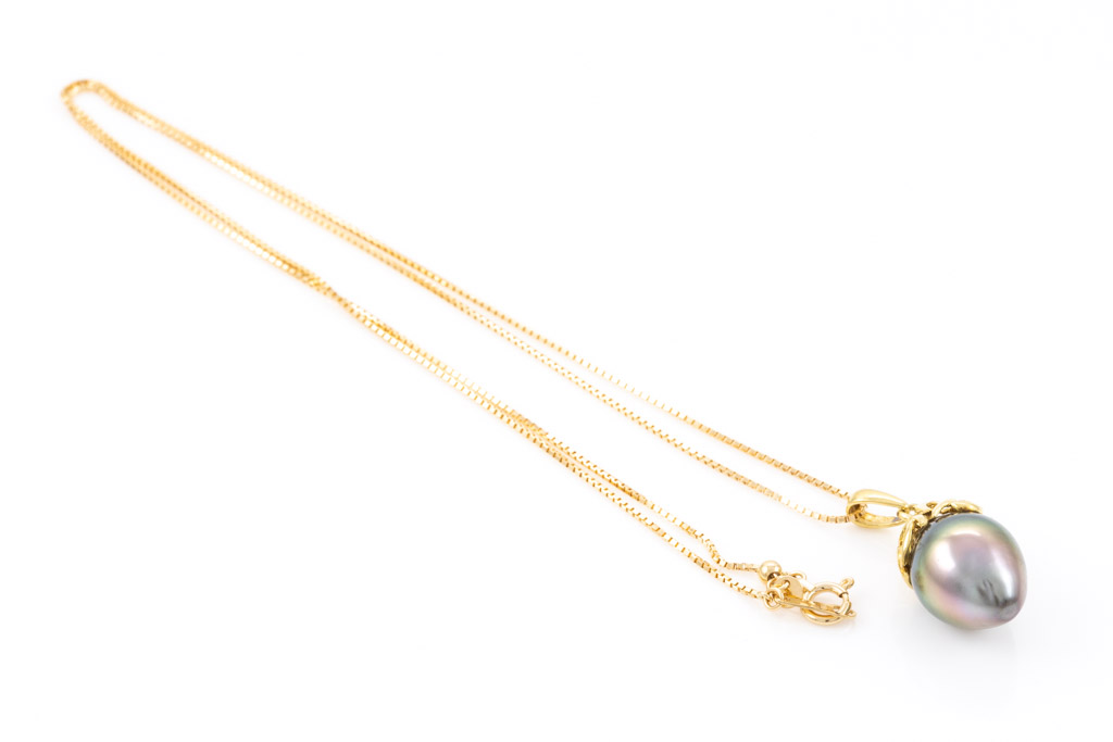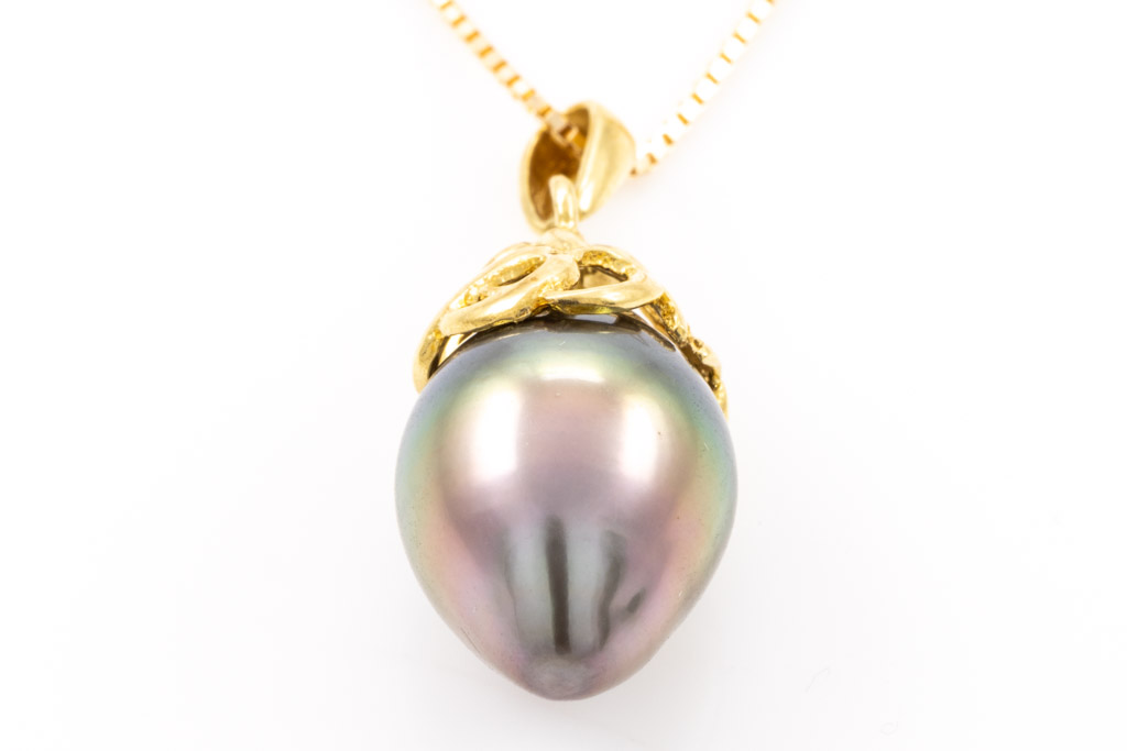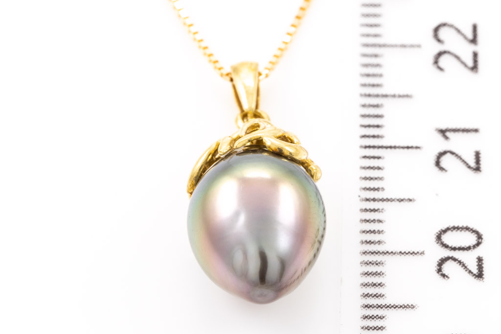 Pearl pendant with drop shaped Tahitian Pearl of 10.7mm. 18ct yellow gold with 44cm 18ct yellow gold adjustable chain. Weight: 5.3g. (Pre-owned)
