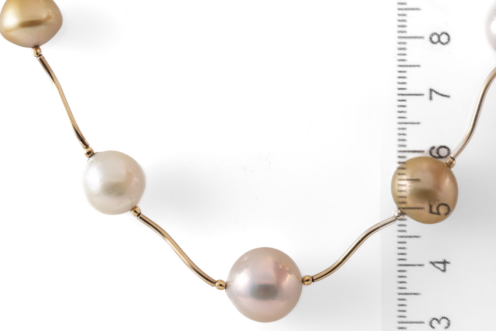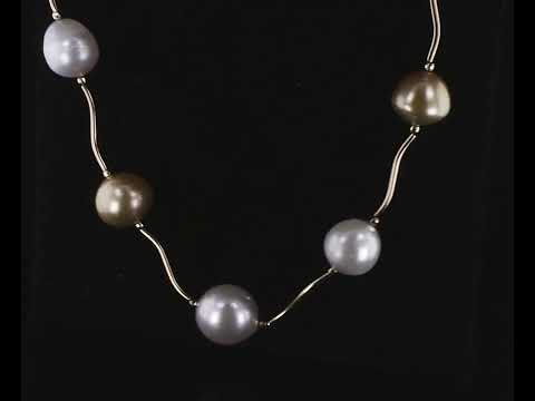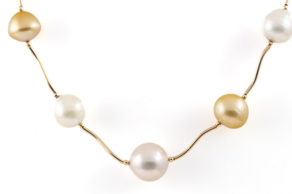 Pearl station necklace with Golden and White South Sea Pearls of 10.8mm - 13.2mm. 14ct yellow gold with 14ct yellow gold ball clasp. Length: 44cm. Weight: 18.5g. (Pre-owned)