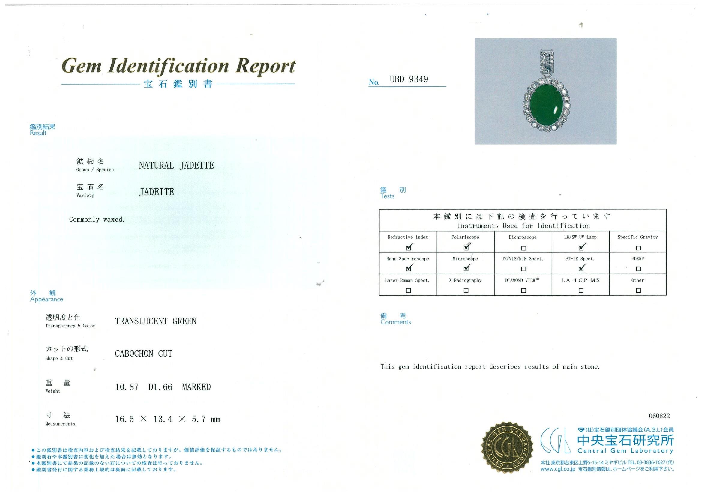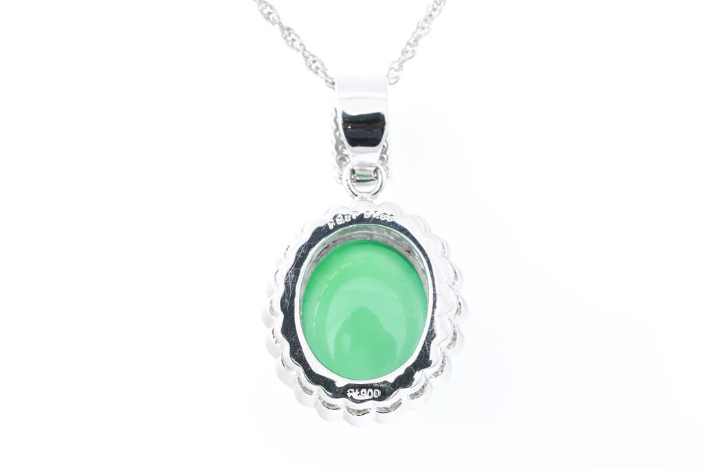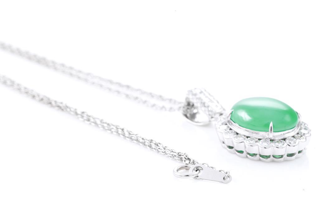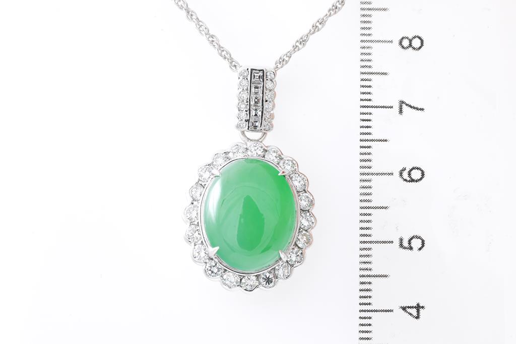 Jade and Diamond pendant with an oval cabochon cut translucent natural Type A Jadeite Jade of 10.87ct and round & carre cut Diamonds totalling 1.66cts (Estimated grading: G-H SI). Paltinum with adjustable 40cm platinum chain. Weight: 15g. With Gem Identification Report #UBD 9349. (Pre-owned)