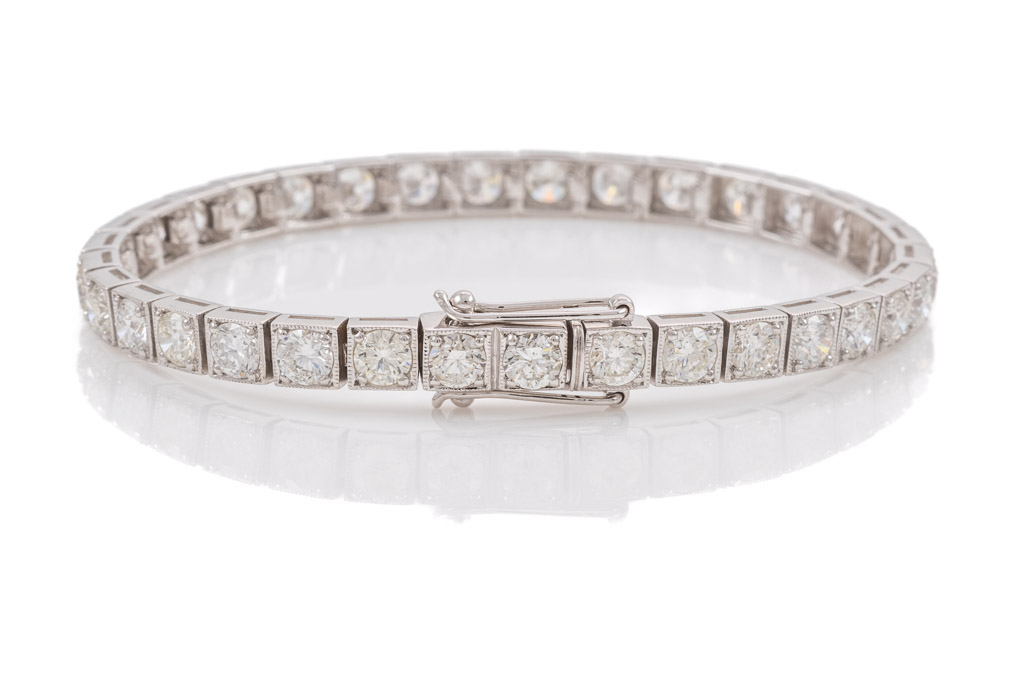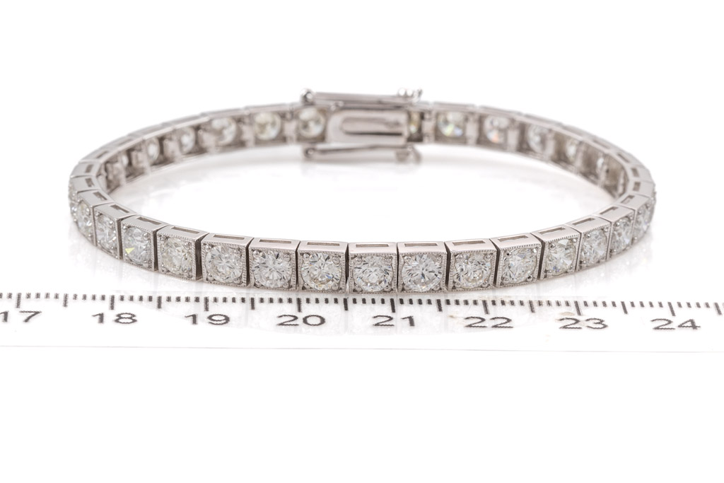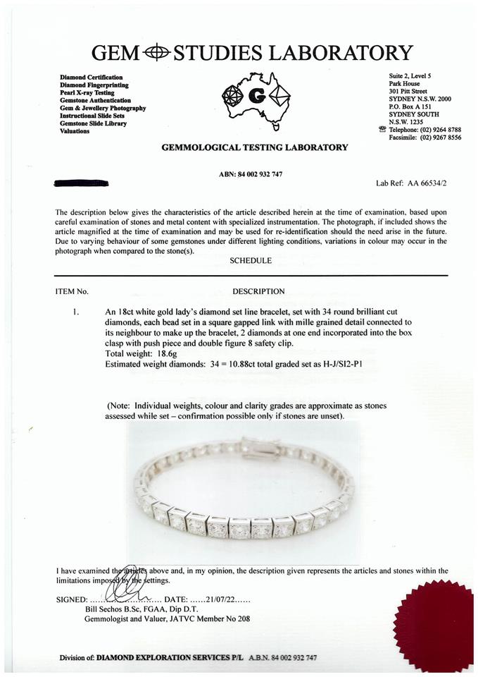 Diamond tennis bracelet with 34 round brilliant cut Diamonds totalling 10.88cts (with GSL Description report graded as H-J SI2-P1 #AA 66534/2). 18ct white gold. Length: 18cm, weight: 18.6g. (Pre-owned)