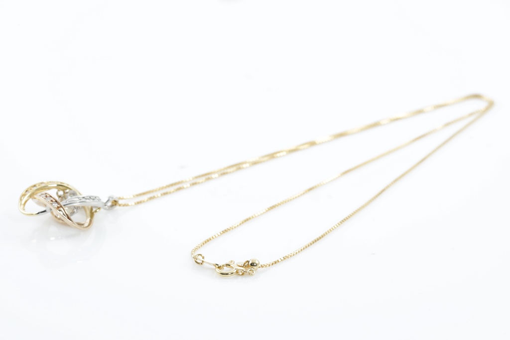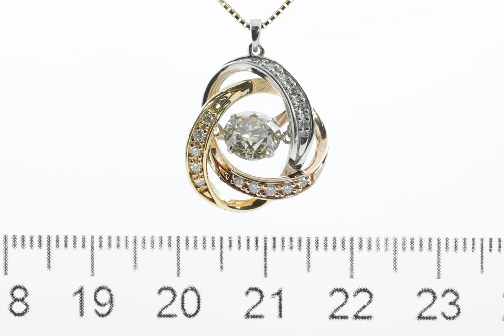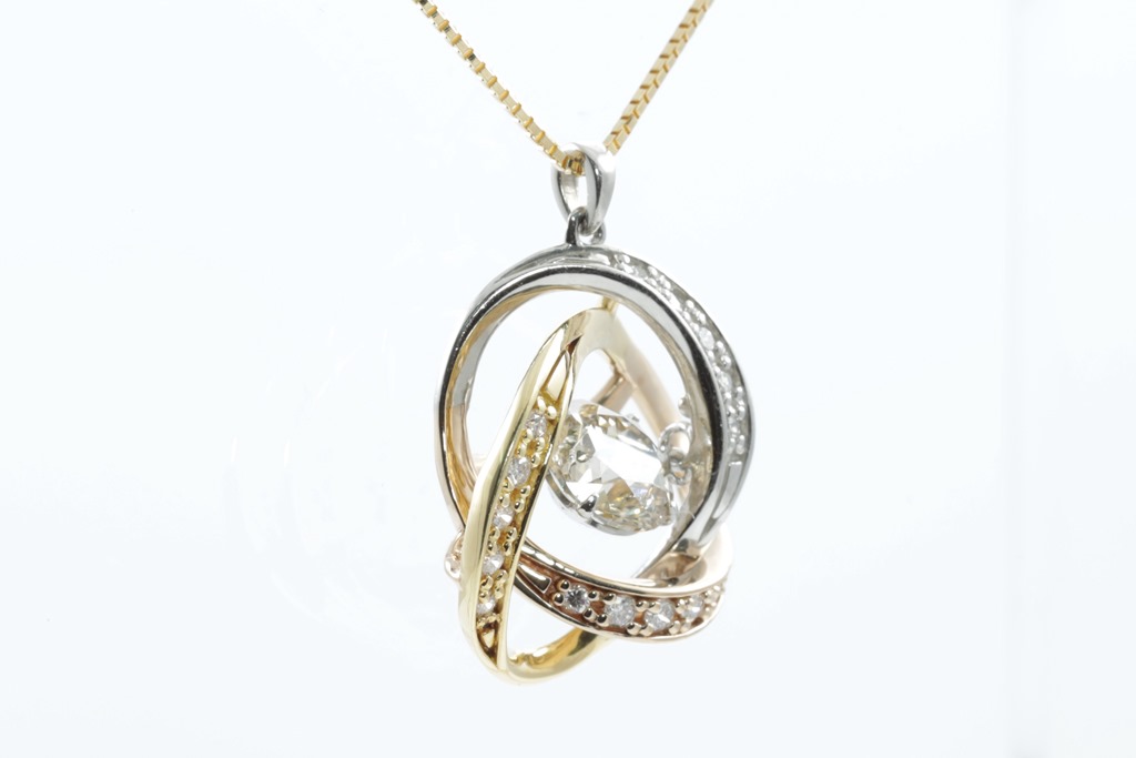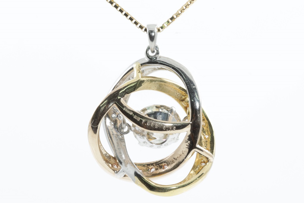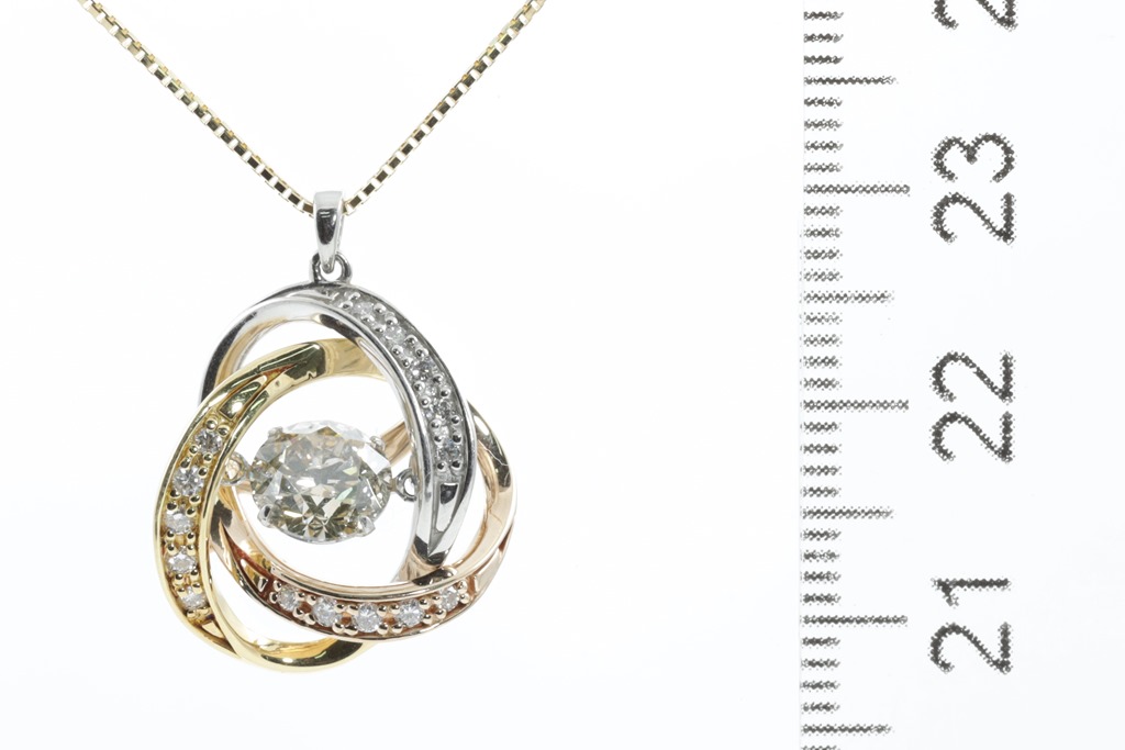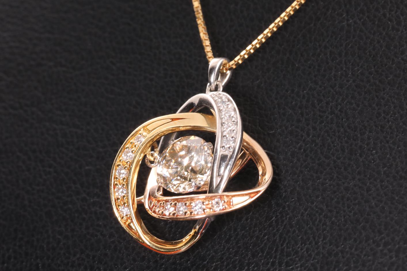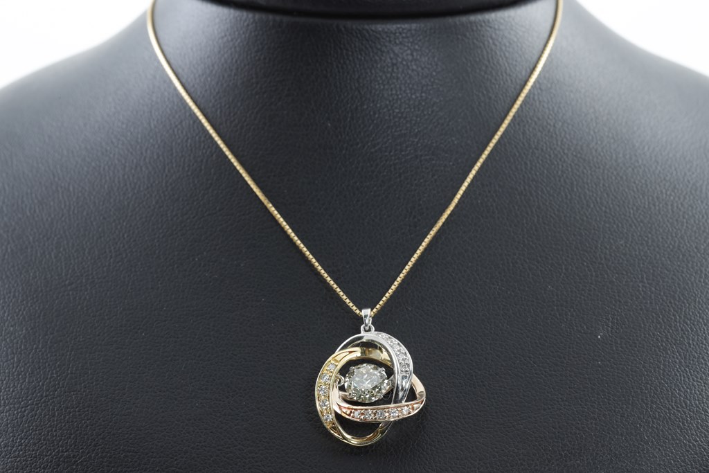 Diamond pendant with centre round brilliant cut Diamonds of 1.08ct (Estimated grading: light Champagne P1) and surrounding round Diamonds totalling 0.016cts . 18ct yellow gold, rose gold and platinum. With 18ct yellow gold 45cm adjustable chain. Weight: 5.3g. (Pre-owned)