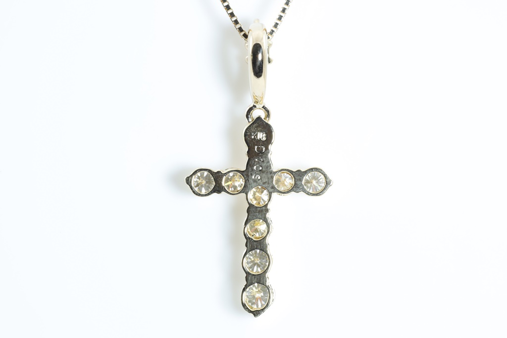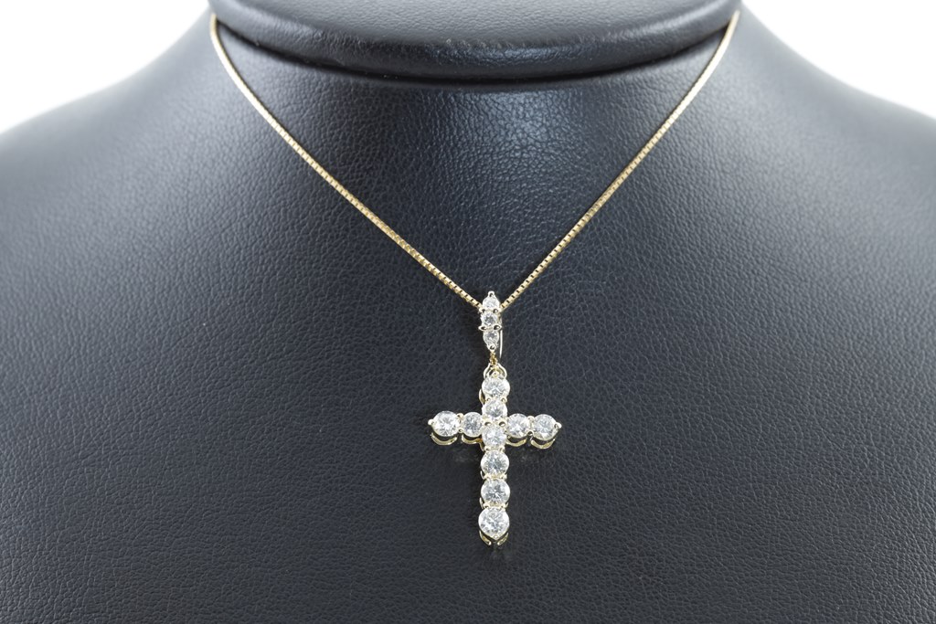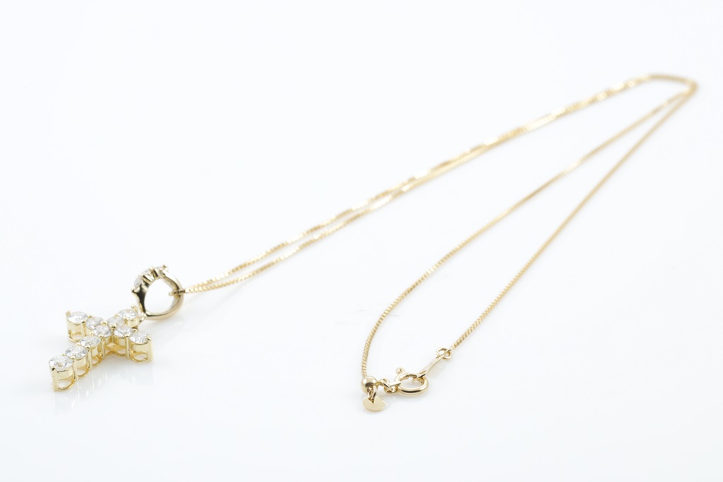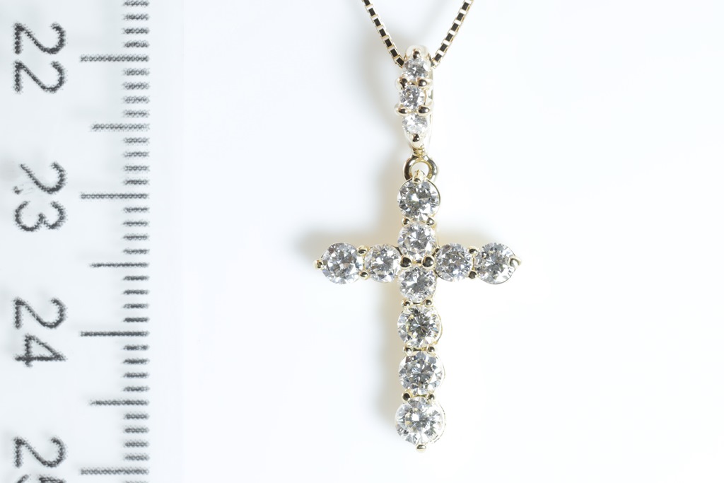 Diamond cross pendant with round Diamonds totalling 1.08cts (Estimated grading: G-H SI). 18ct yellow gold with adjustable 44cm chain. Weight: 4.2g. (Pre-owned)
