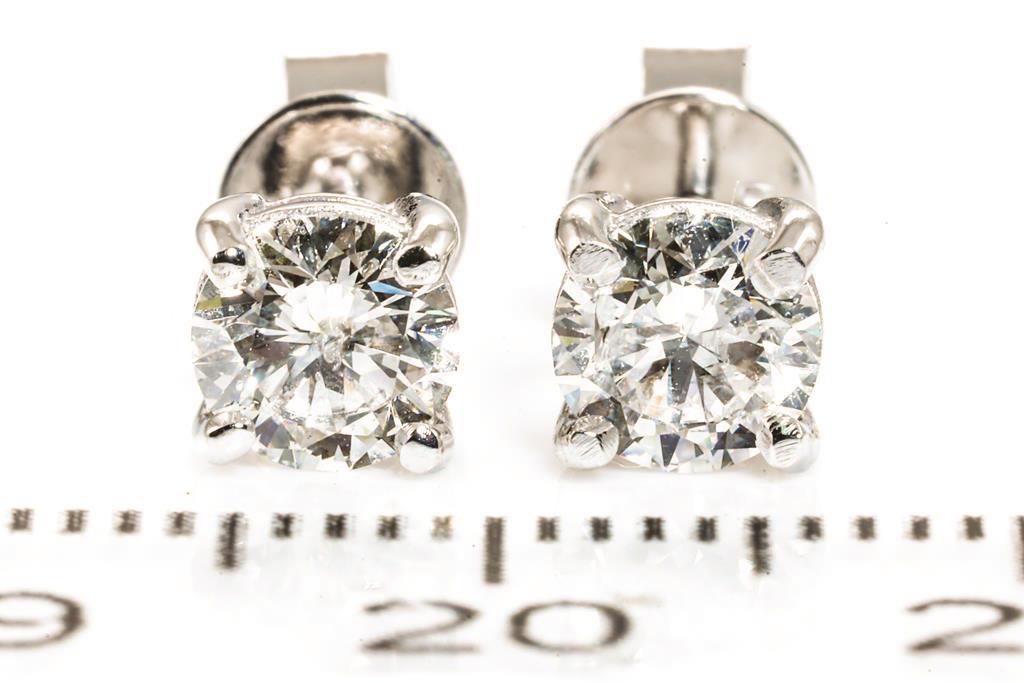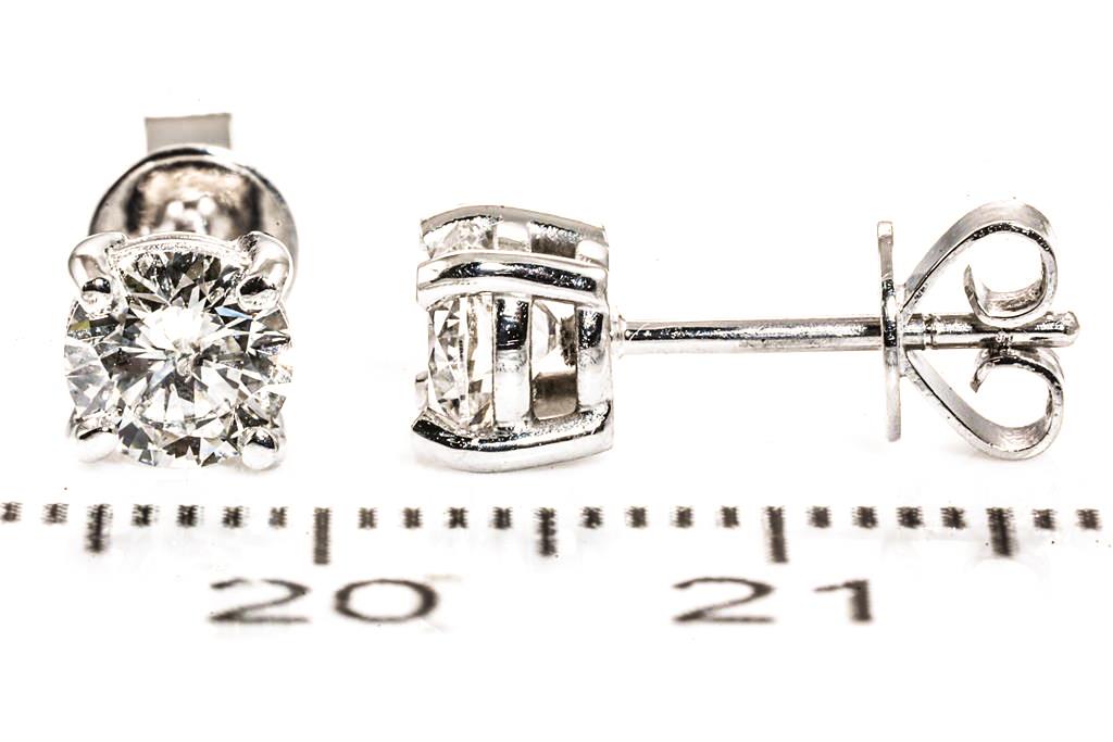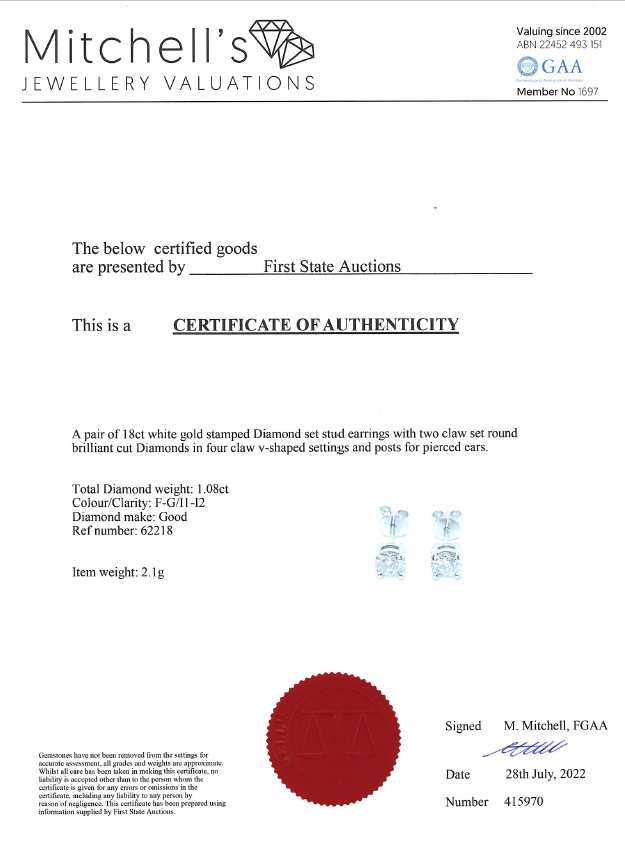 Diamond stud earrings with 2 round brilliant cut Diamonds totalling 1.08cts (Estimated grading: F-G P1-P2). 18ct white gold. Weight: 2.1g. With certificate #415970 (New).