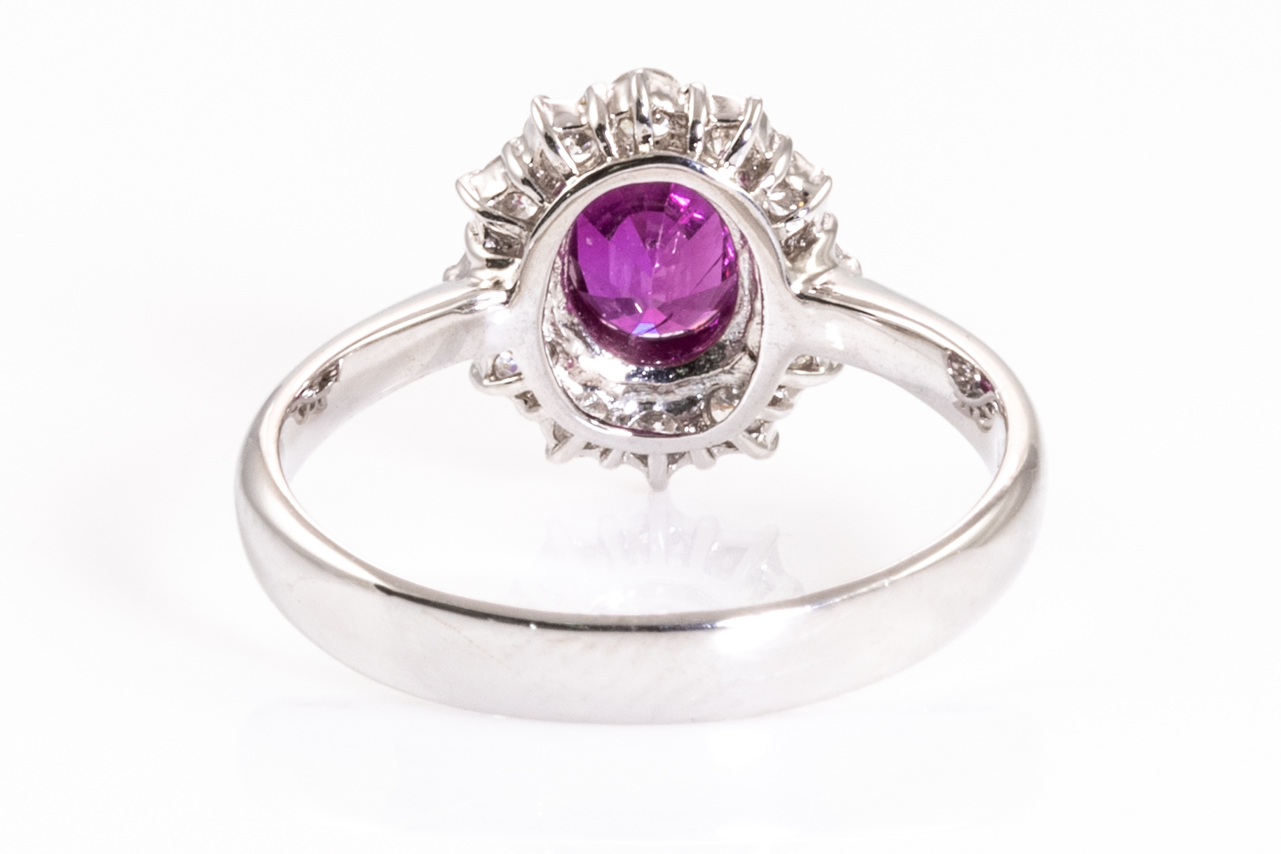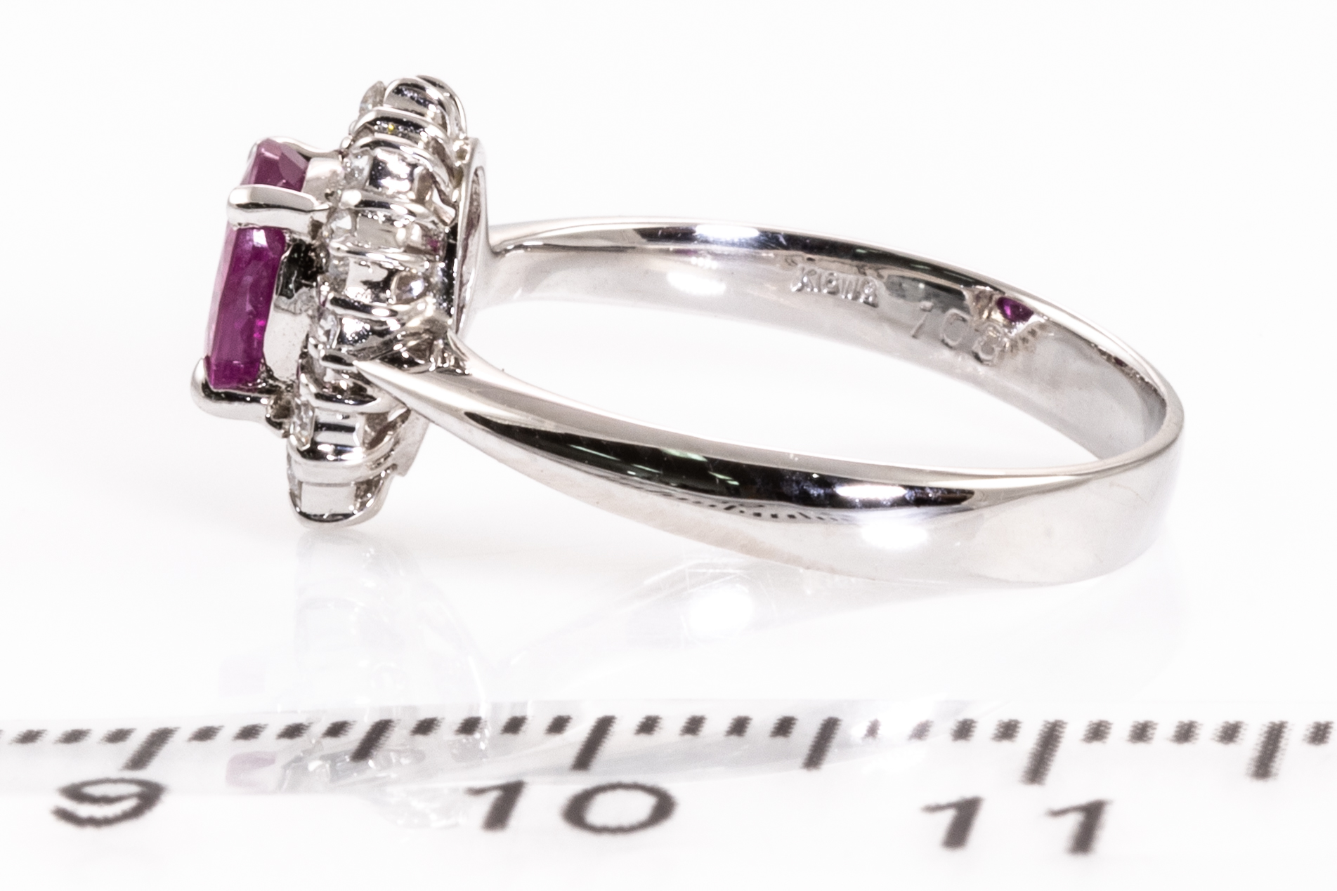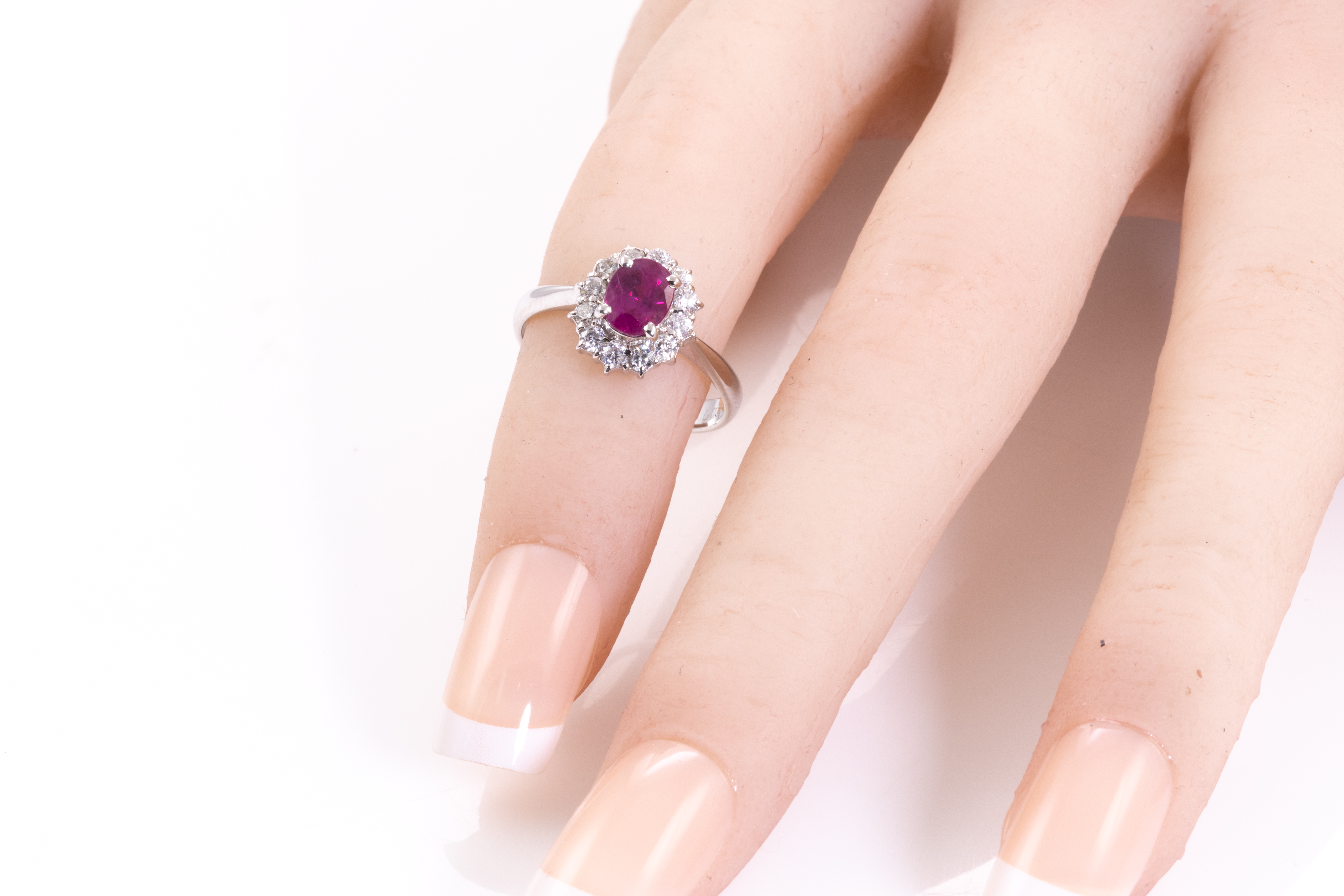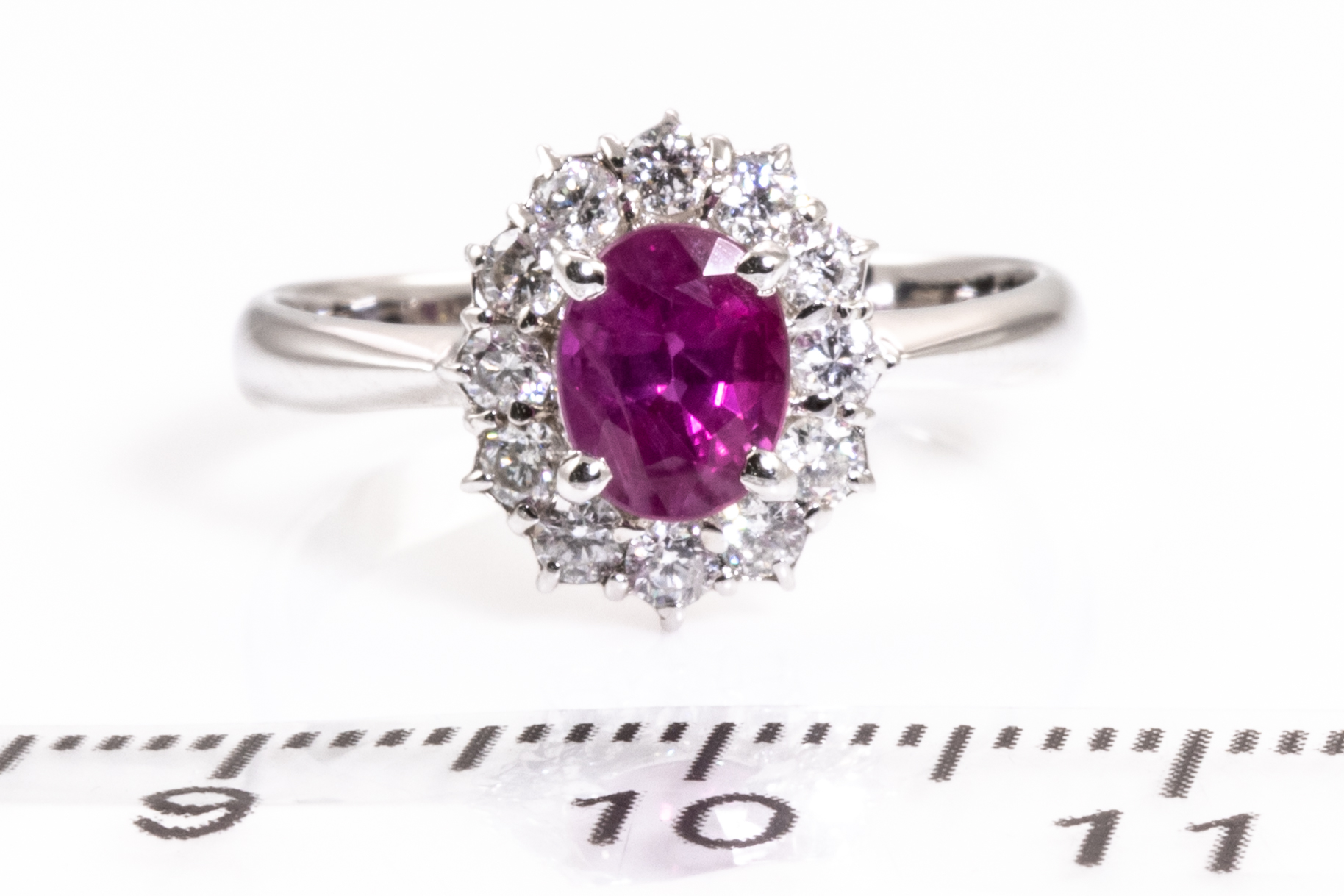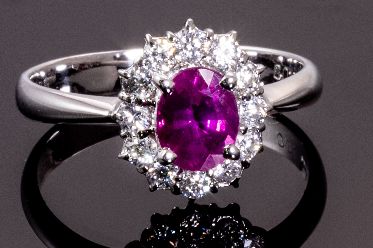 Ruby and Diamond ring with an oval shape Ruby of 1.08ct and round Diamonds totalling 0.37cts (Estimated grading: F-G SI). 18ct white gold. Ring size L. Weight: 3.0g. (Pre-owned)