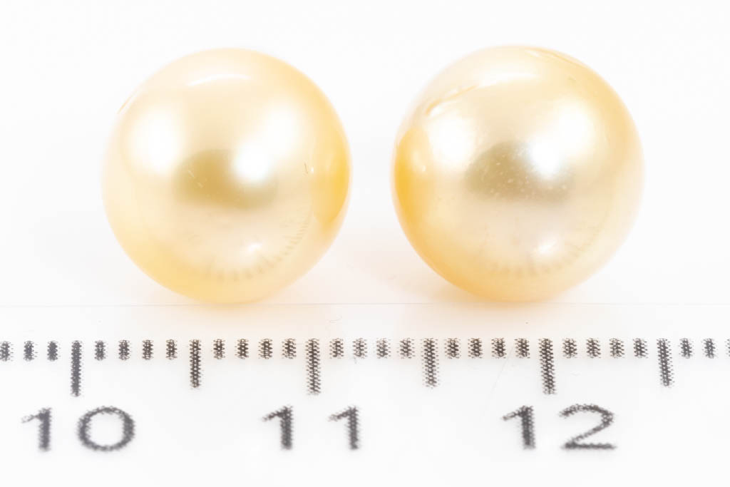 Pearl stud earrings with Golden South Sea Pearls of 11.0mm & 10.8mm. 10ct yellow gold with silicon backs. Weight: 4.1g. (Pre-owned)