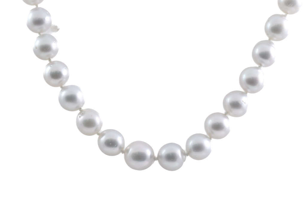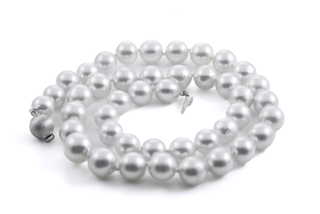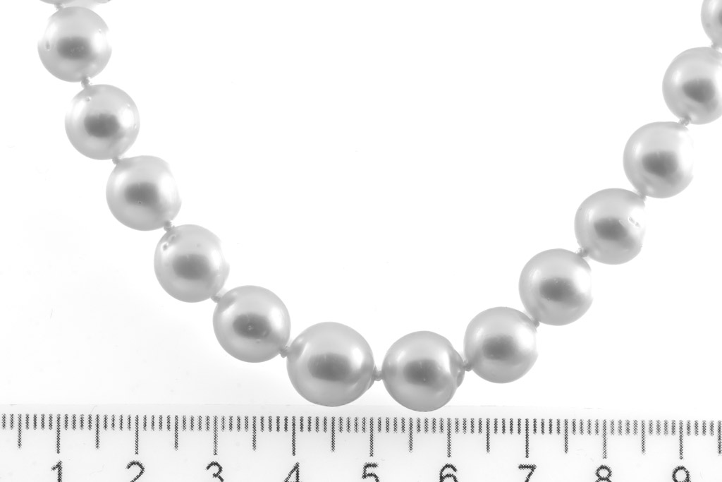 Pearl necklace with South Sea Pearls (silver tone) of 10.8mm-8.8mm. 14ct white gold 9mm ball clasp. Length: 47cm. Weight: 54.4g. (Pre-owned)