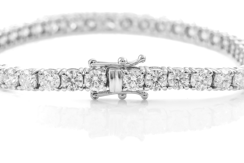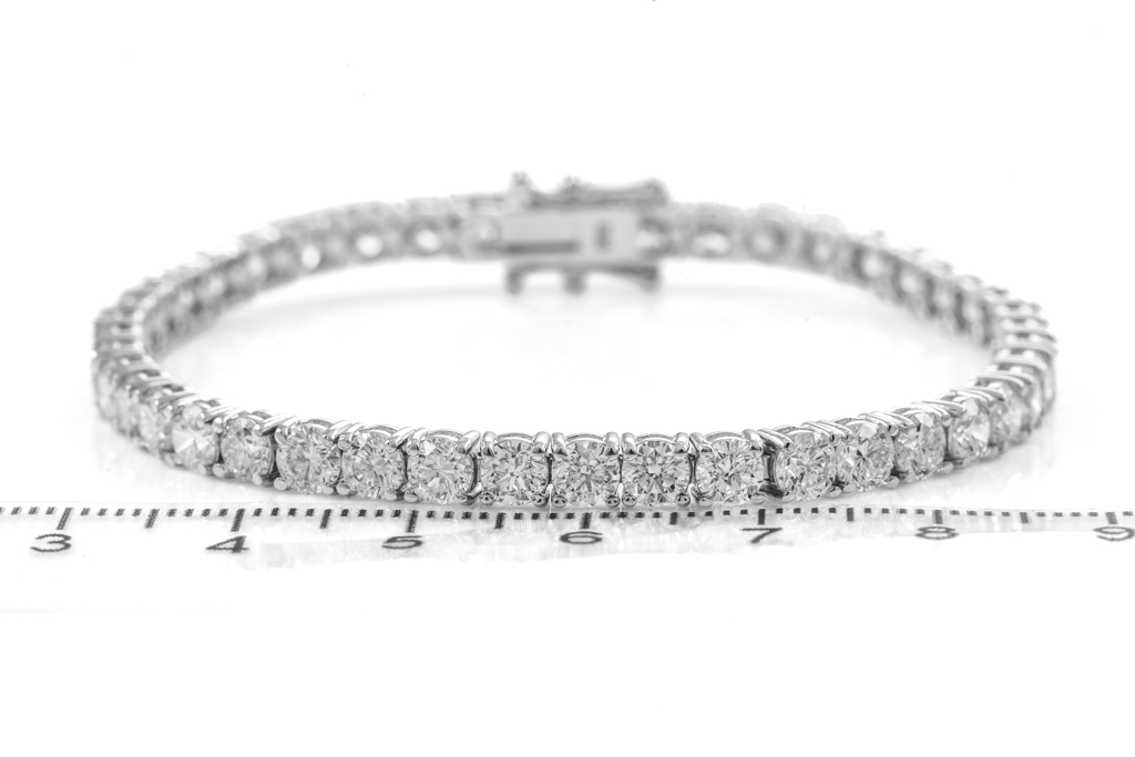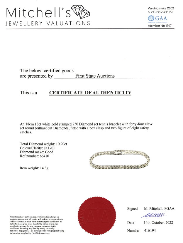 Diamond tennis bracelet with 44 round Diamonds totalling 10.90cts. (Estimated grading: J-L SI). 18ct white gold. Length: 18cm. Weight: 14.3g. With Certificate #416194. (New)