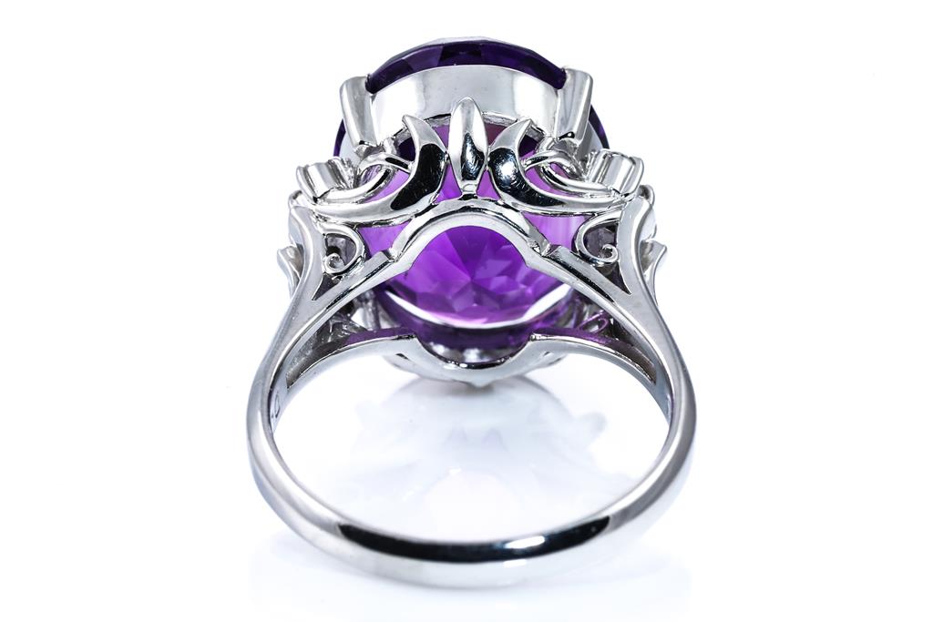 Amethyst and Diamond ring with oval shape Amethyst 10.91ct (note very minor surface wear on stone) and Diamonds totalling 0.013ct. Platinum. Ring size O. Weight: 10.3g. (Pre-owned)