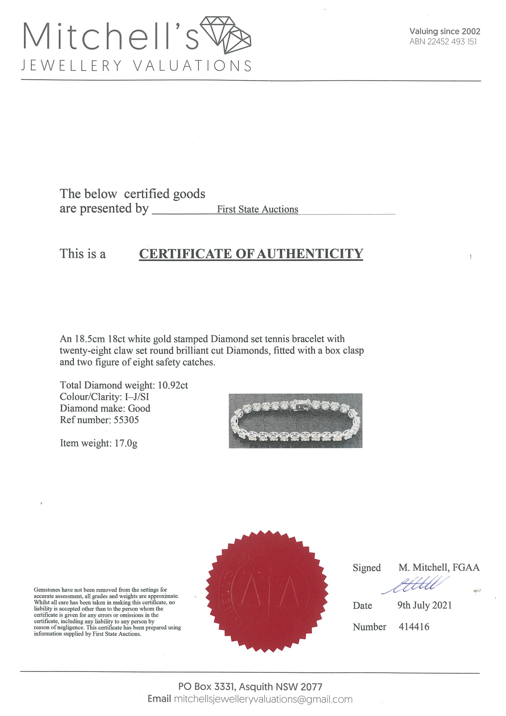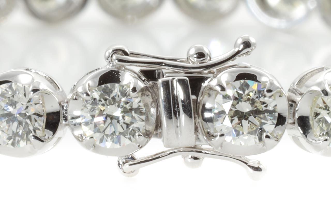 Diamond tennis bracelet with 28 round Diamonds totalling 10.92cts (Estimated grading: I-J SI). 18ct white gold. Length: 18.5cm. Weight: 17g. With certificate #414416. (New)