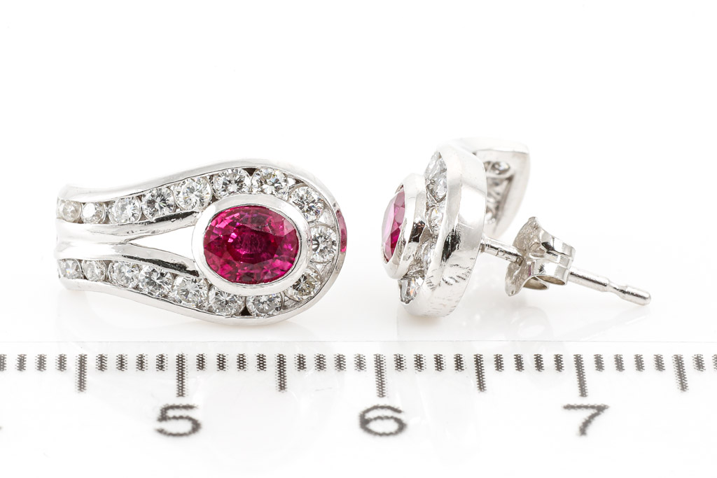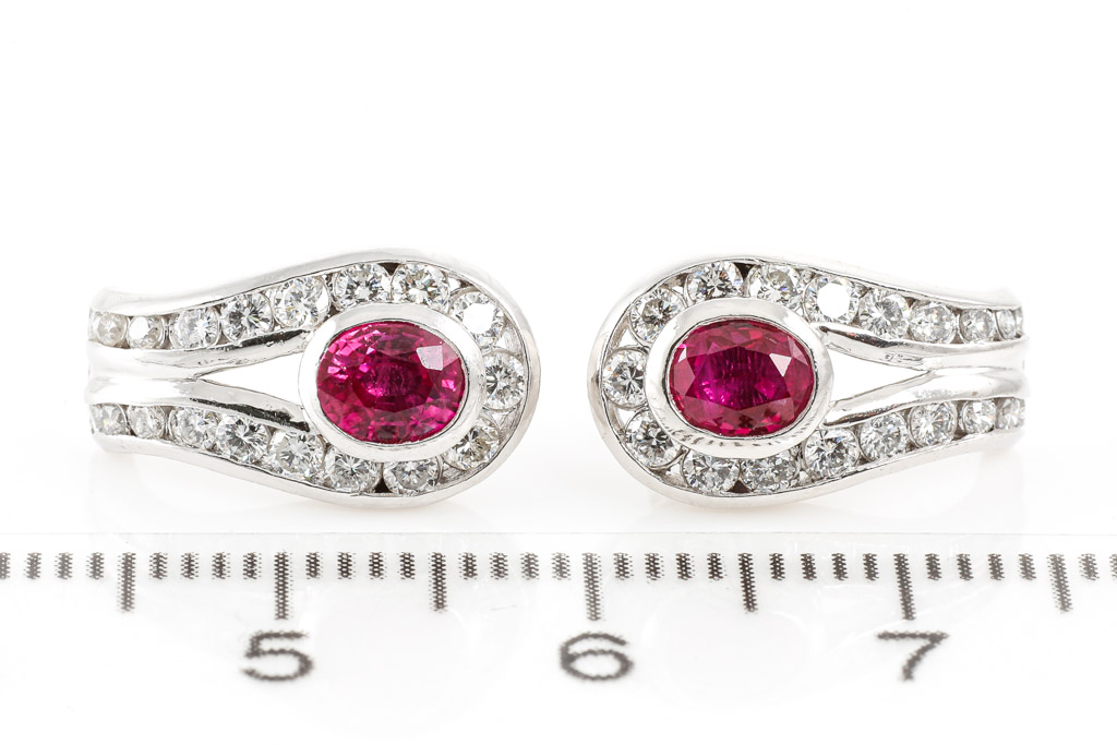 Ruby and Diamond earrings with oval shape Rubies totalling 1.09cts and Diamonds totalling 0.74cts (Estimated grading H-I SI). Platinum-900. Weight: 5.7g. (Pre-owned)