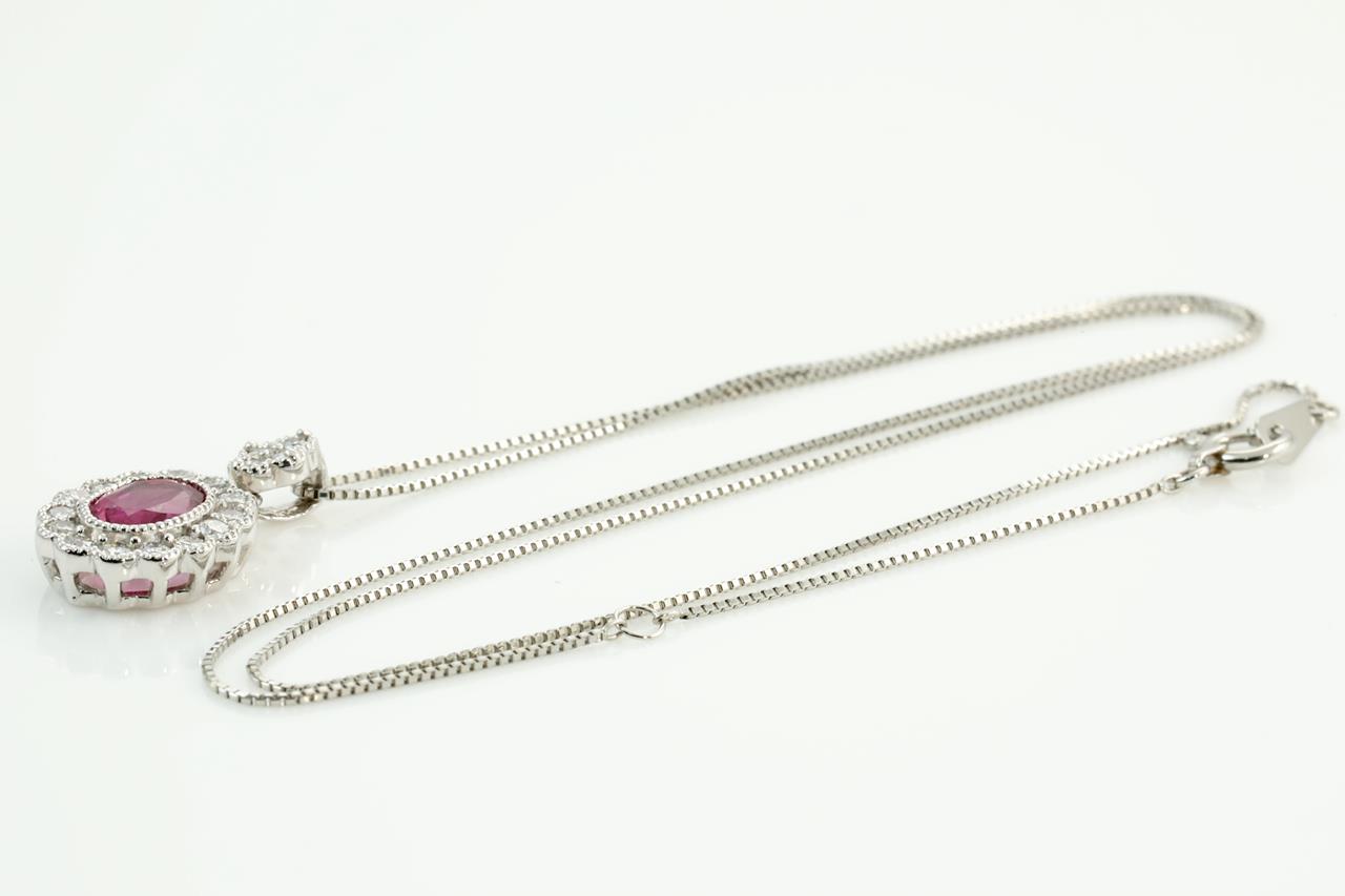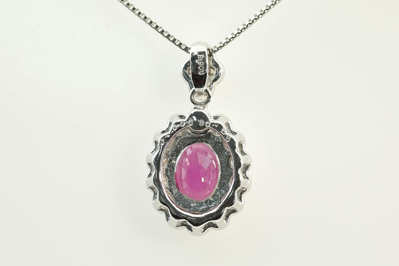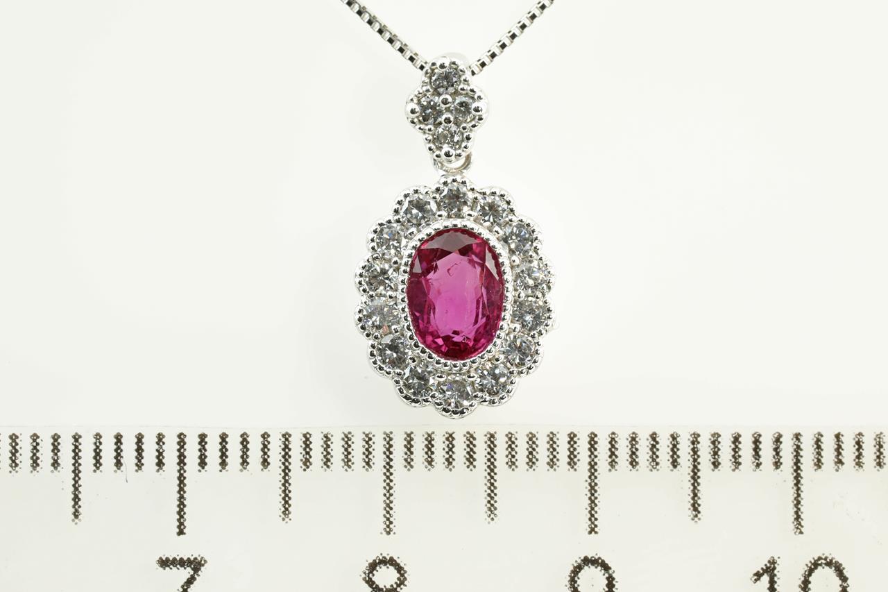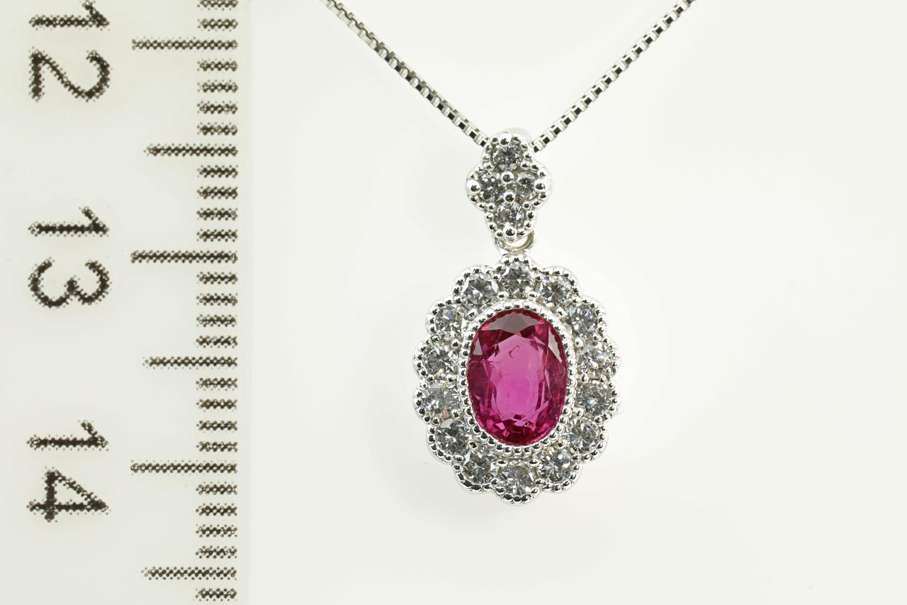 Ruby and Diamond pendant with oval cut Ruby of 1.09ct and Diamonds totalling 0.35cts (Estimated grading: G-H VS-SI). Platinum with platinum 40cm chain. Weight: 3.7g (Pre-owned)