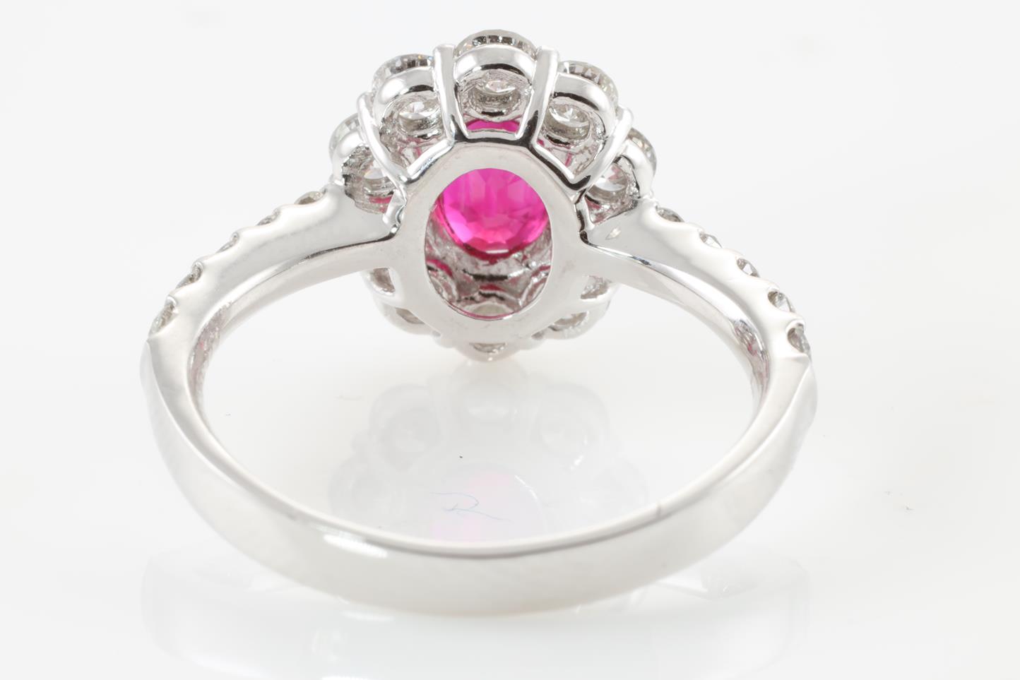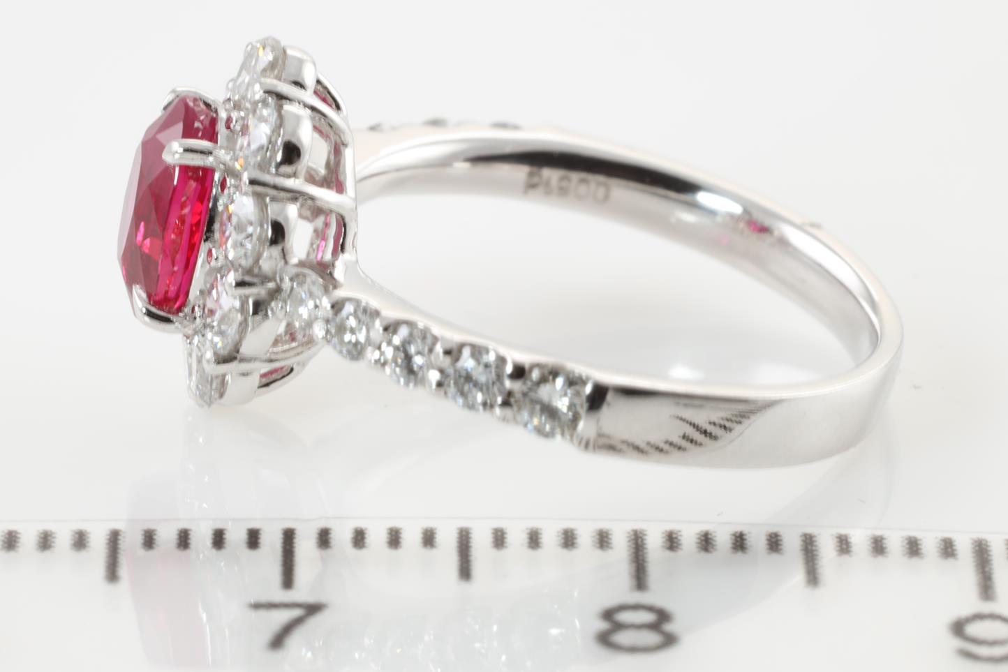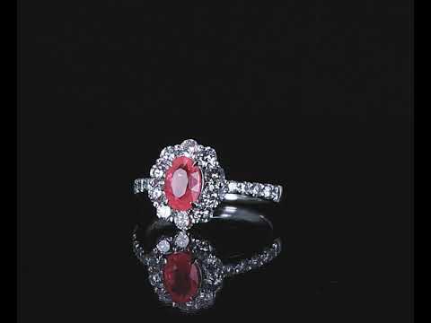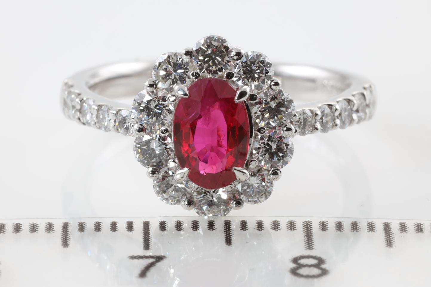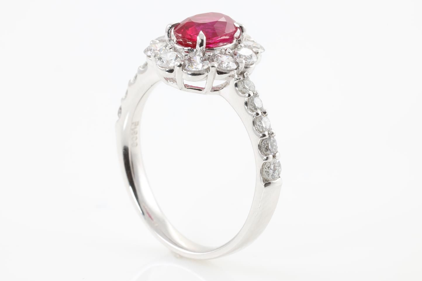 Ruby and Diamond ring with oval shape Ruby of 1.09ct and round Diamonds totalling 0.98cts (Estimated grading: G-H VS-SI). Platinum. Ring size: L - Ring resizing is not recommended. Weight: 4.8g (Pre-owned)