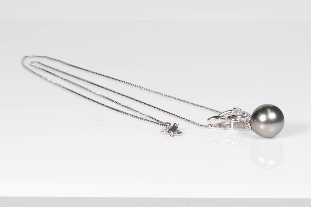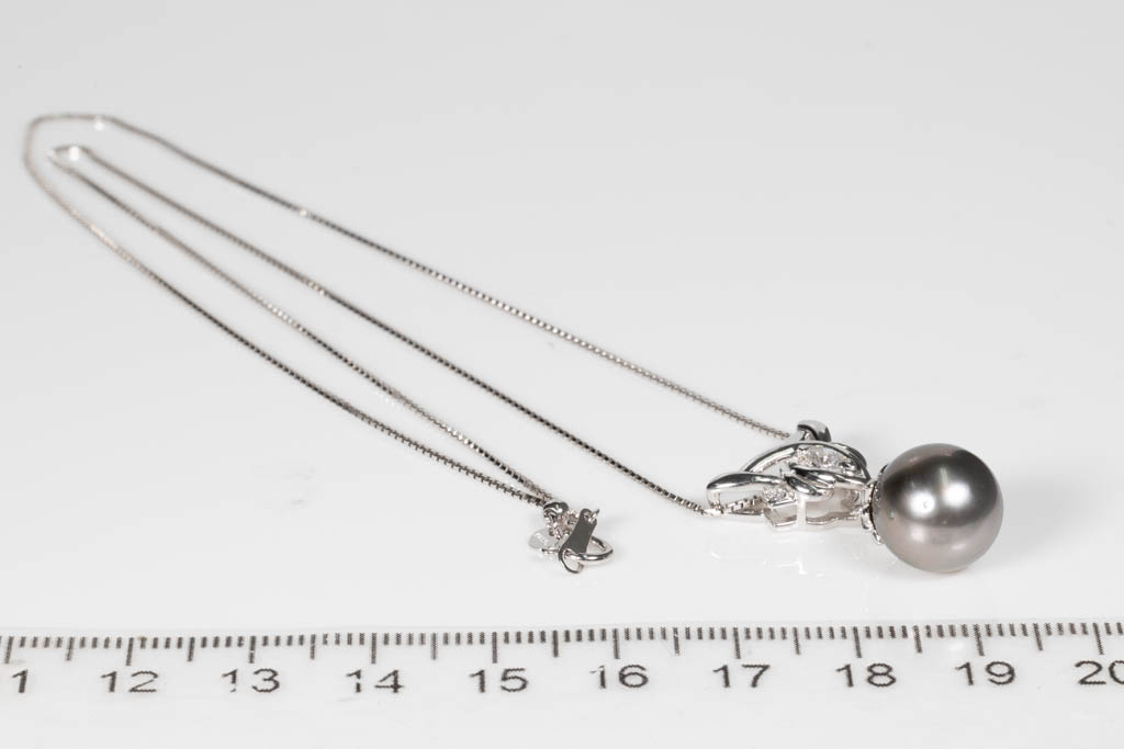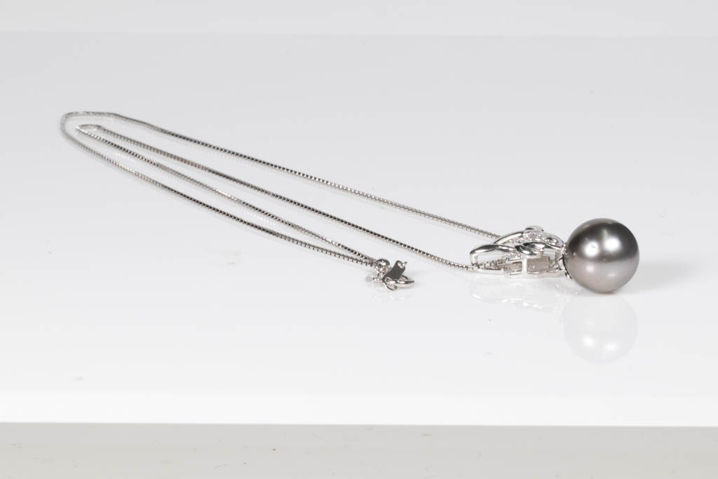 Pearl and Diamond pendant with a Tahitian Pearl of 10.9mm and round & marquise cut Diamonds totalling 0.18cts. Platinum with 40cm platinum chain. Weight: 8.0g. (Pre-owned)