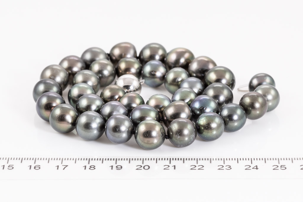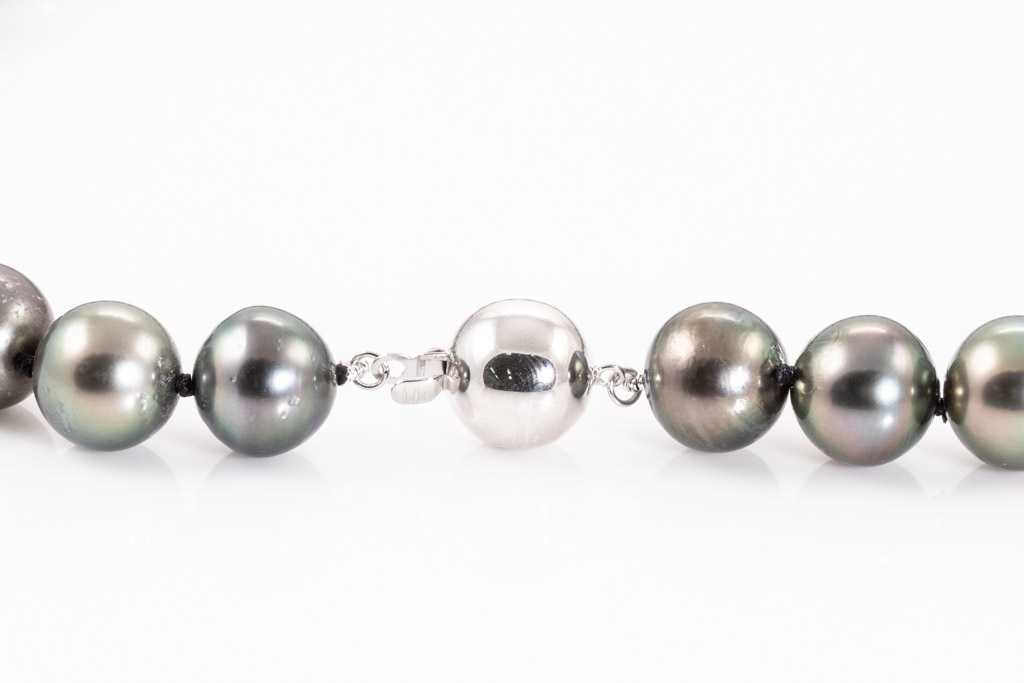 Pearl necklace with graduated button & semi-round Tahitain pearls of 11.0 - 13.3mm. 14ct white gold 11mm ball clasp. Length: 47cm. Weight: 83.3g. (Pre-owned)