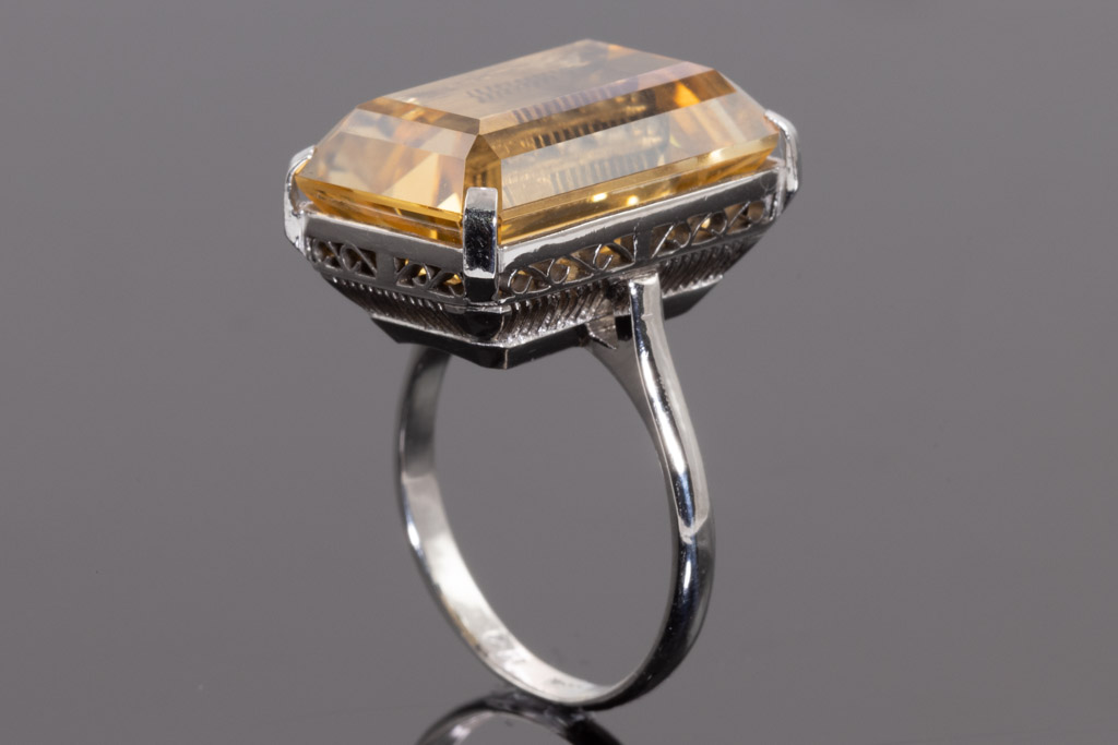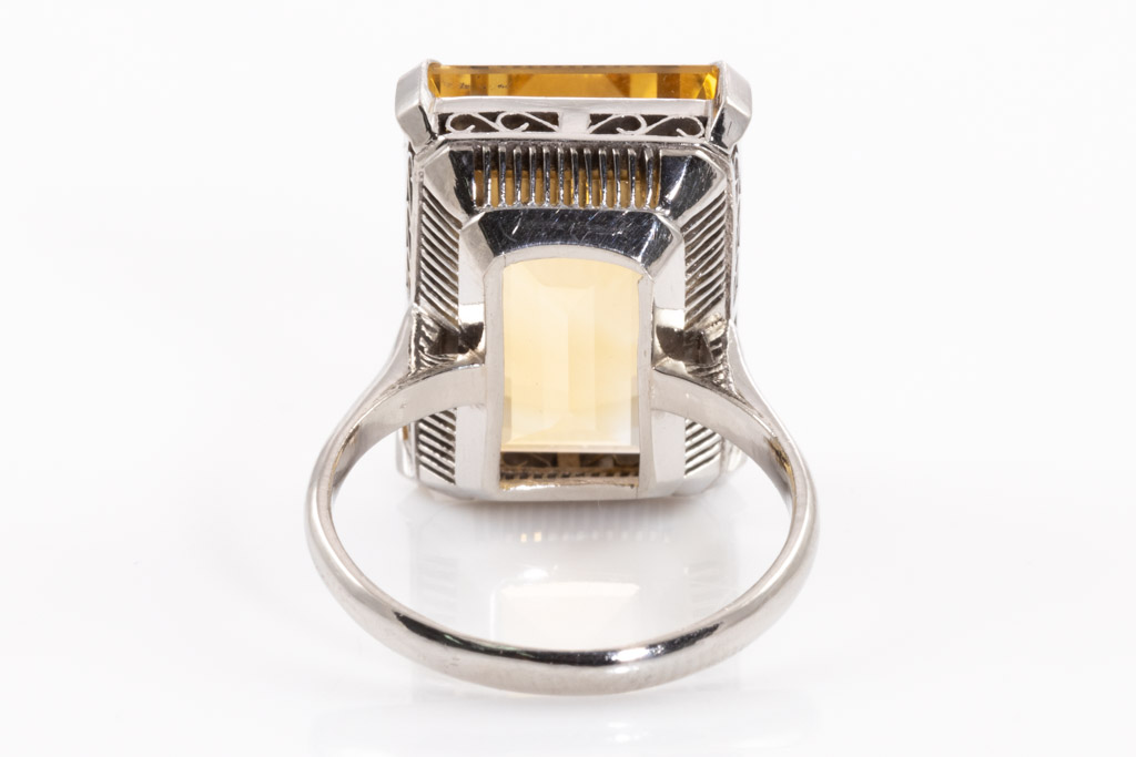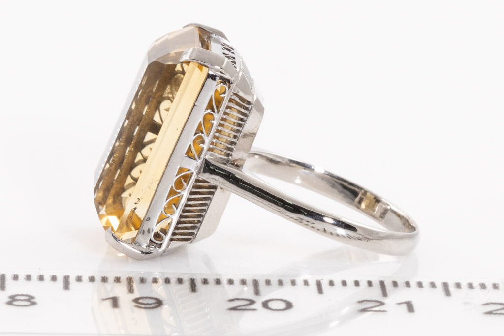 Citrine ring with emerald cut Citrine of 11.00ct. Platinum. Ring size: I1/2. Weight: 8.1g. (pre-owned)