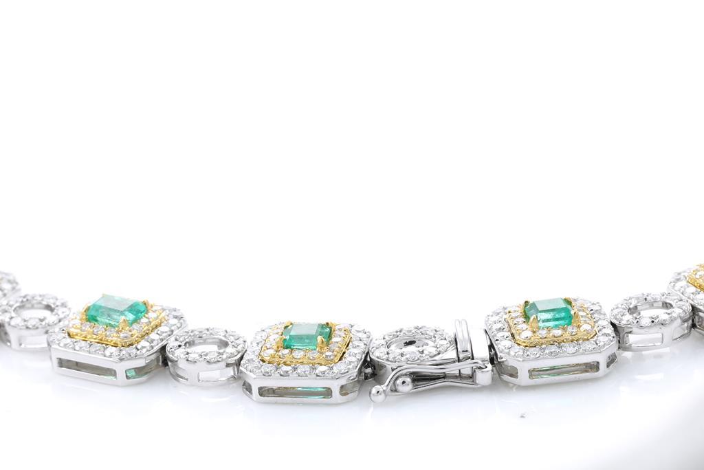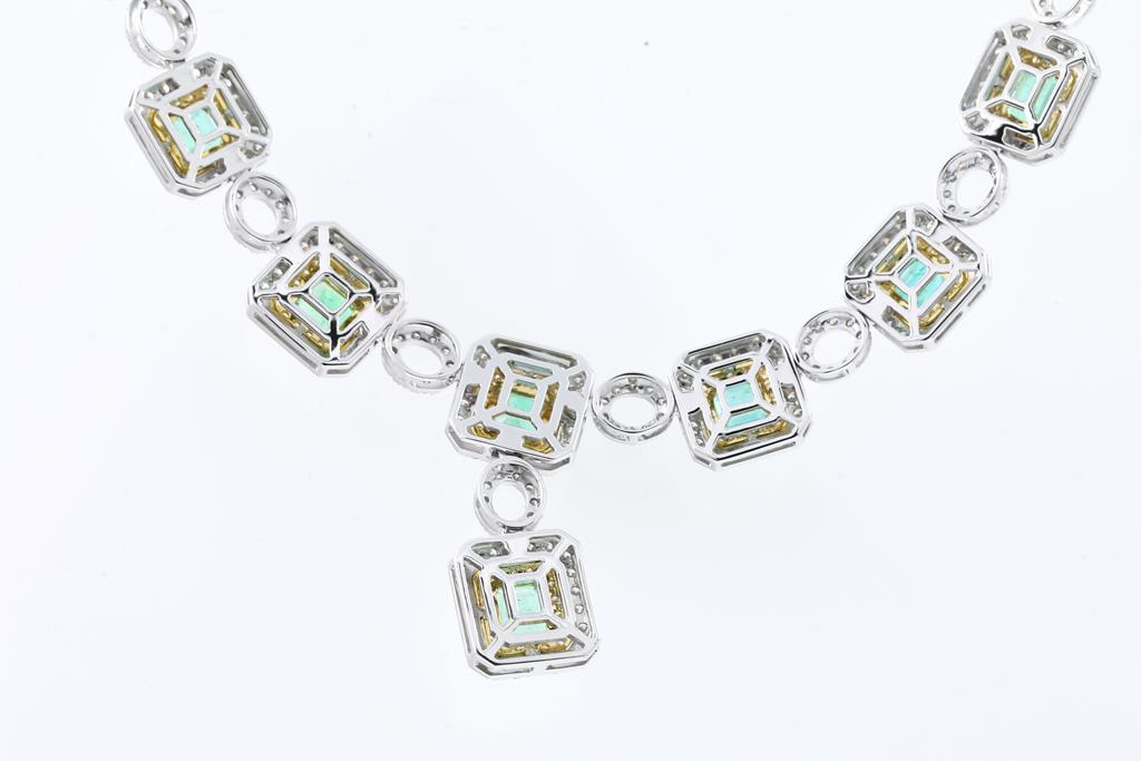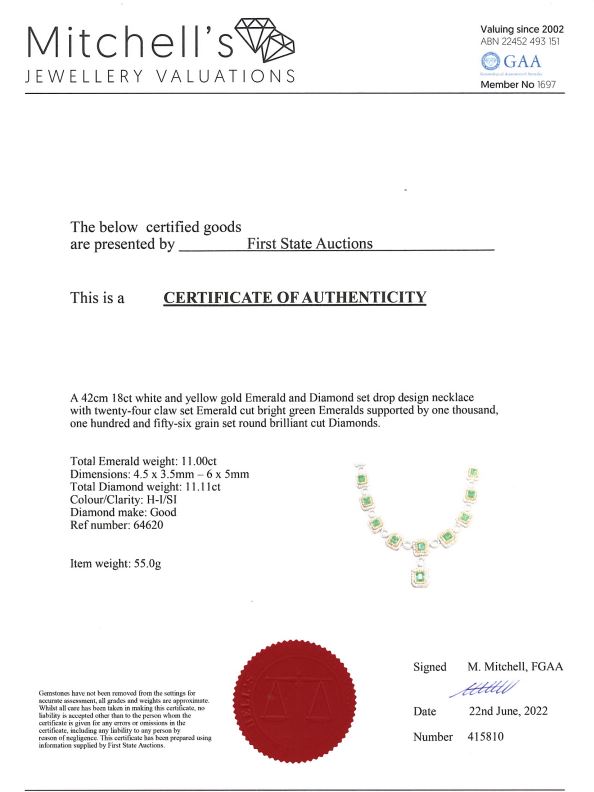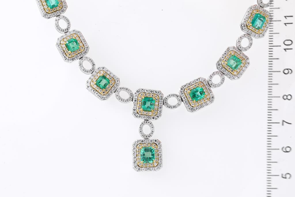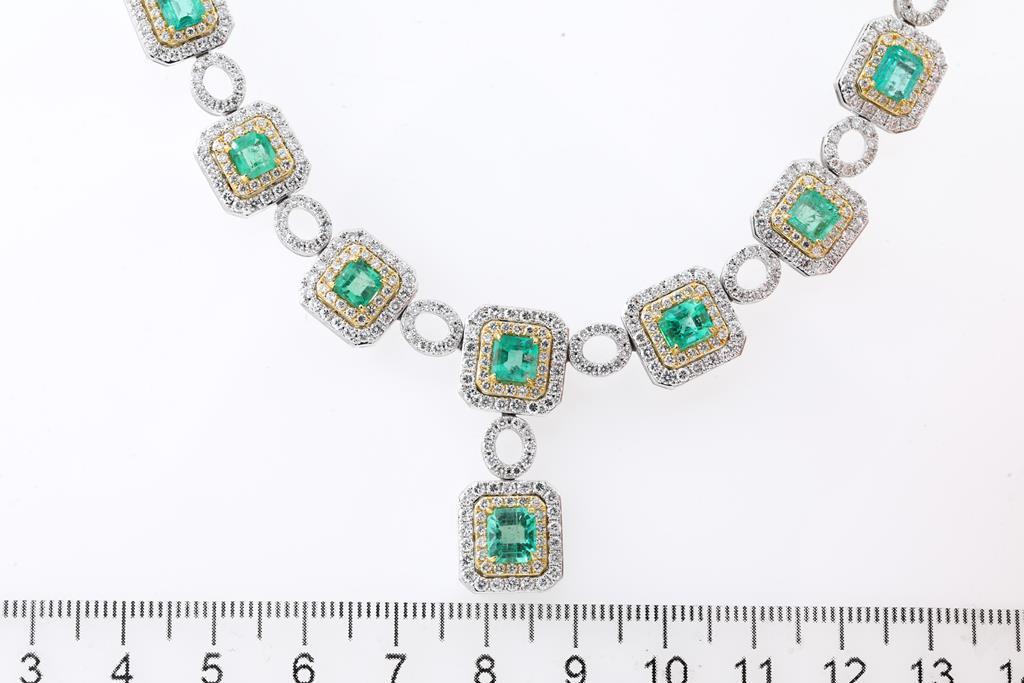 Emerald and Diamond necklace with emerald cut Emeralds totalling 11.00cts and round Diamonds totalling 11.11cts (Estimated grading: H-I SI) 18ct yellow & white gold. Length: 42cm. Weight: 55g. With Certificate #415810. (Pre-owned)