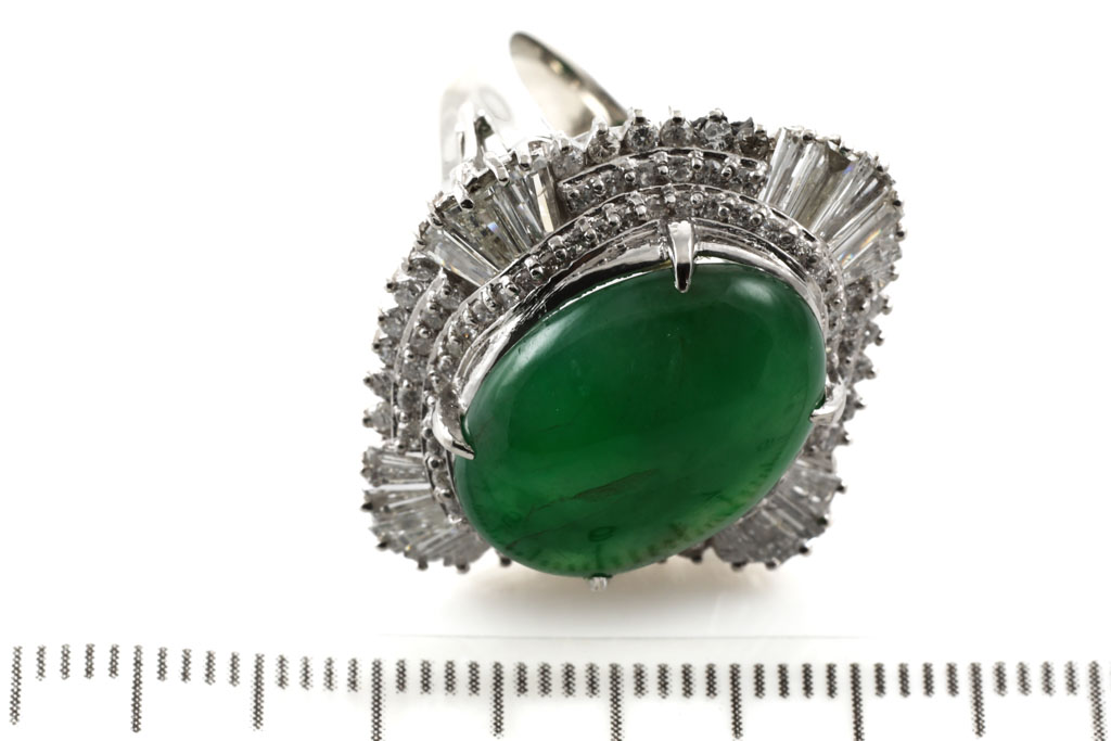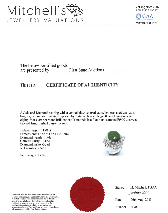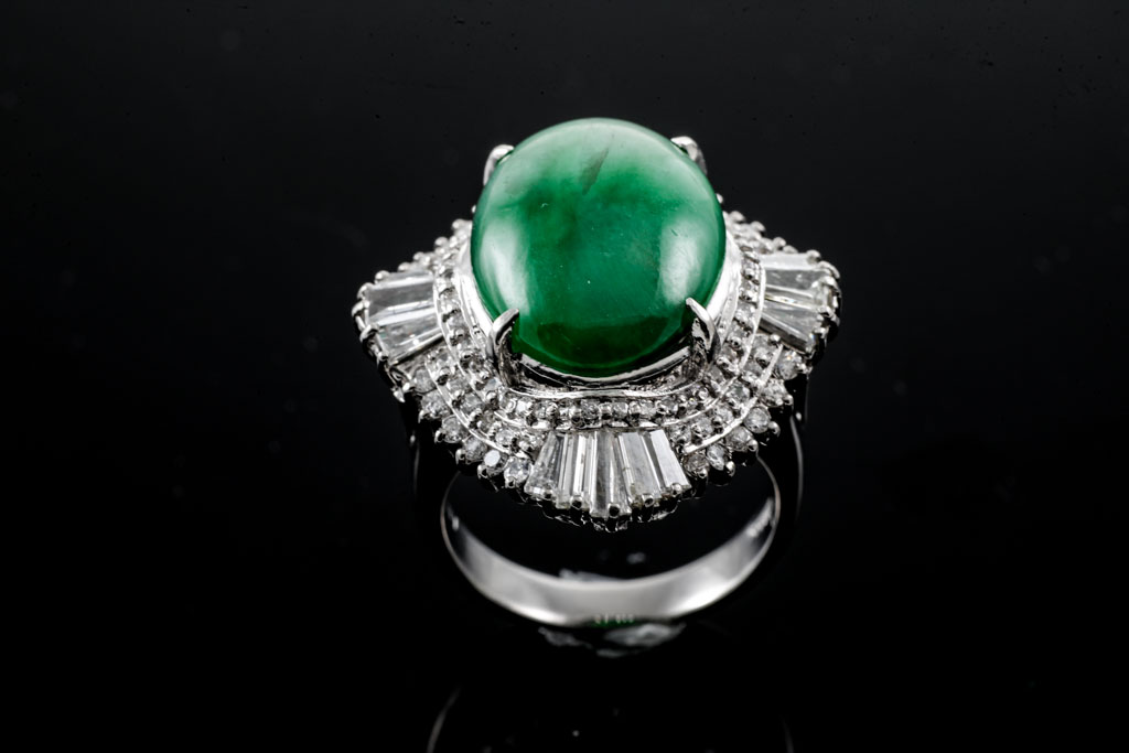 Jade and Diamond ring with cabochon cut oval shape natural green Jadeite Jade (Type A) of 11.01ct (note: Jade with surface reaching inclusions) and baguette cut and round Diamonds totalling 1.94cts (Estimated grading: H-I SI). Platinum - 900. Ring size L1/2. Weight: 17.0g. With Certificate #417074. (Pre-owned)