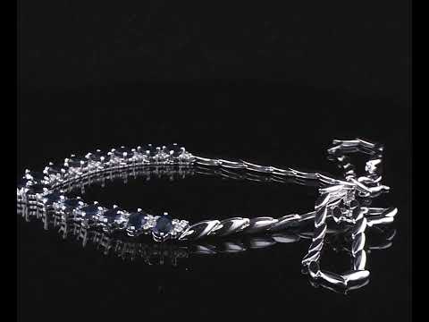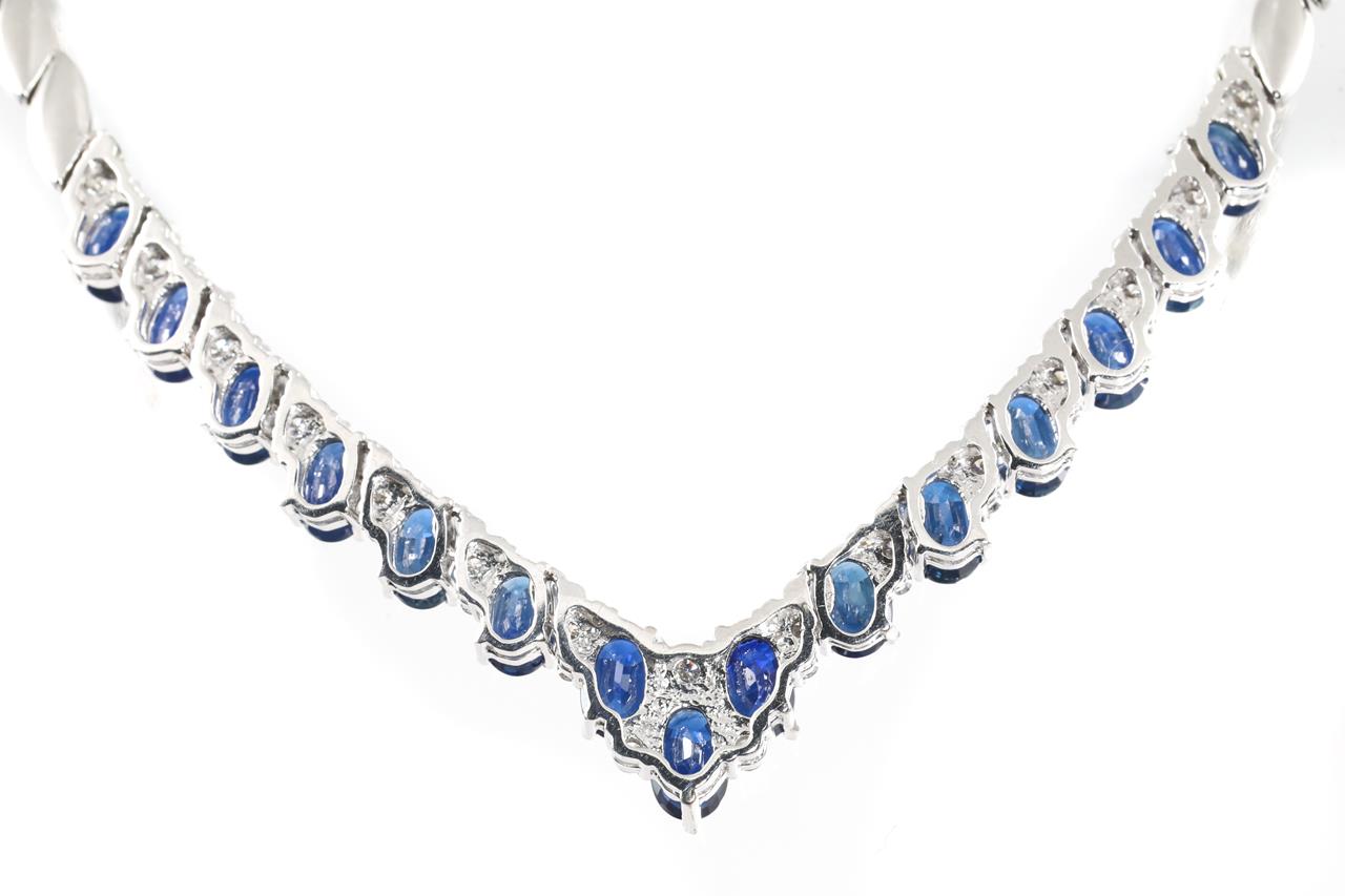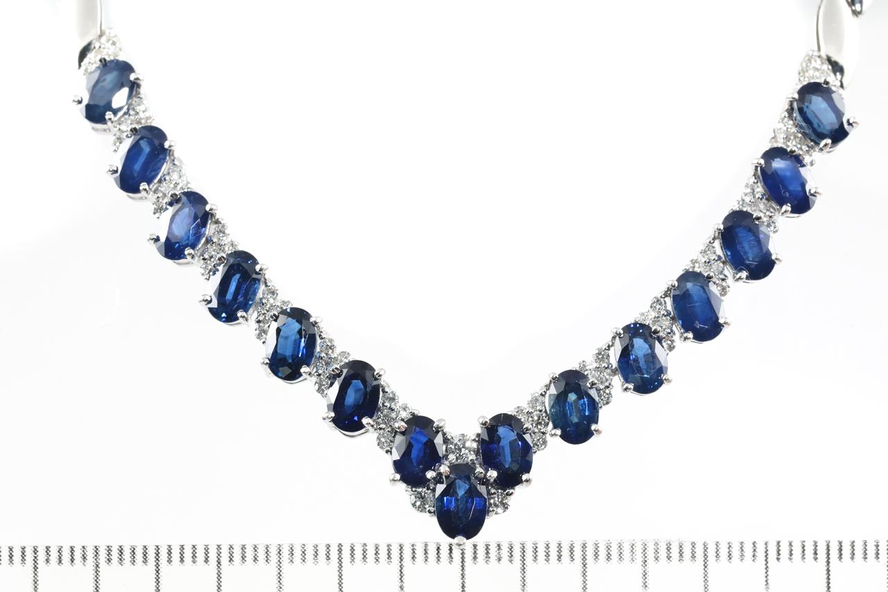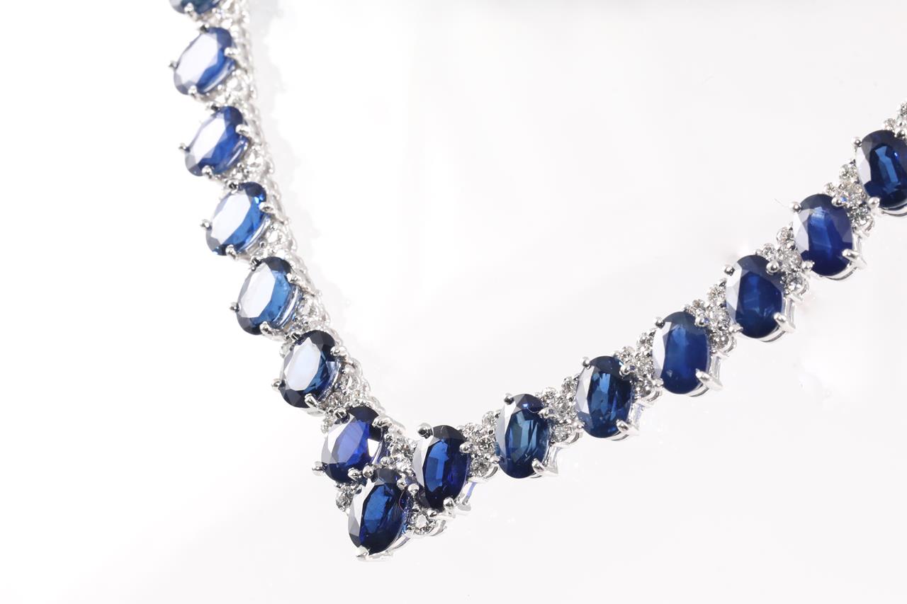 Sapphire and Diamond necklace with oval shape blue Sapphires totalling 11.02cts and Diamonds totalling 0.80cts (Estimated grading: G-H SI). 18ct white gold. Length: 41cm. Weight: 23.8g. With certificate #415399. (Pre-owned)