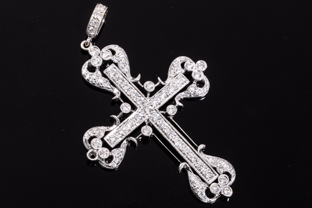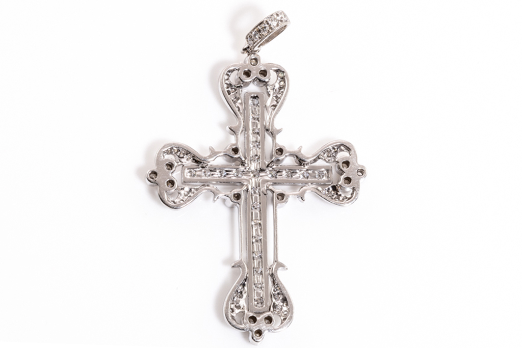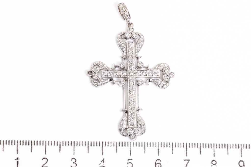 Diamond Cross pendant with round Diamonds totalling 1.10cts (Estimated grading: H SI-P1). 18ct white gold. No chain supplied. Weight: 7.3g. (Pre-owned)
