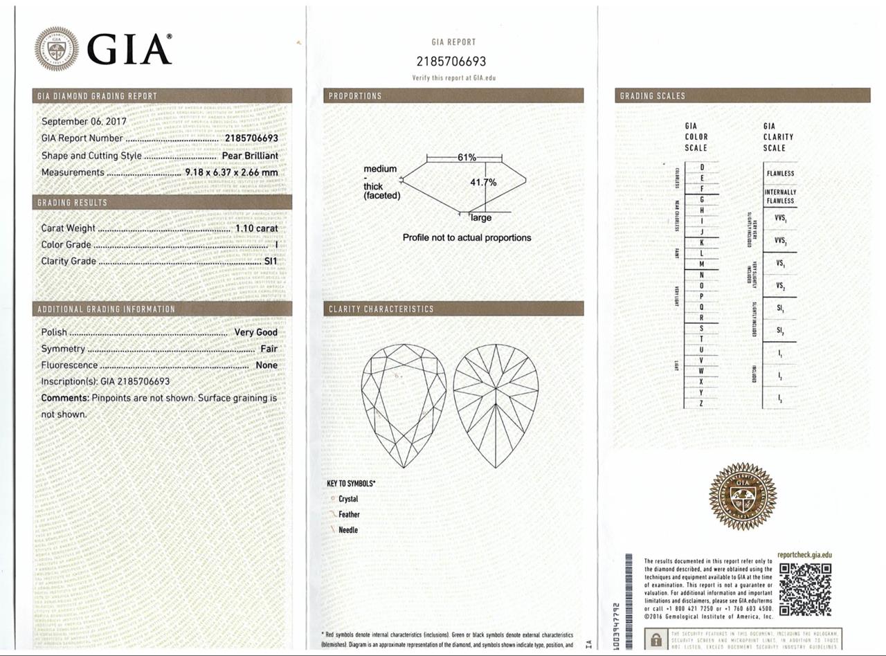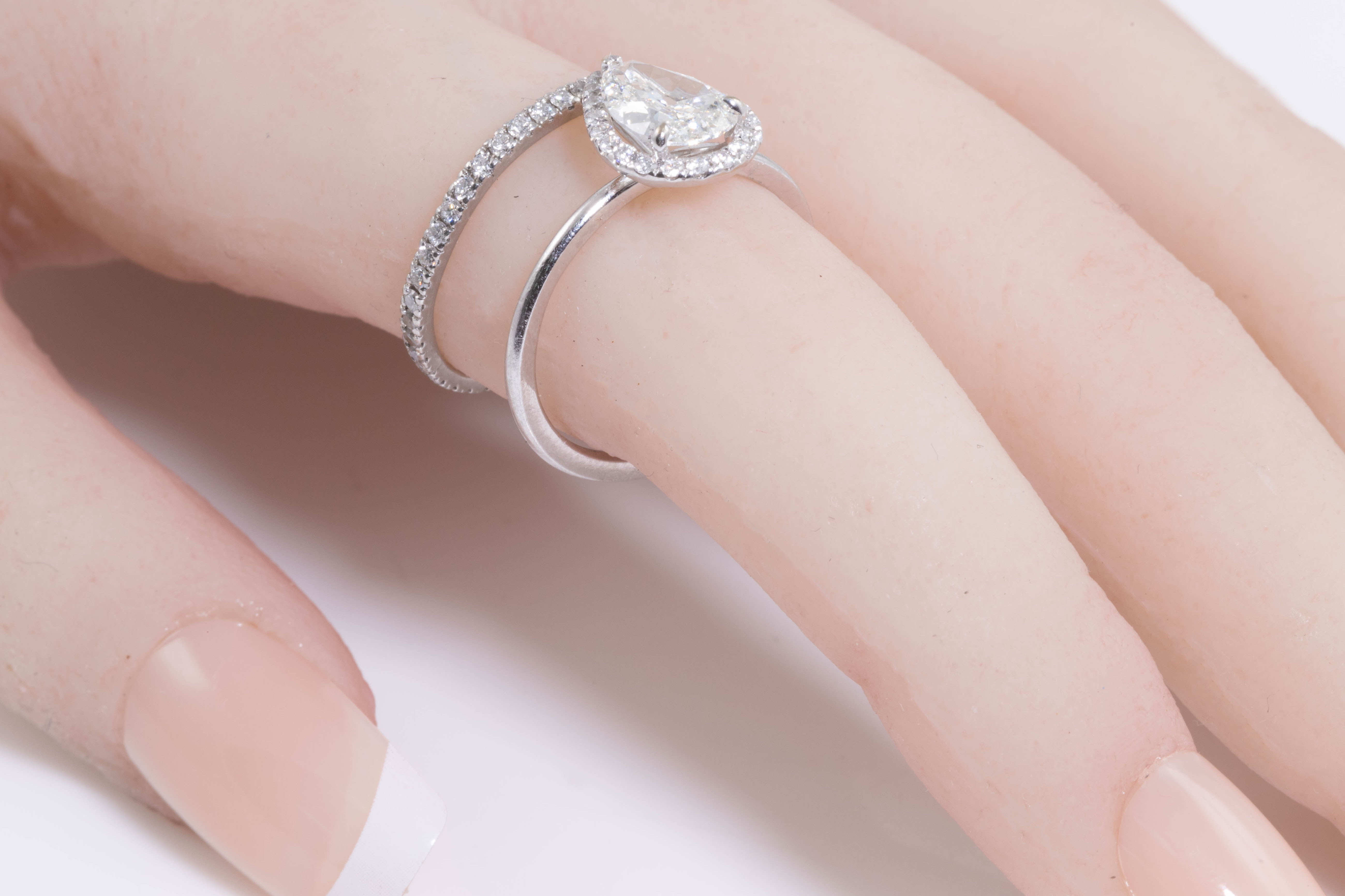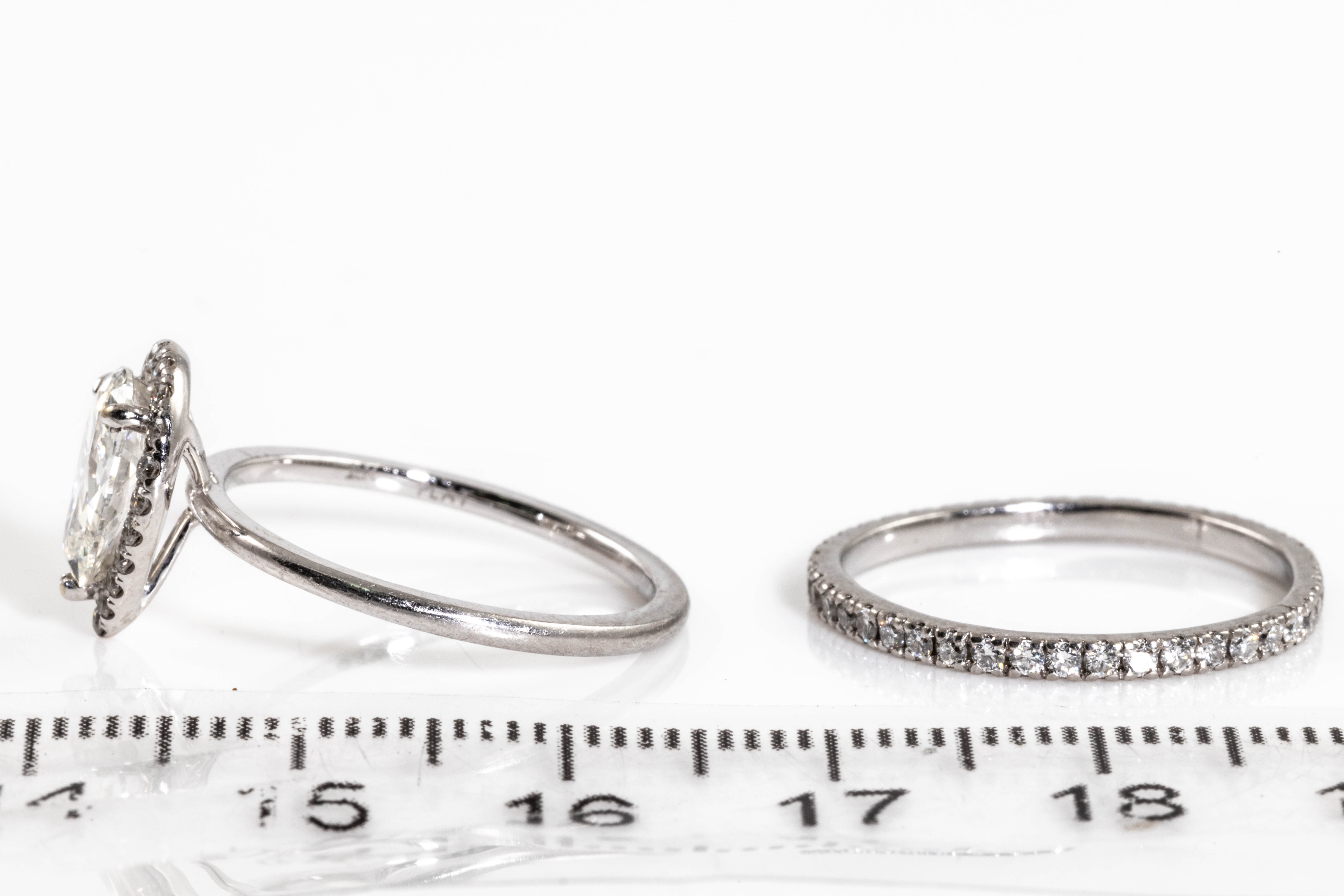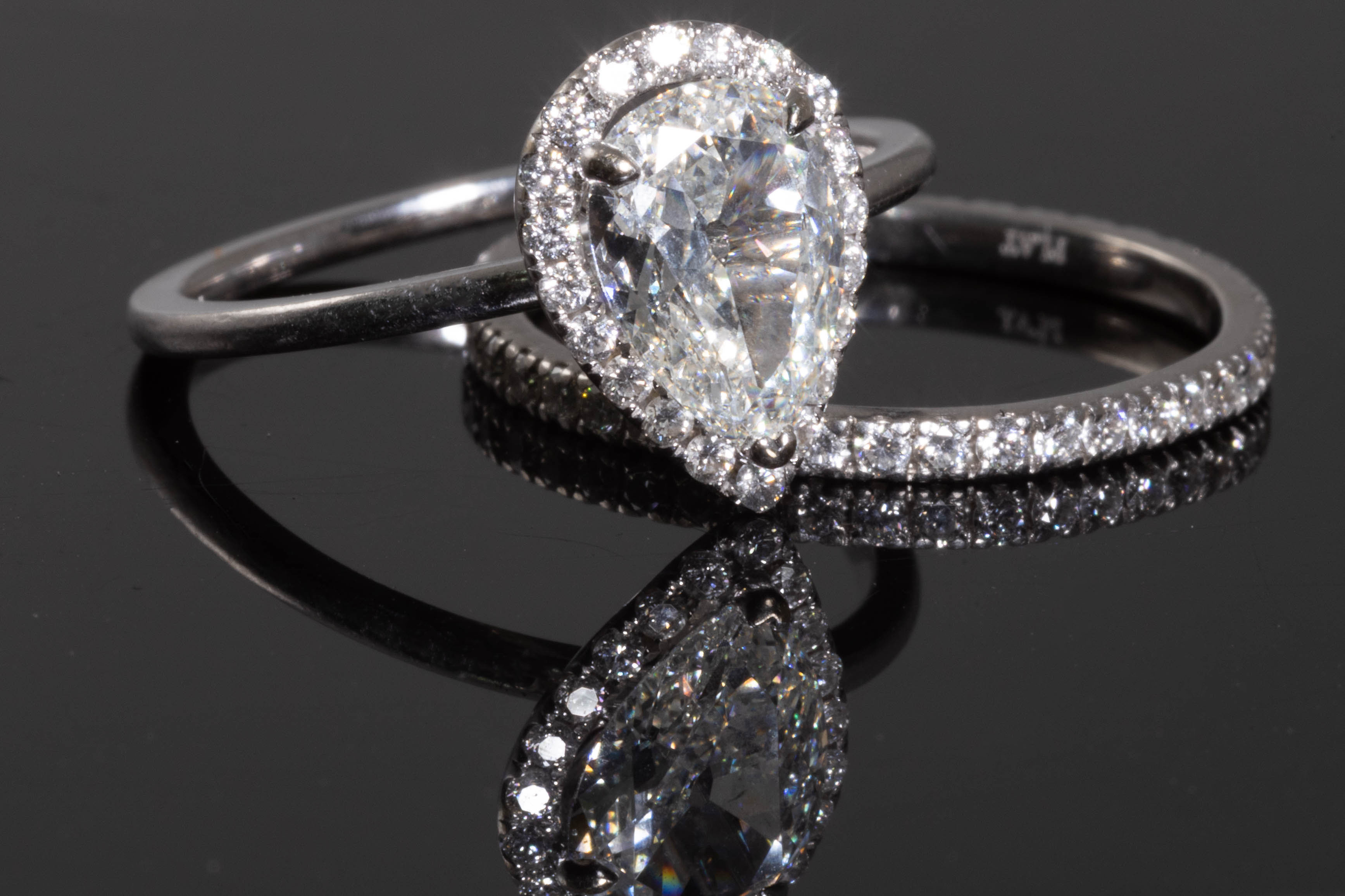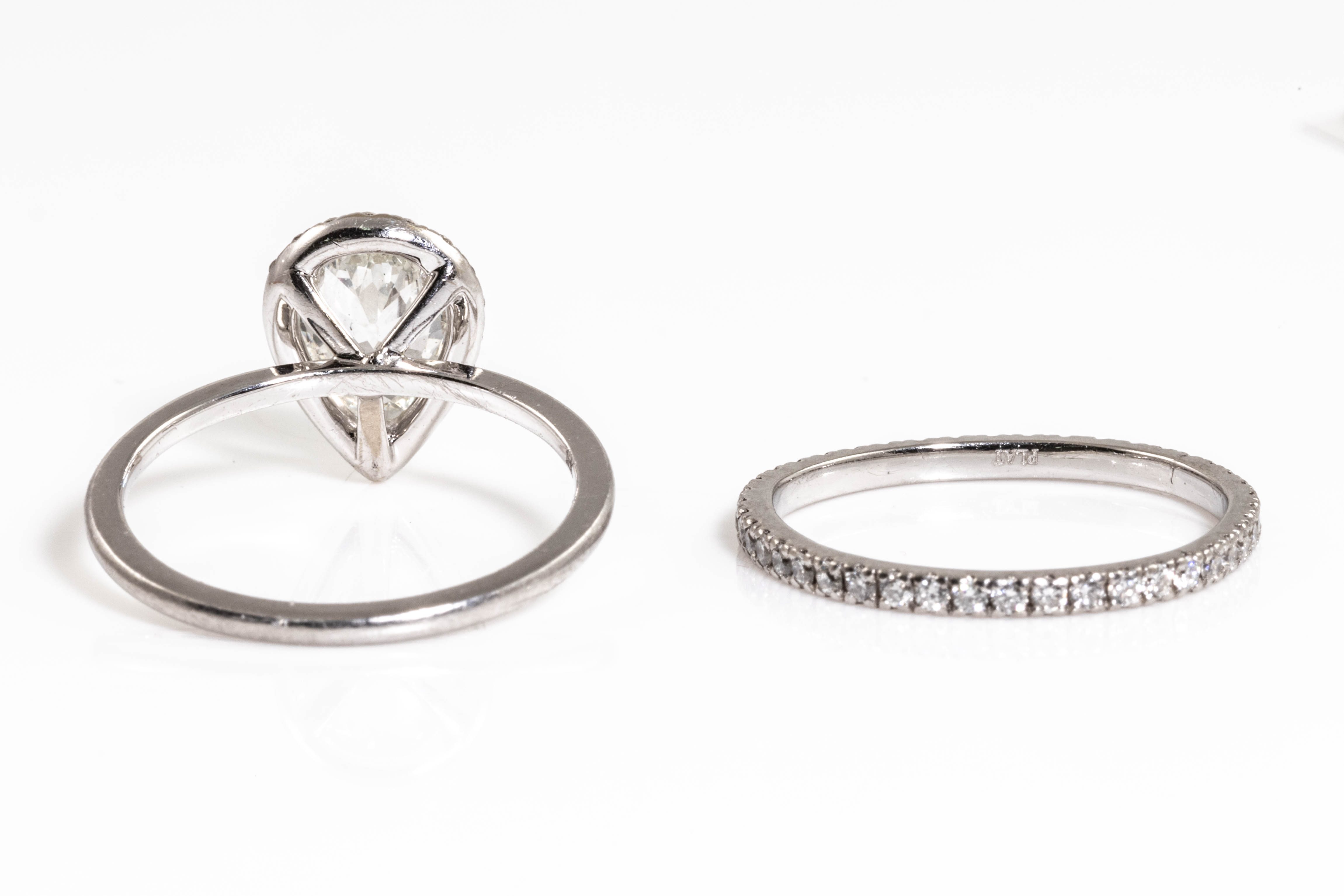 Diamond Ring Wedding Set with centred pear shape Diamond of 1.10ct (with GIA certificate graded as I SI1 #2185706693) and round Diamonds totalling approximately 0.20cts. 18ct white gold and platinum. Ring size N. With Diamond full hoop eternity ring with diamonds totalling approx. 0.50cts (Estimated grading: H-I SI), platinum (band distorted). Ring size N - no resizing. Total weight 4.9g. (Pre-owned)