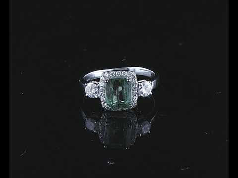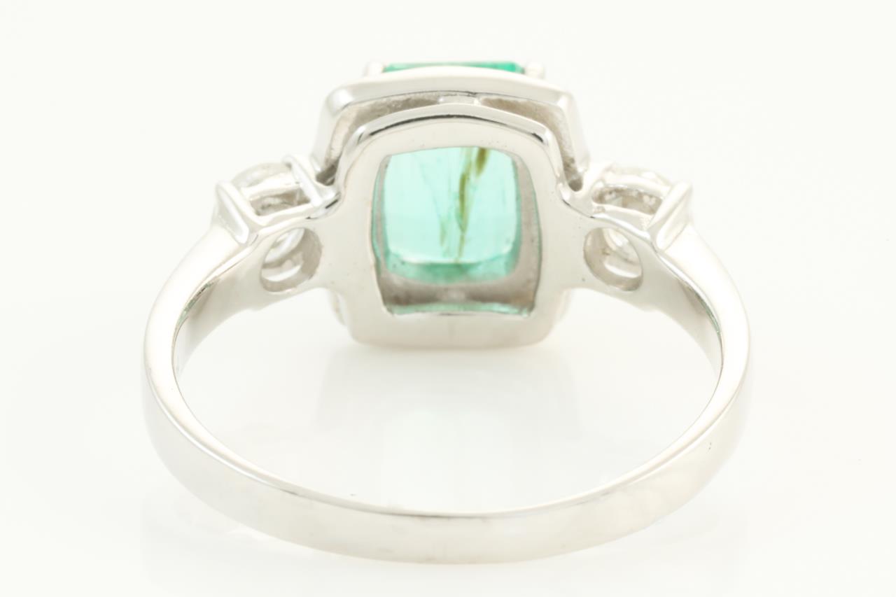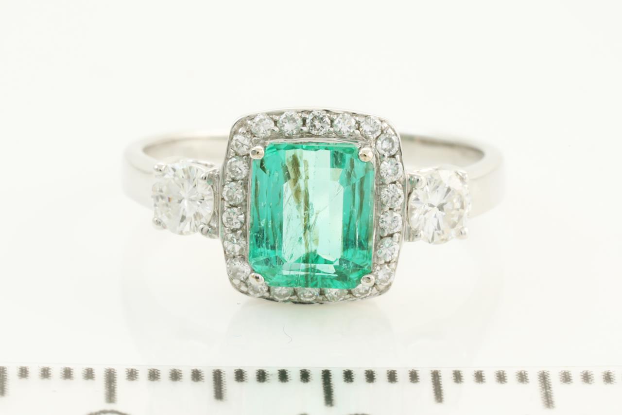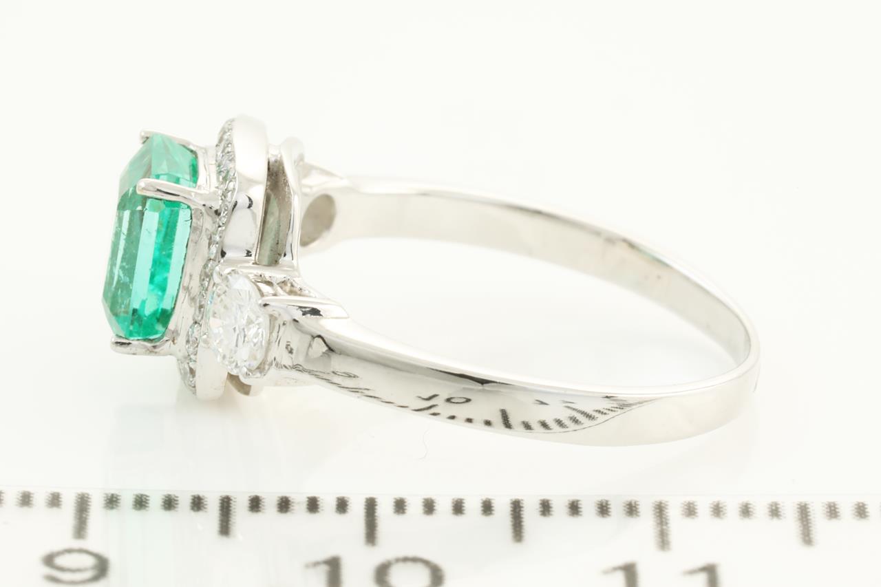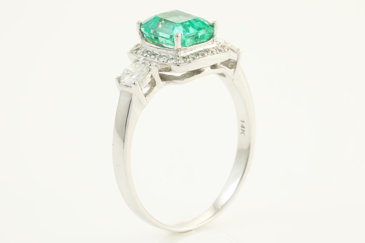 Emerald and Diamond ring with an emerald cut Emerald of 1.10ct and round Diamonds totalling 0.41cts (Estimated grading: G-H VS-SI). 14ct white gold. Ring size L. Weight: TBAg (As New)