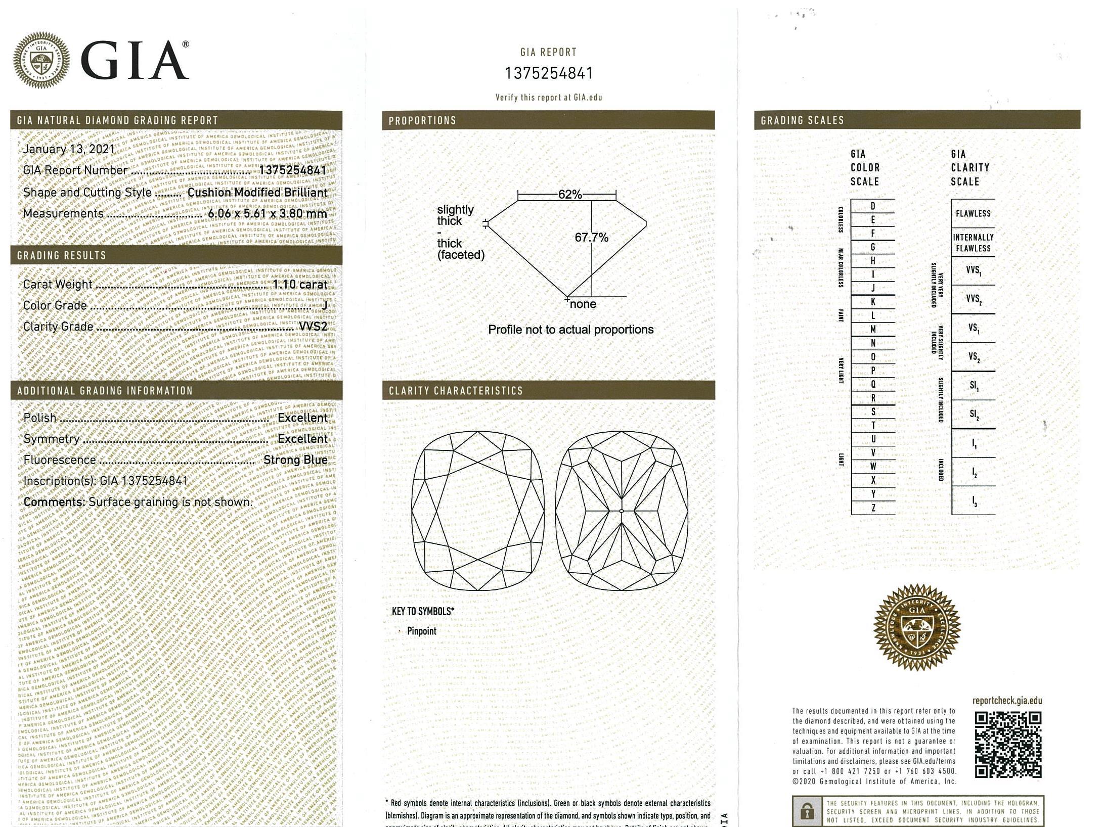 A loose cushion cut Diamond of 1.10ct (with GIA Report graded as J VVS2 # 1375254841). (New)