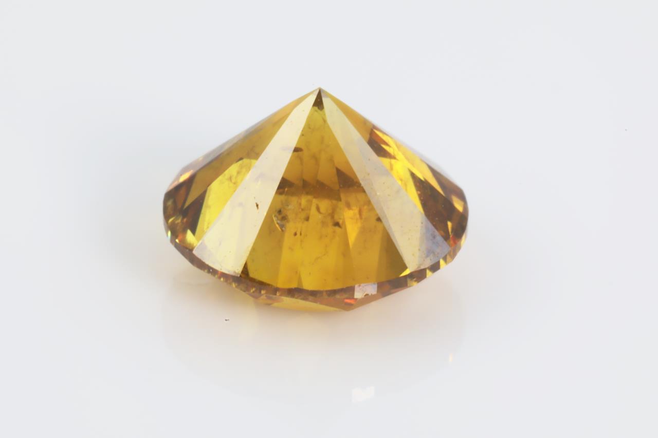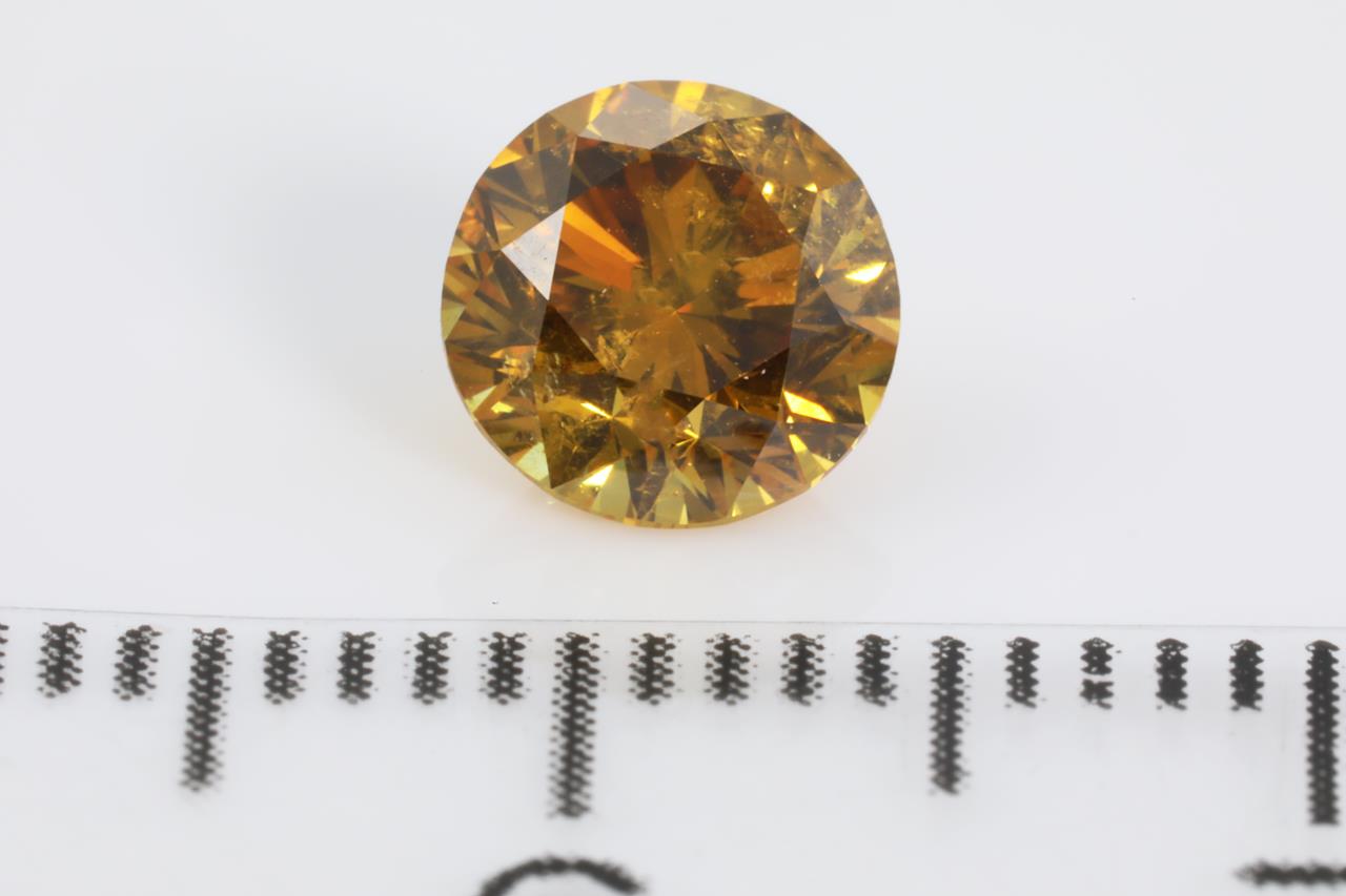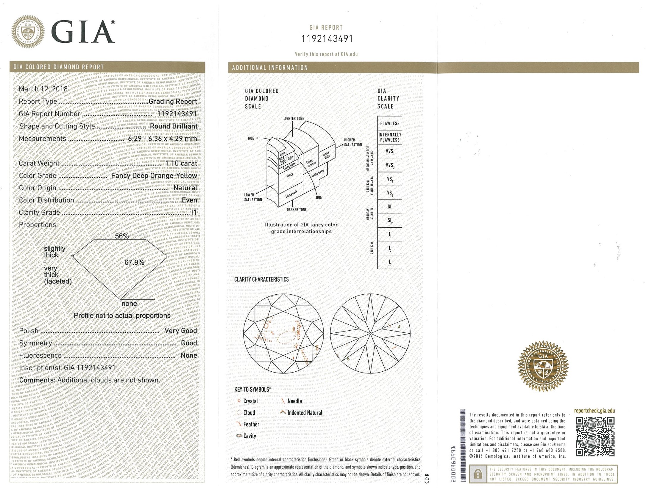 A loose Round Brilliant Cut Diamond of 1.10ct (with GIA report graded as Natural Fancy Deep Orange-Yellow Even P1 #1192143491). (New)