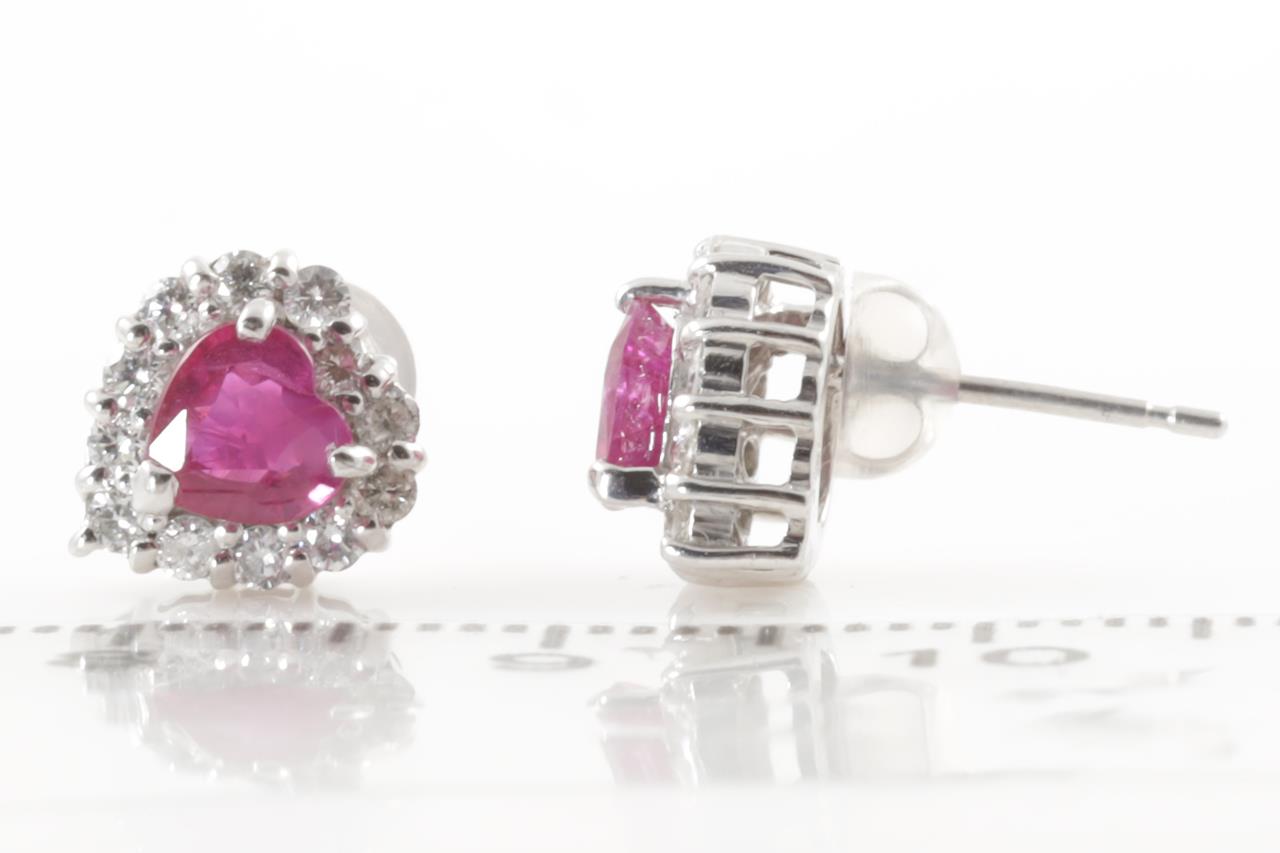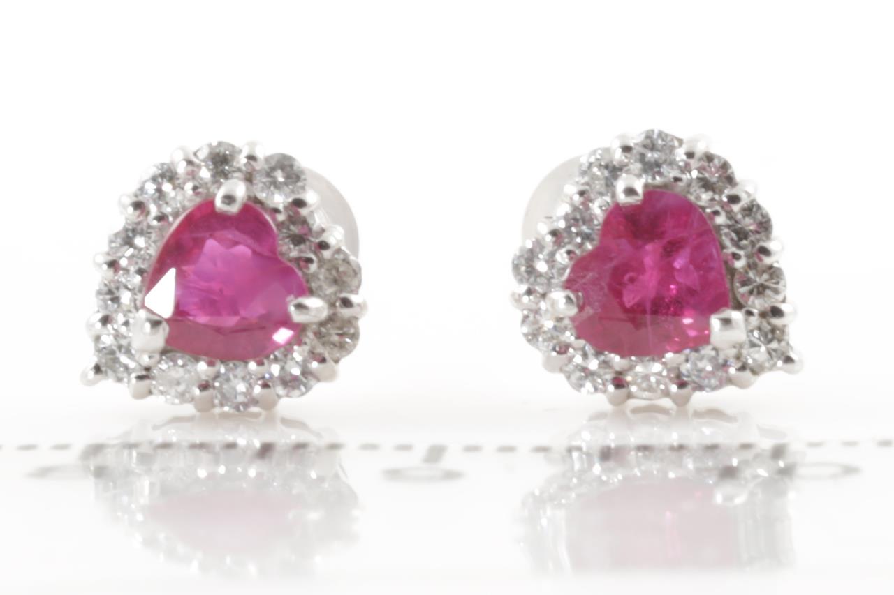 Ruby and Diamond earrings with heart shape rubies totalling 1.10cts and Diamonds totalling 0.38cts. (Estimated grading: H SI). 18ct white gold with gold & silicon backs. Weight: 2.2g (Pre-owned)