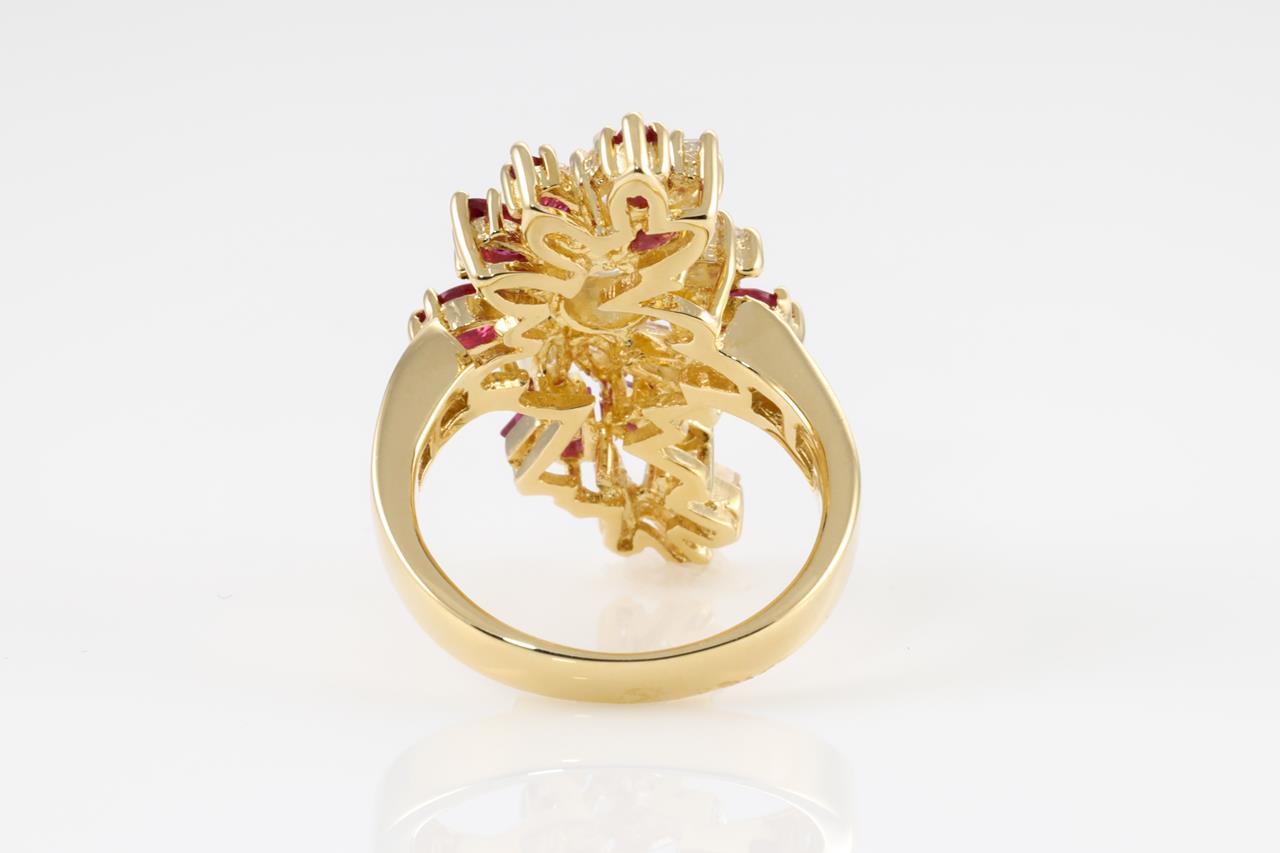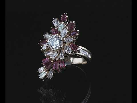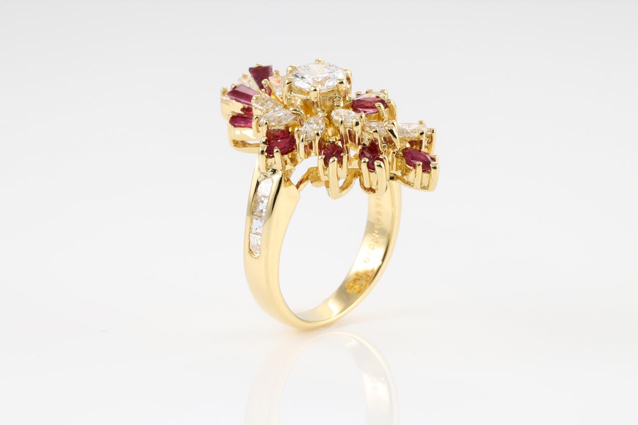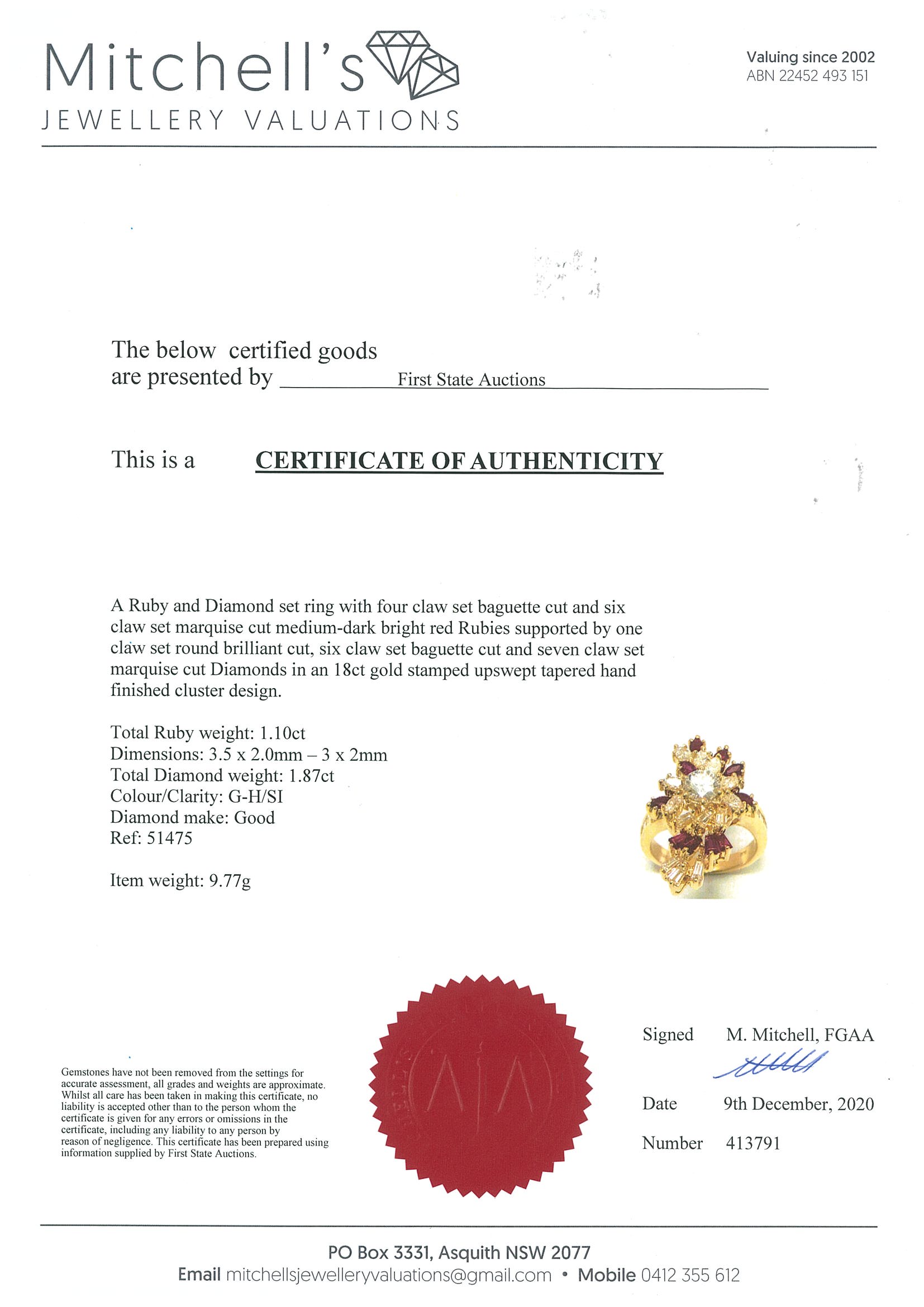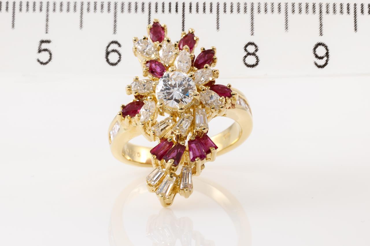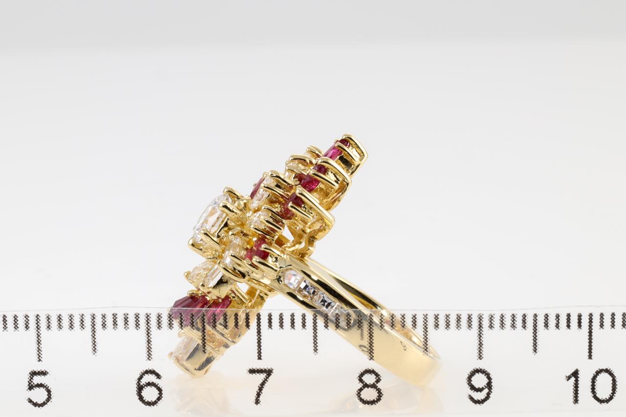 Vintage Ruby and Diamond ring with Rubies totalling 1.10cts, centre Diamond of 0.59ct and remaining baguette & marquise cut Diamonds totalling 1.28cts. (Estimated grading: G-H SI). 18ct yellow gold. Ring size: L1/2 . Weight: 9.77g. With Certificate #413791. (Pre-owned)