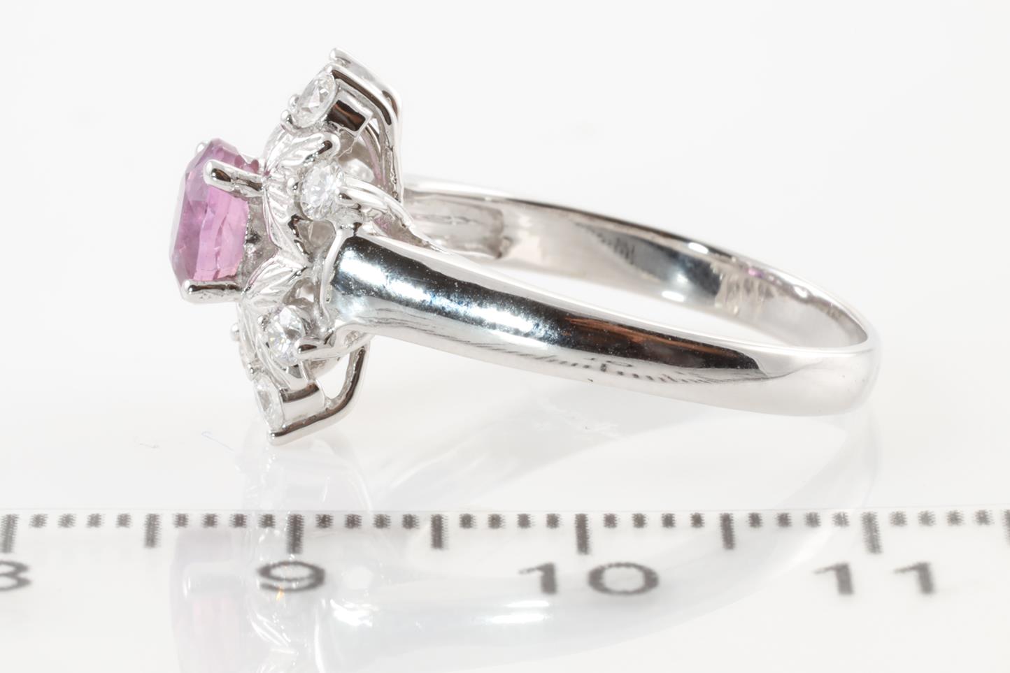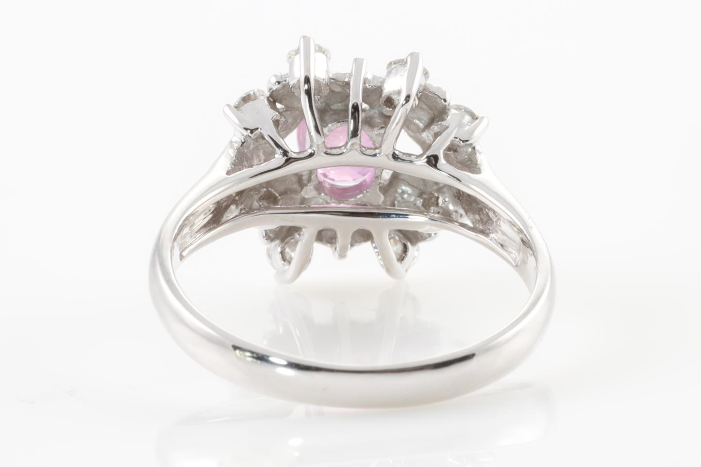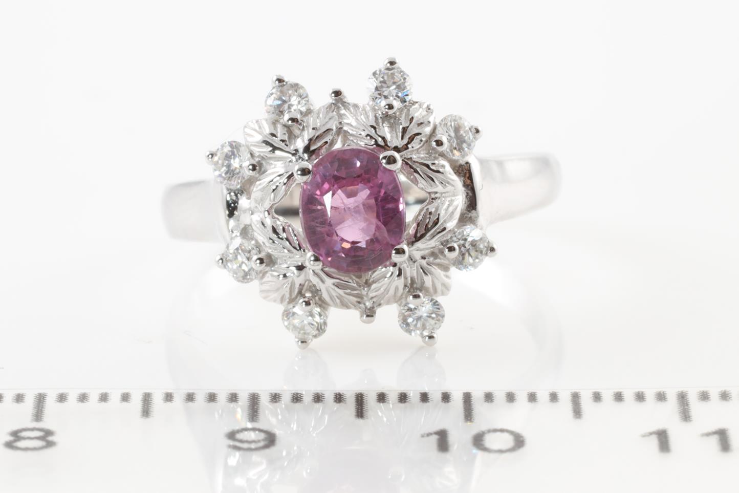 Sapphire and Diamond ring with an oval pink Sapphire of 1.10ct and round Diamonds totalling 0.33cts (Estimated grading: H-I SI). 14ct white gold. Ring size O. Weight: 4g (As New)
