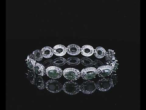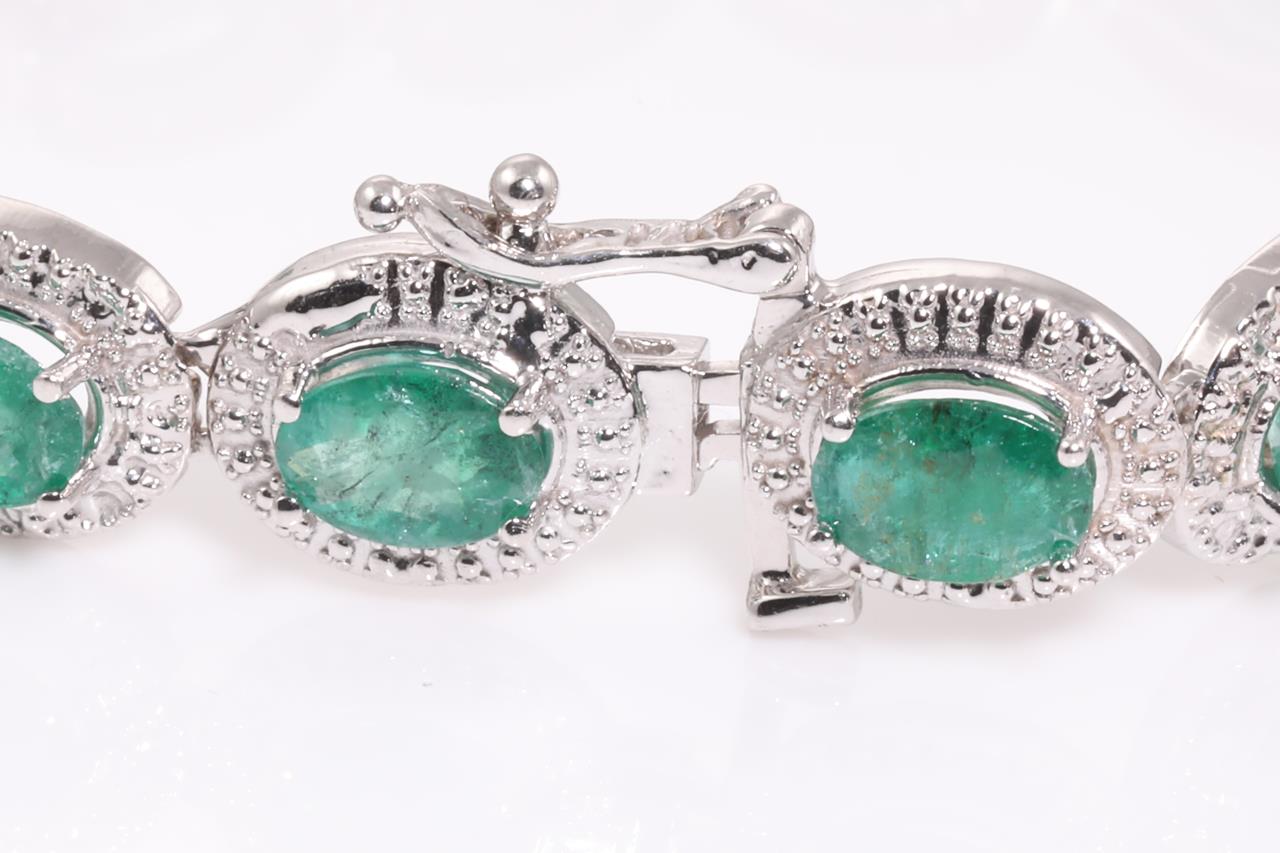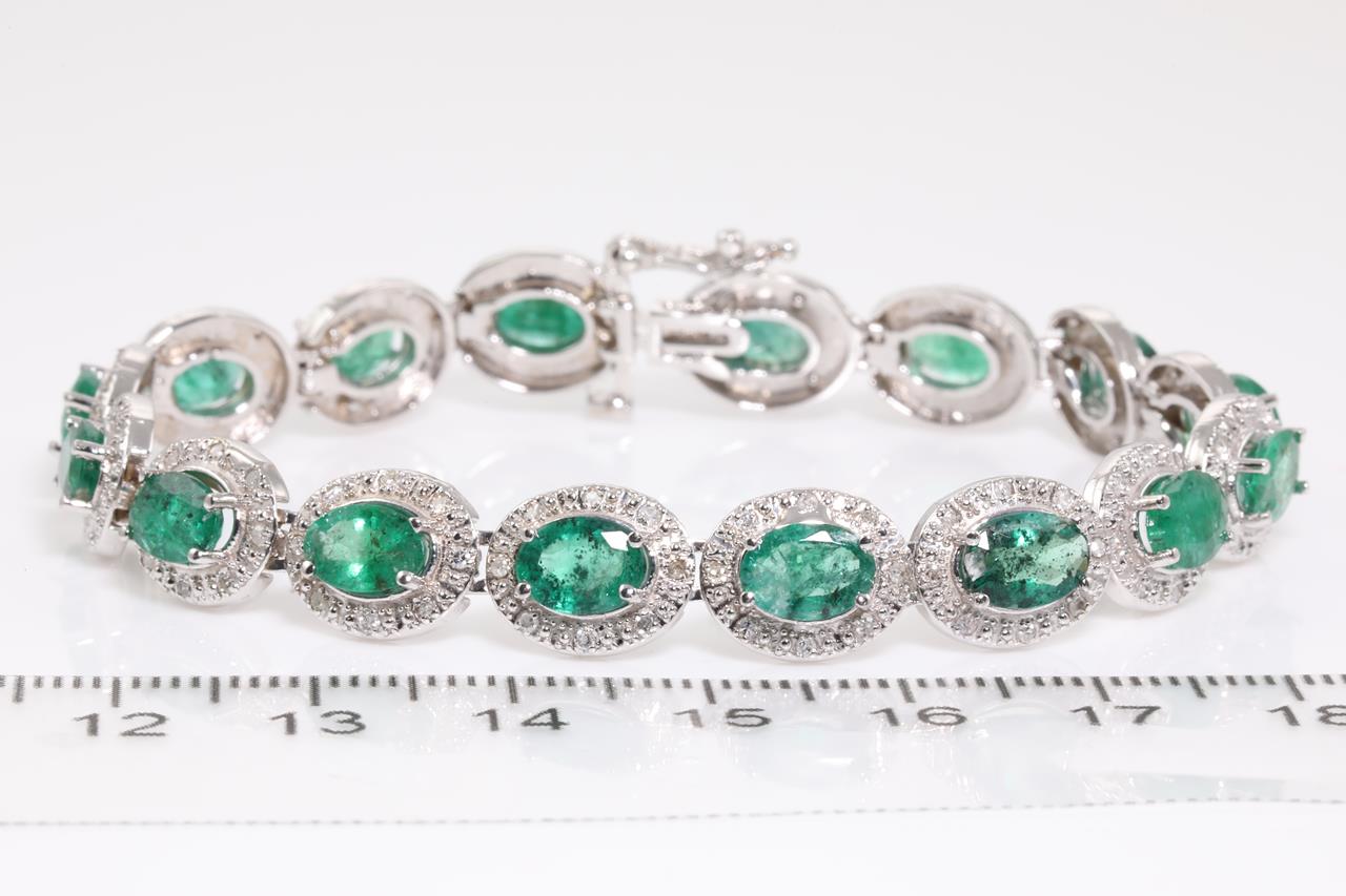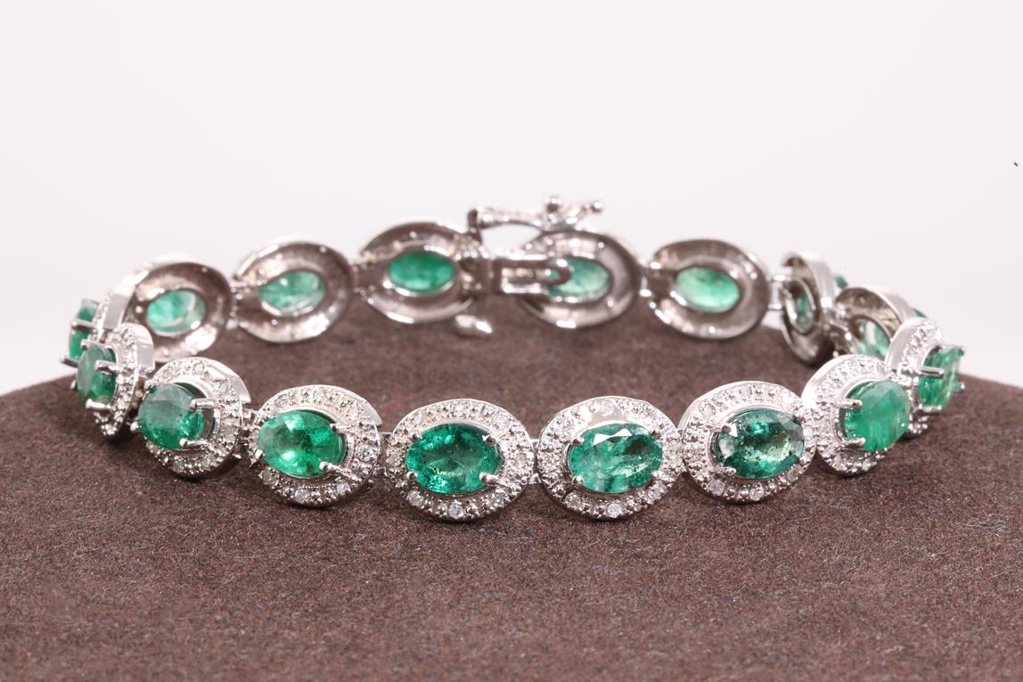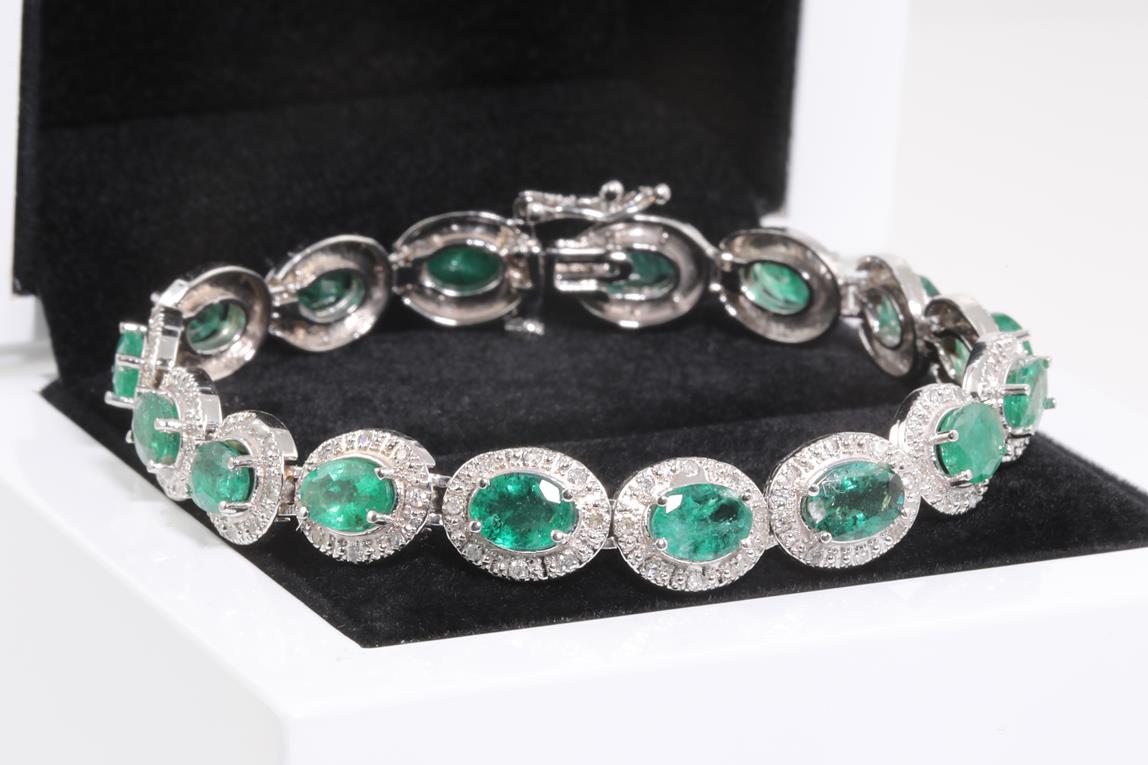 Emerald and Diamond Bracelet with sixteen oval Emeralds totalling approximately 11.10cts and thirty round Diamonds totalling appoximately 0.25cts. 14ct white gold. Length 18cm. Weight 18g. (Pre-owned)
