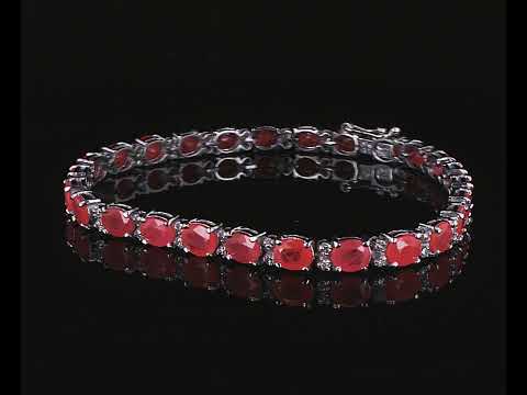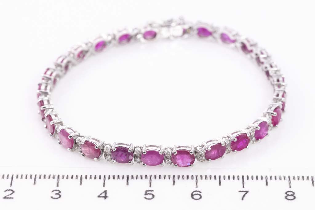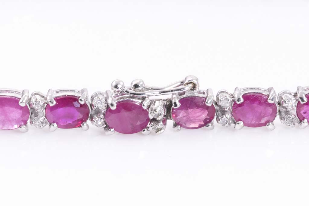 Ruby and Diamond bracelet with oval shape Rubies totalling 11.10cts and round Diamonds totalling 0.43cts (Estimated grading: H SI). 14ct white gold. Length: 17cm. Weight: 9.1g. (Pre-owned)