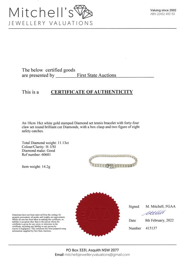 Diamond tennis bracelet with 44 round Diamonds totalling 11.13cts (Estimated grading: H-I SI). 18ct white gold. Length: 18cm. Weight: 14.2g. With certificate #415137. (New)