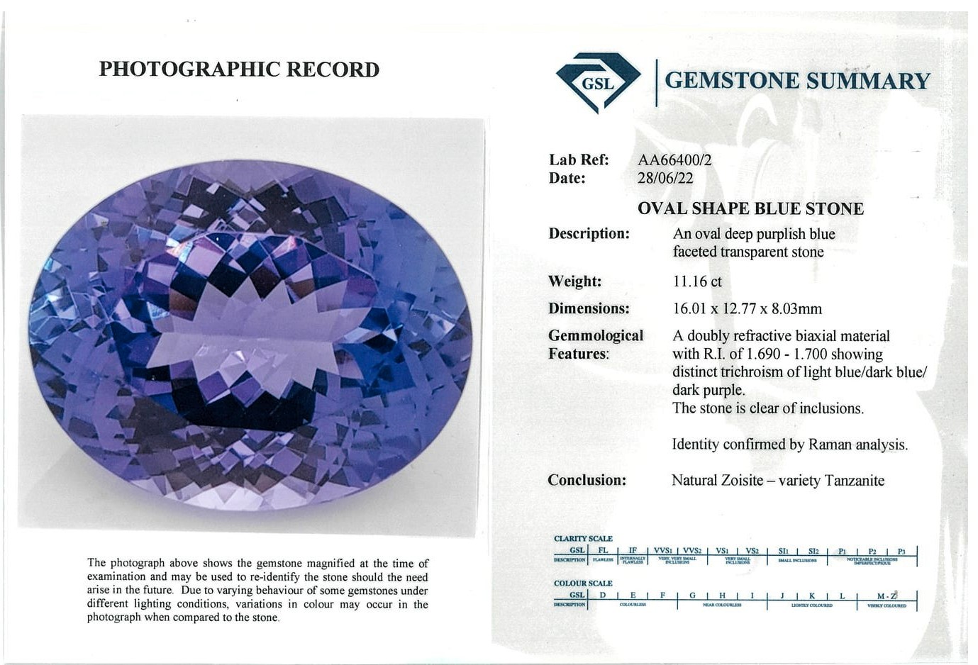 A loose oval shape Tanzanite of 11.16ct (With GSL report #AA66400/2). (As New)