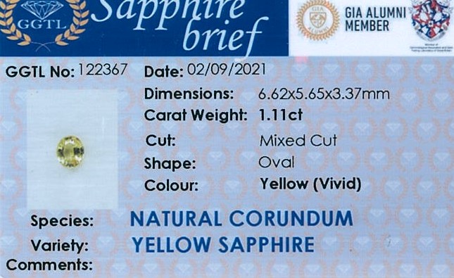 A loose oval Yellow Sapphire of 1.11ct. With GGTL Brief# 122367.