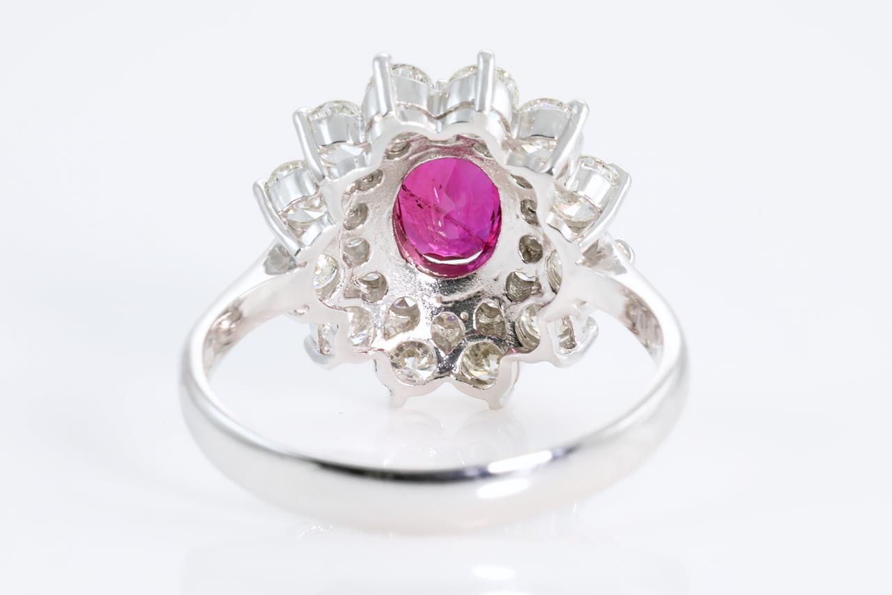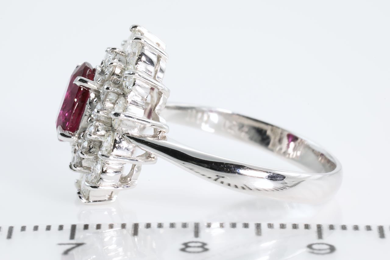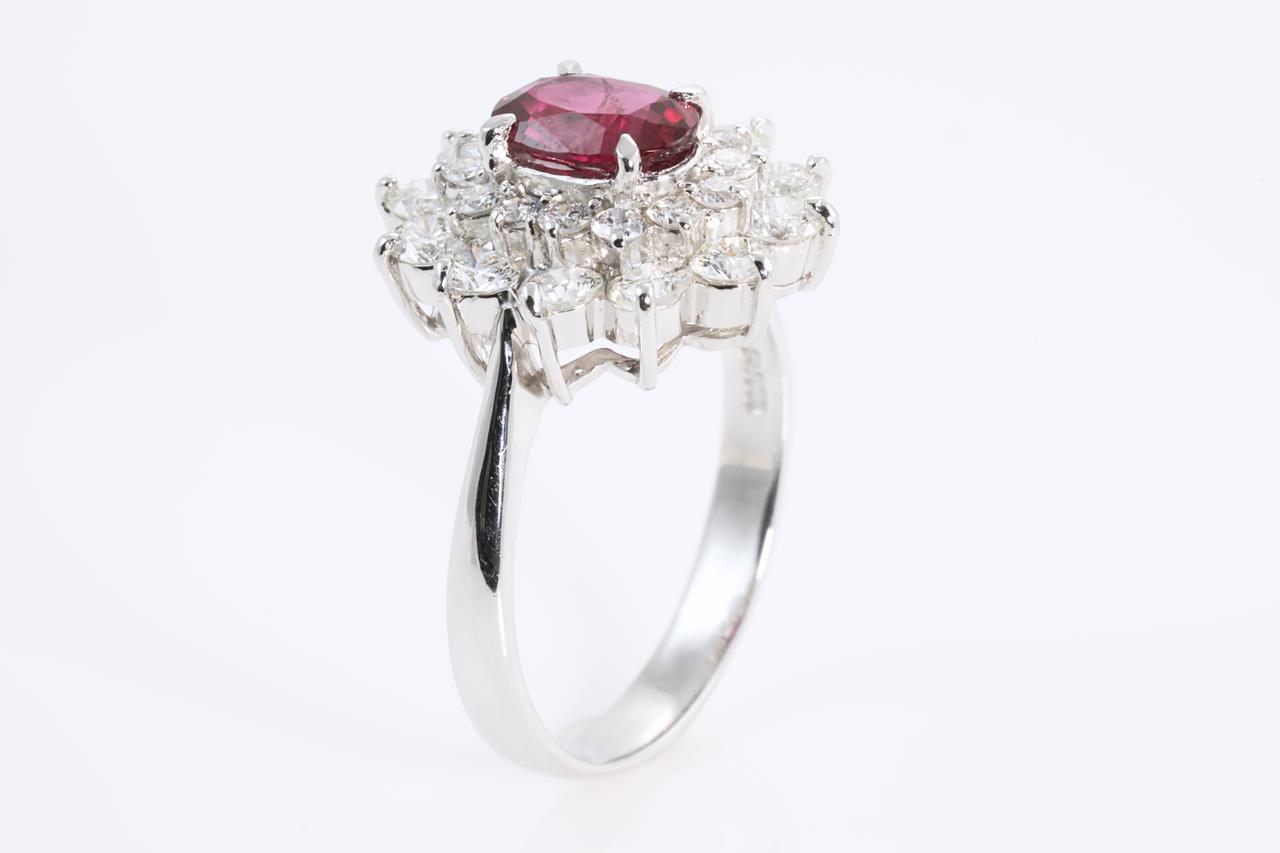 Ruby and Diamond ring with oval shape Ruby of 1.11ct and Diamonds totalling 1.24cts (Estimated grading: G-H SI). Platinum. Ring size L1/2. Weight: 5.7g (Pre-owned)