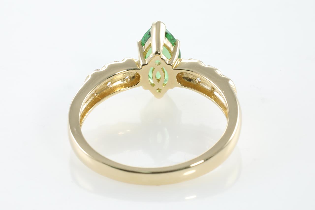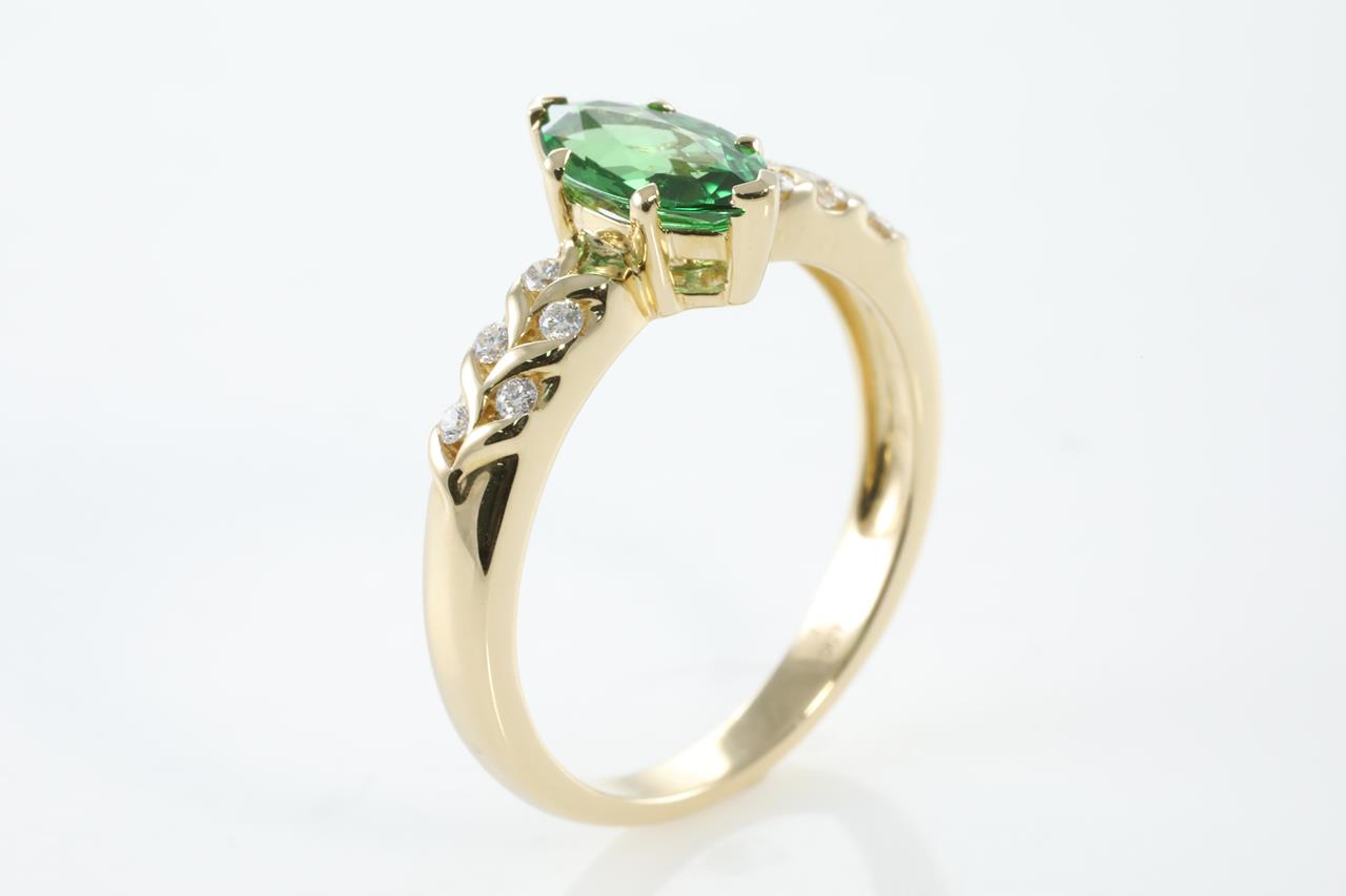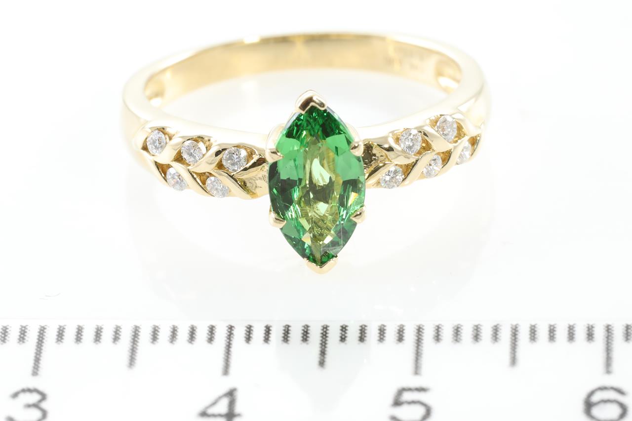 Tsavorite and Diamond Ring with marquise cut Tsavorite of 1.11ct and Diamonds totalling of 0.11cts. 14ct yellow gold. Ring size: N1/2 - can not be resized. Weight: 3.5g. (As new).
