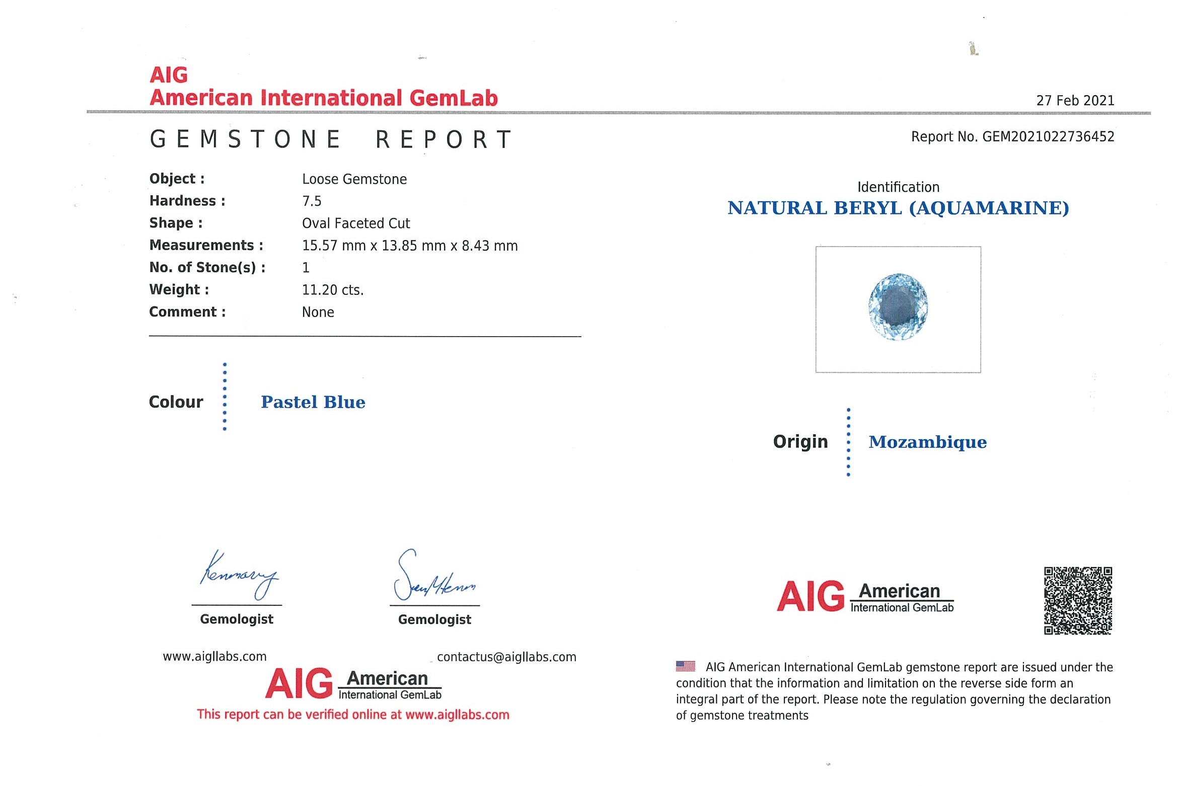 A loose oval shape Aquamarine of 11.20ct. With AIG report dated 27/02/2021. Origin: Mozambique. (As new)