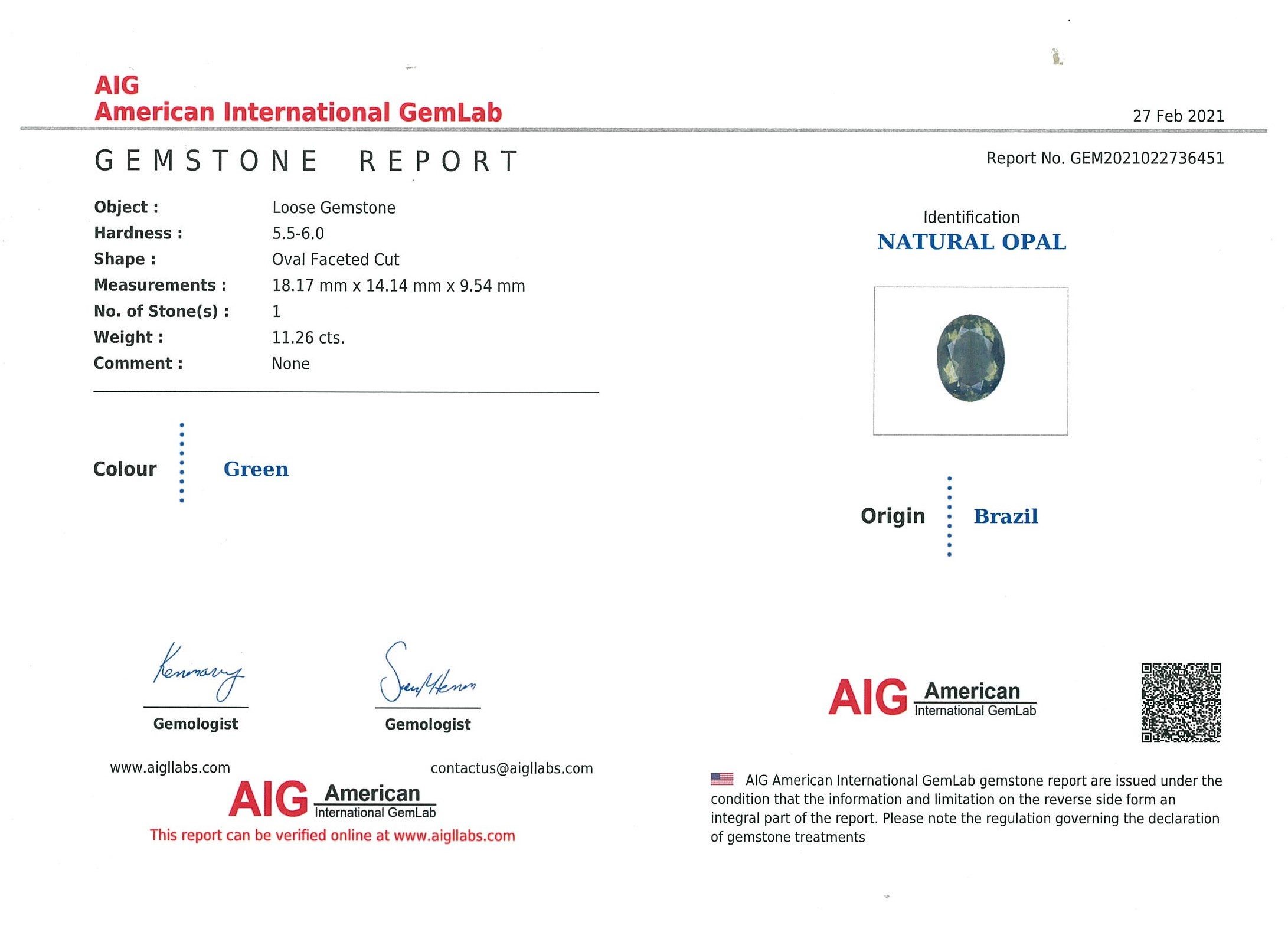 A loose oval Green Opal of 11.26ct. With AIG report dated 27/02/2021. Origin: Brazil. (As new)