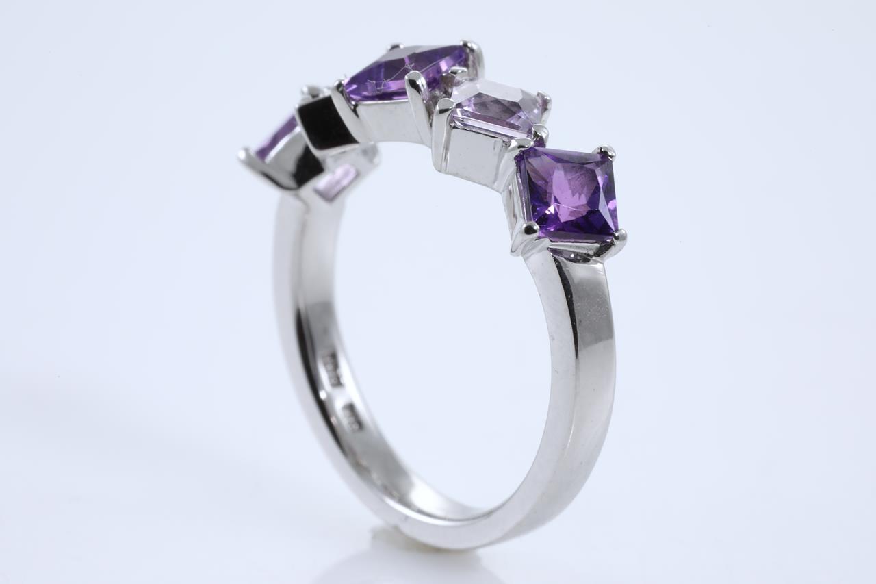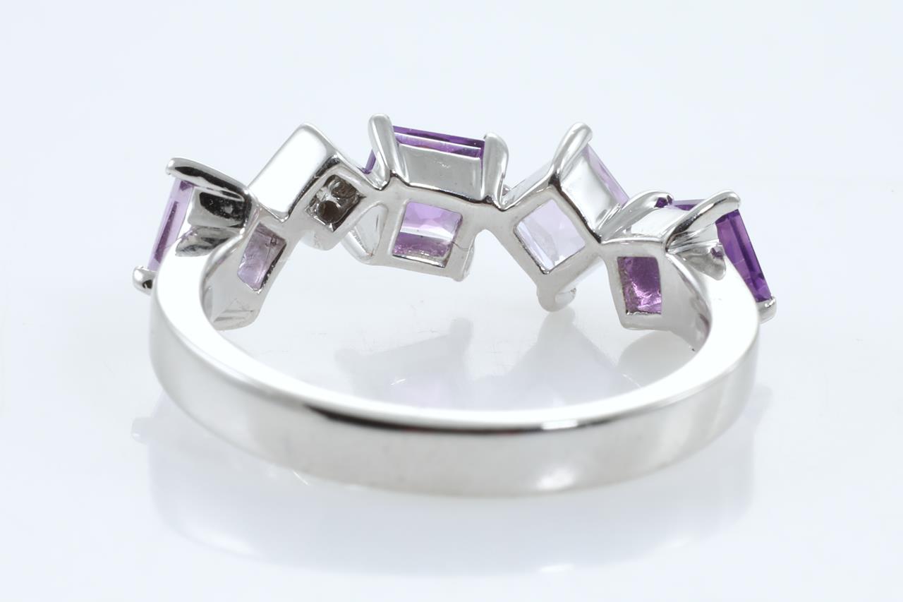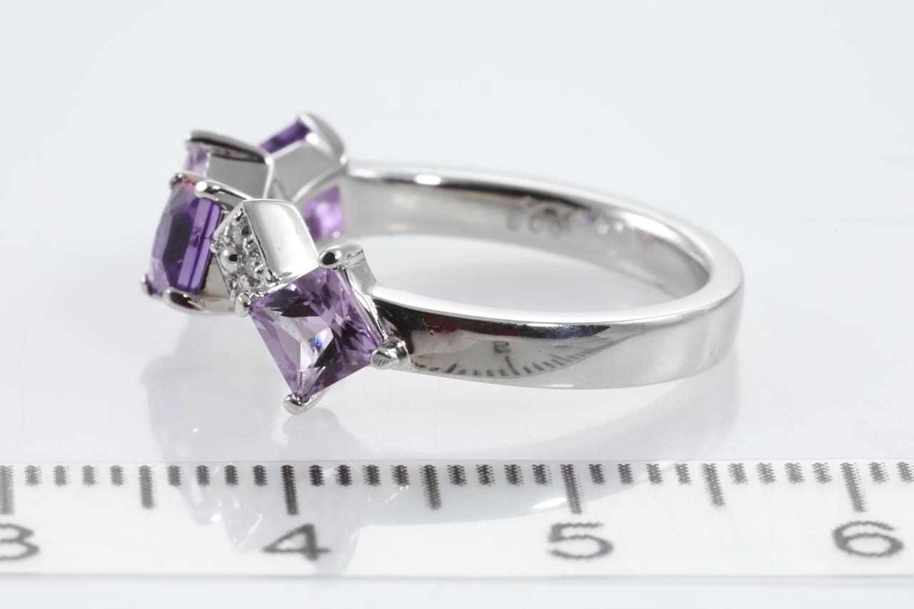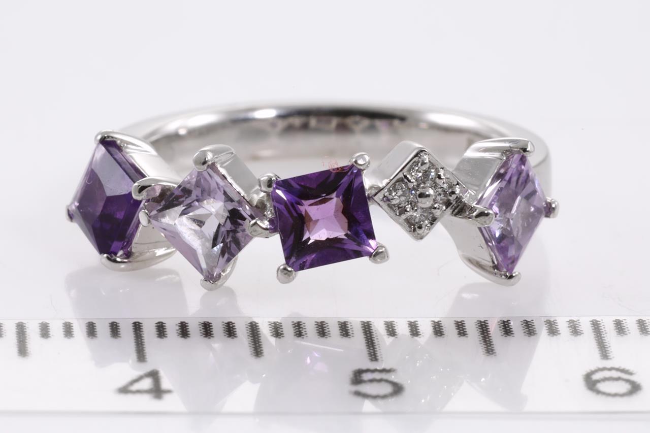 Amethyst and Diamond ring with Princess cut Amethysts totalling approximately 1.12cts and Diamonds totalling 0.03cts. 18ct white gold, ring size L1/2. Weight: 4.7g (Pre-owned)