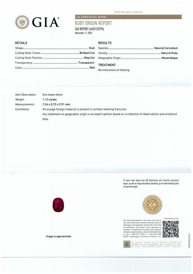 A loose unheated oval shape Mozambique Ruby of 1.12ct (with GIA Origin Report #6455133796). (As New)