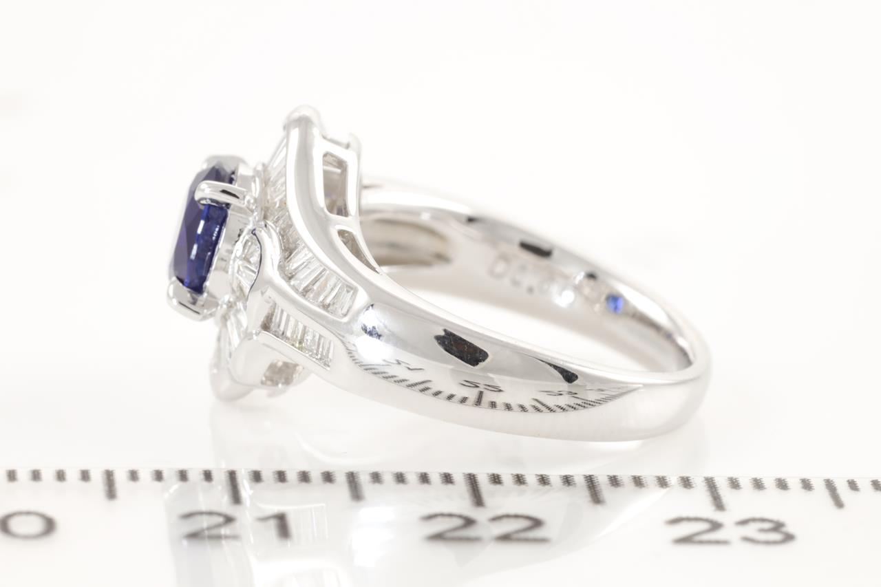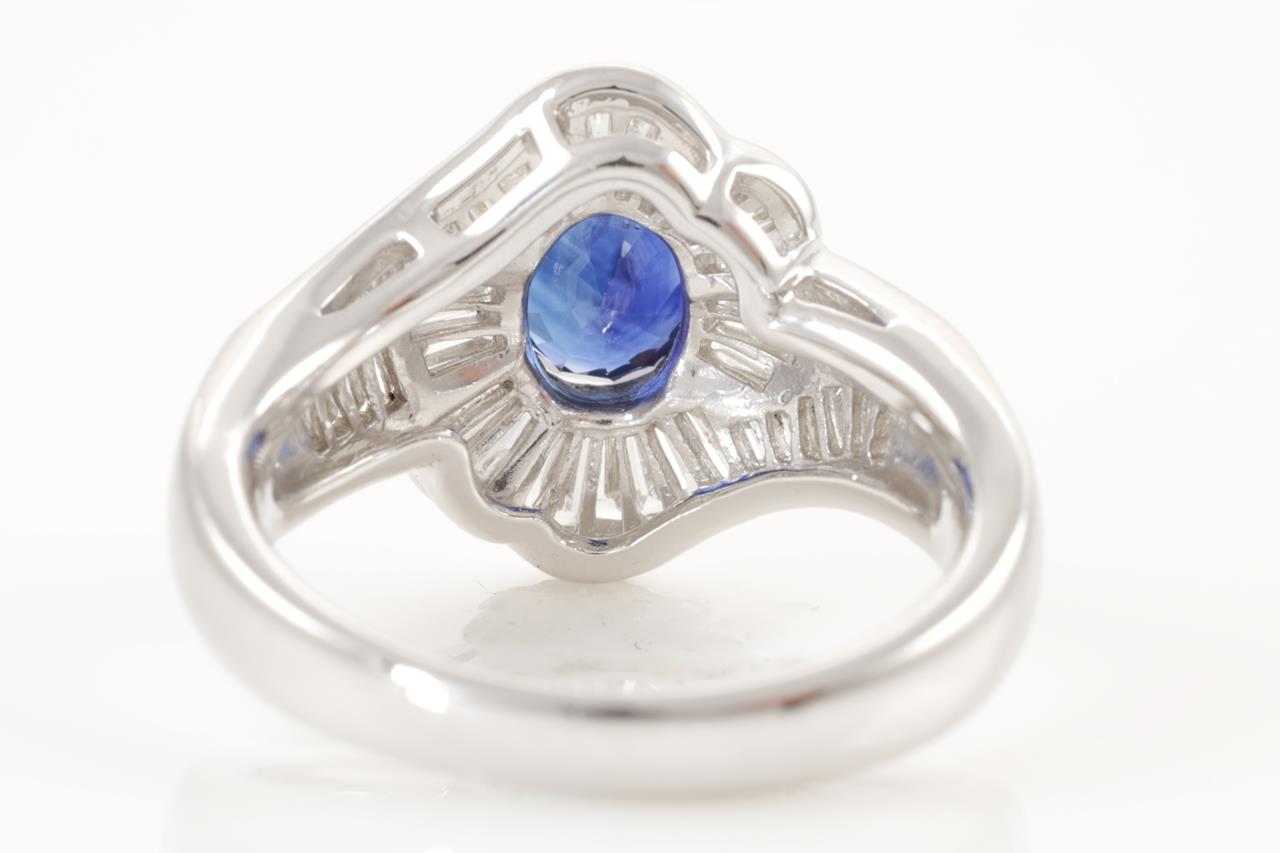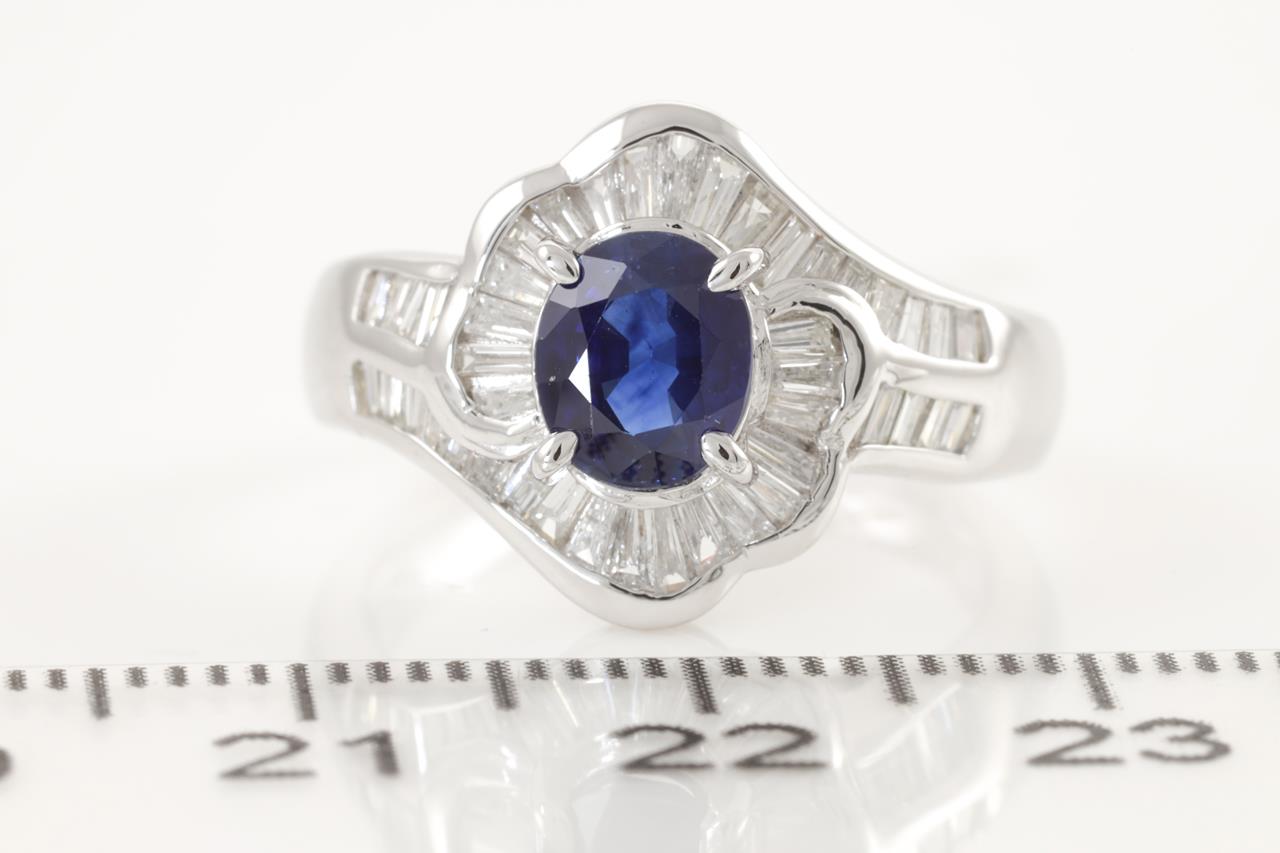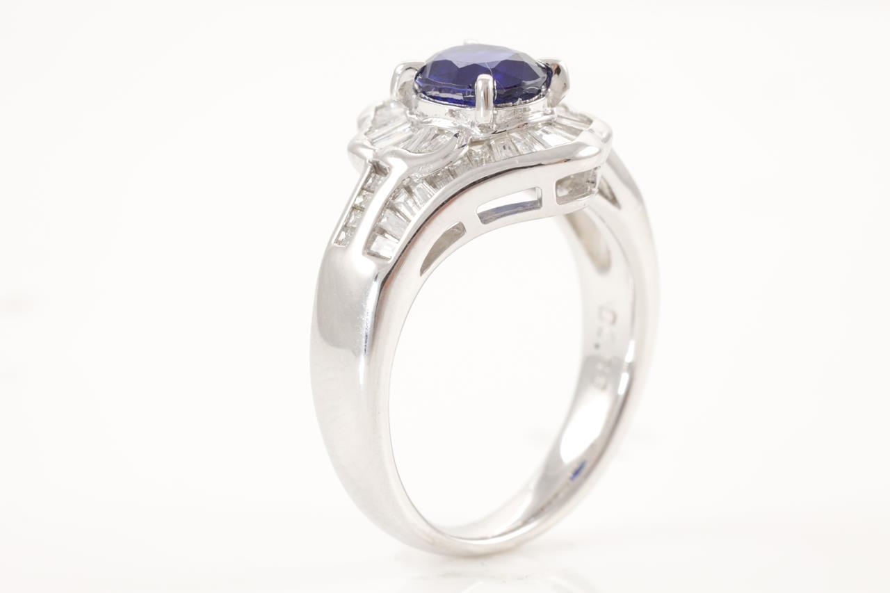 Sapphire and Diamond ring with an oval blue Sapphire of 1.12ct and baguette Diamonds totalling 0.66cts (Estimated grading: G P1). Platinum. Ring size K. Weight: 8.5g. (Pre-owned)