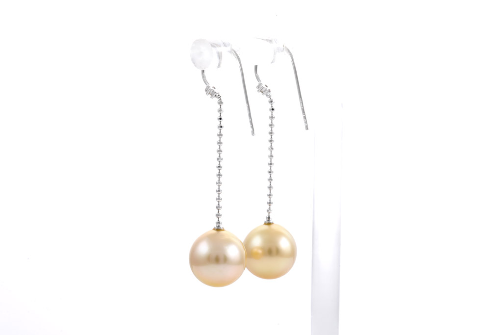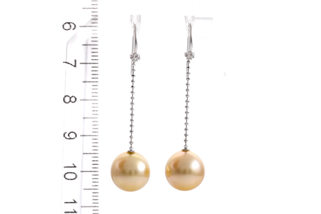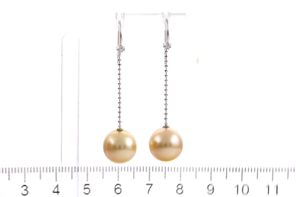 Pearl and Diamond shepherd hook drop earrings with Golden South Sea Pearls of 11.1mm - 11.2mm and Diamonds totalling 0.04cts. 18ct white gold. Weight: 5.0g. (Pre-owned)