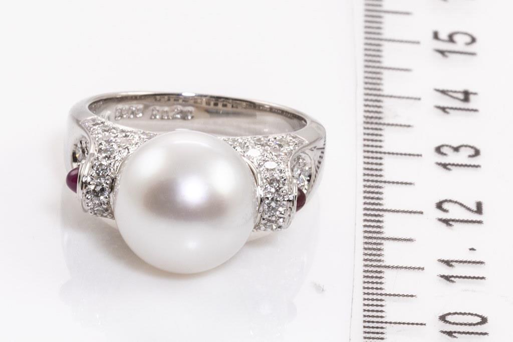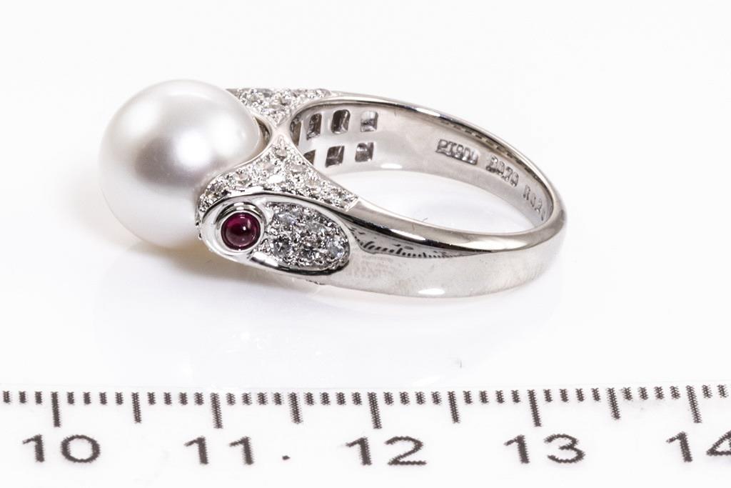 Pearl, Ruby and Diamond ring with a South Sea Pearl of 11.2mm, 2 cabochon cut Rubies totalling 0.20cts and round Diamonds totalling 0.70cts (Estimated grading: G-H VS-SI). Platinum. Ring size M1/2 - ring resizing is not recommended. Weight: 11.6g. (Pre-owned)