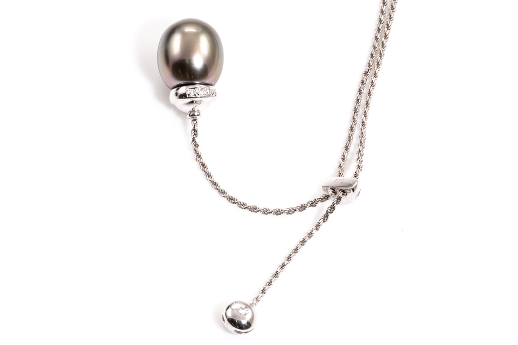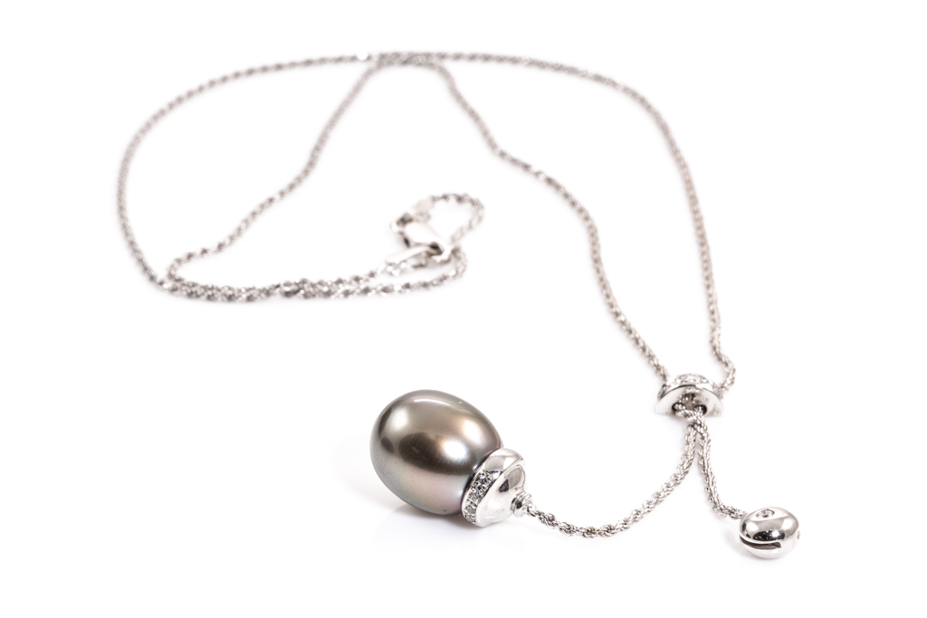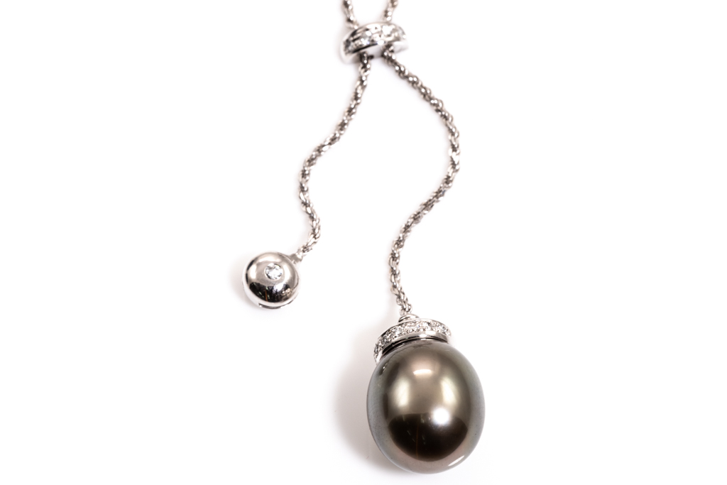 Pearl and Diamond pendant with drop shape Tahitian Pearl of 11.2mm and round Diamonds totalling 0.12cts. 18ct white gold with 18ct white gold 42cm chain. Weight: 7.9g. (Pre-owned)